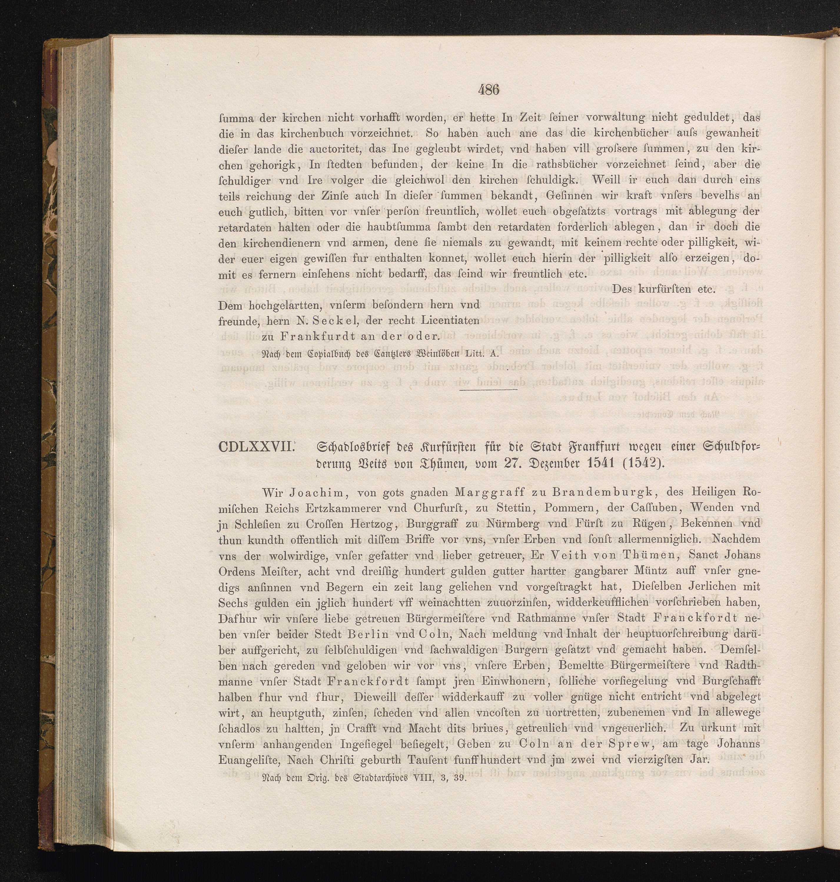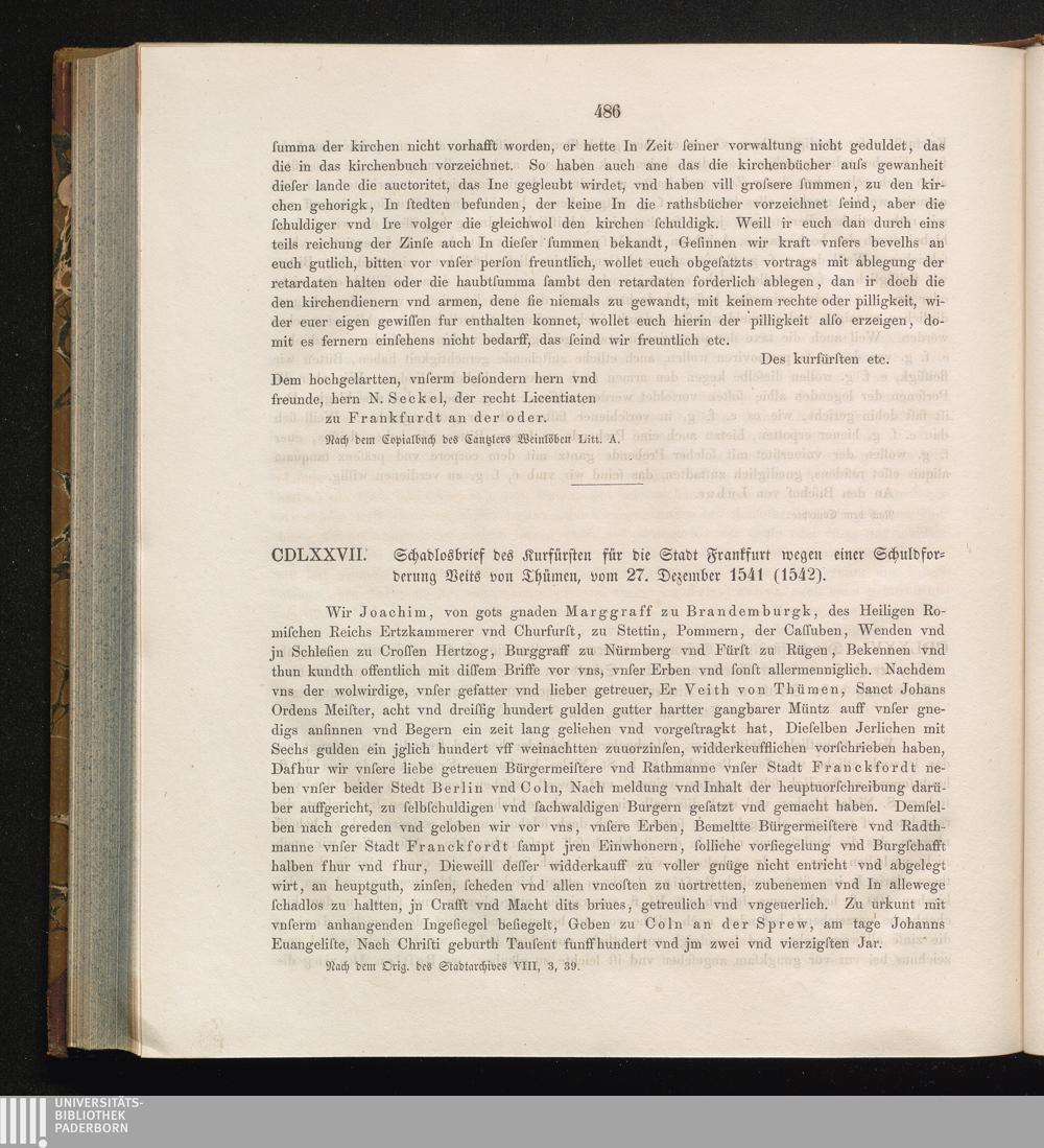 CDLXXVII. Schadlosbrief des Kurfürsten für die Stadt Frankfurt wegen einer Schuldforderung[...]
