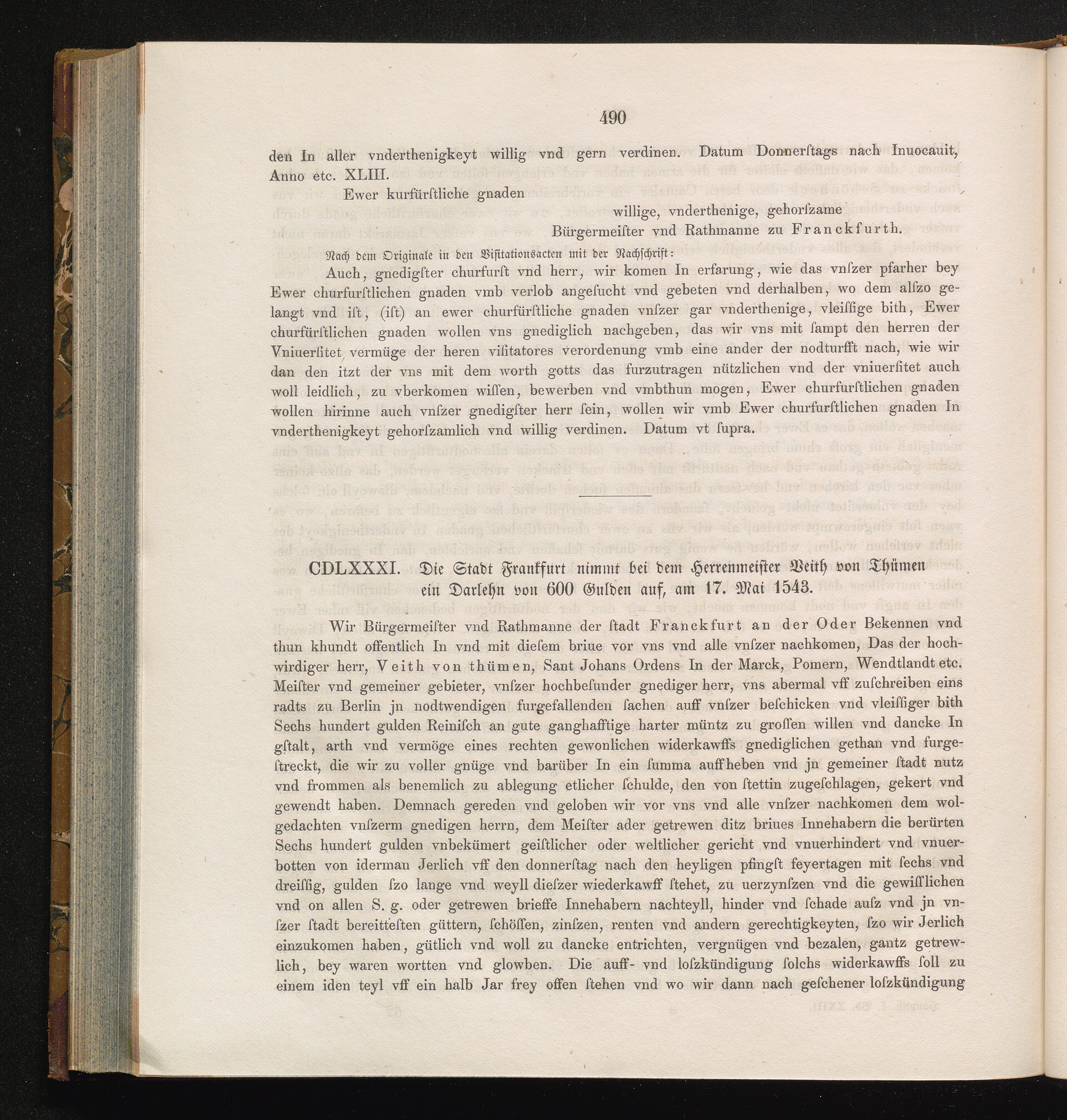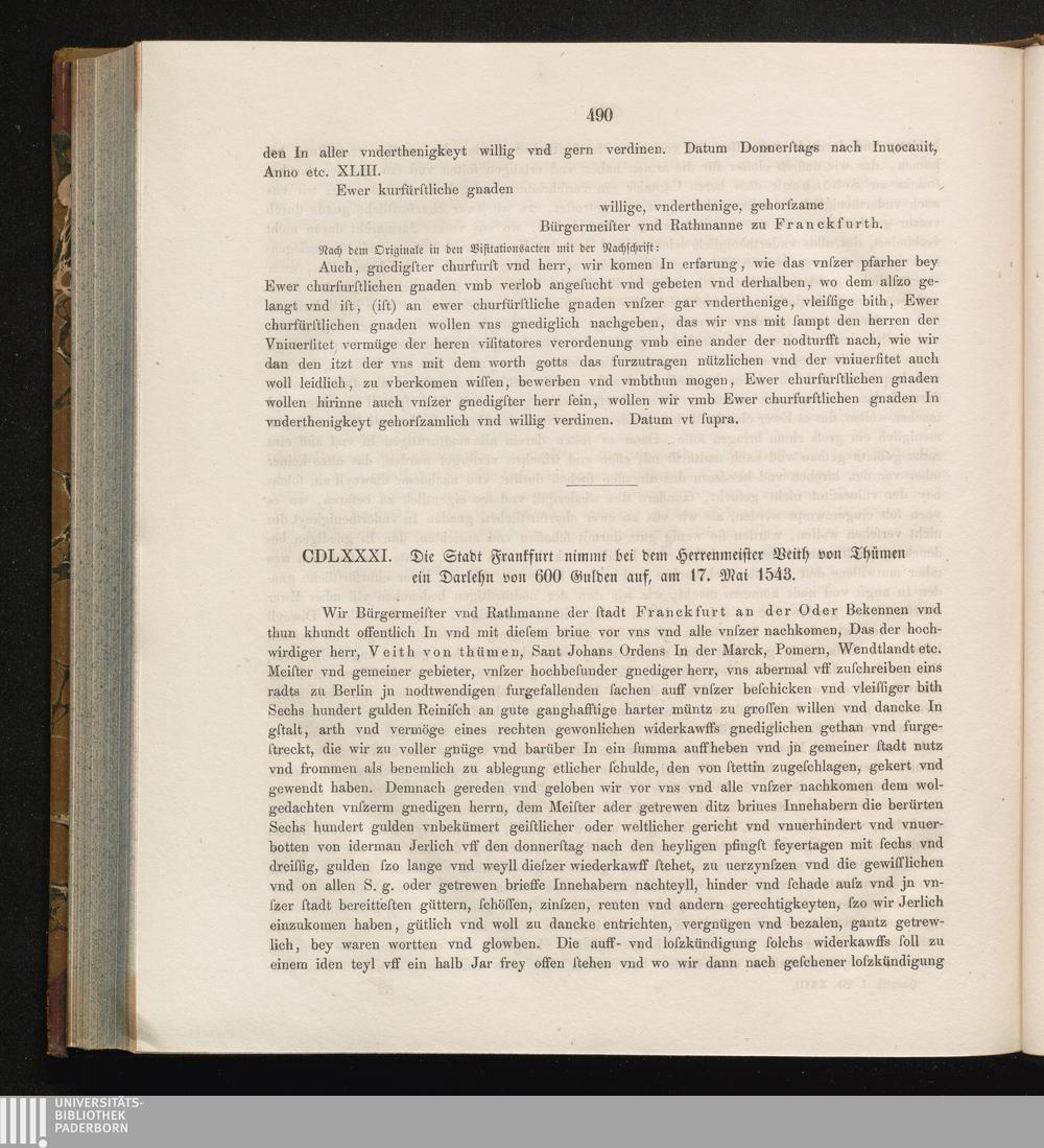 CDLXXXI. Die Stadt Frankfurt nimmt bei dem Herrenmeister Veith von Thümen ein Darlehn[...]