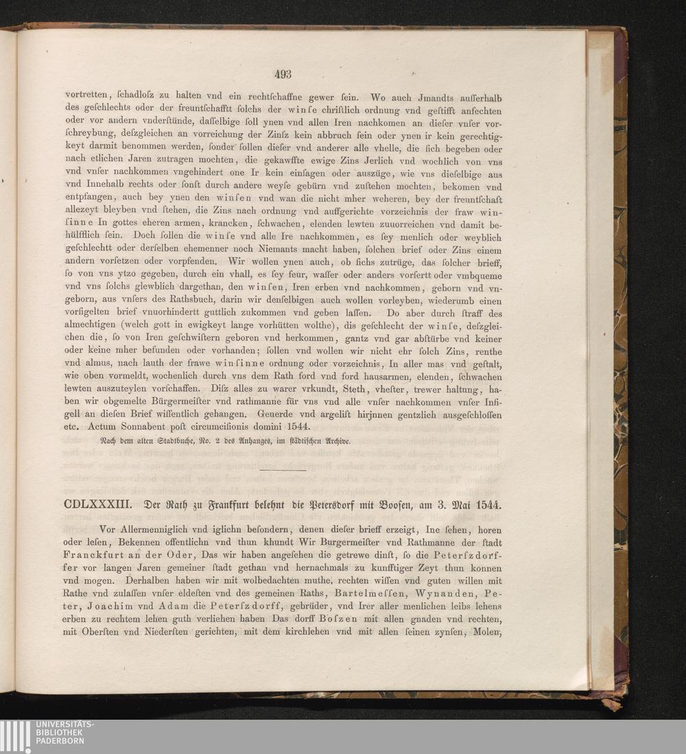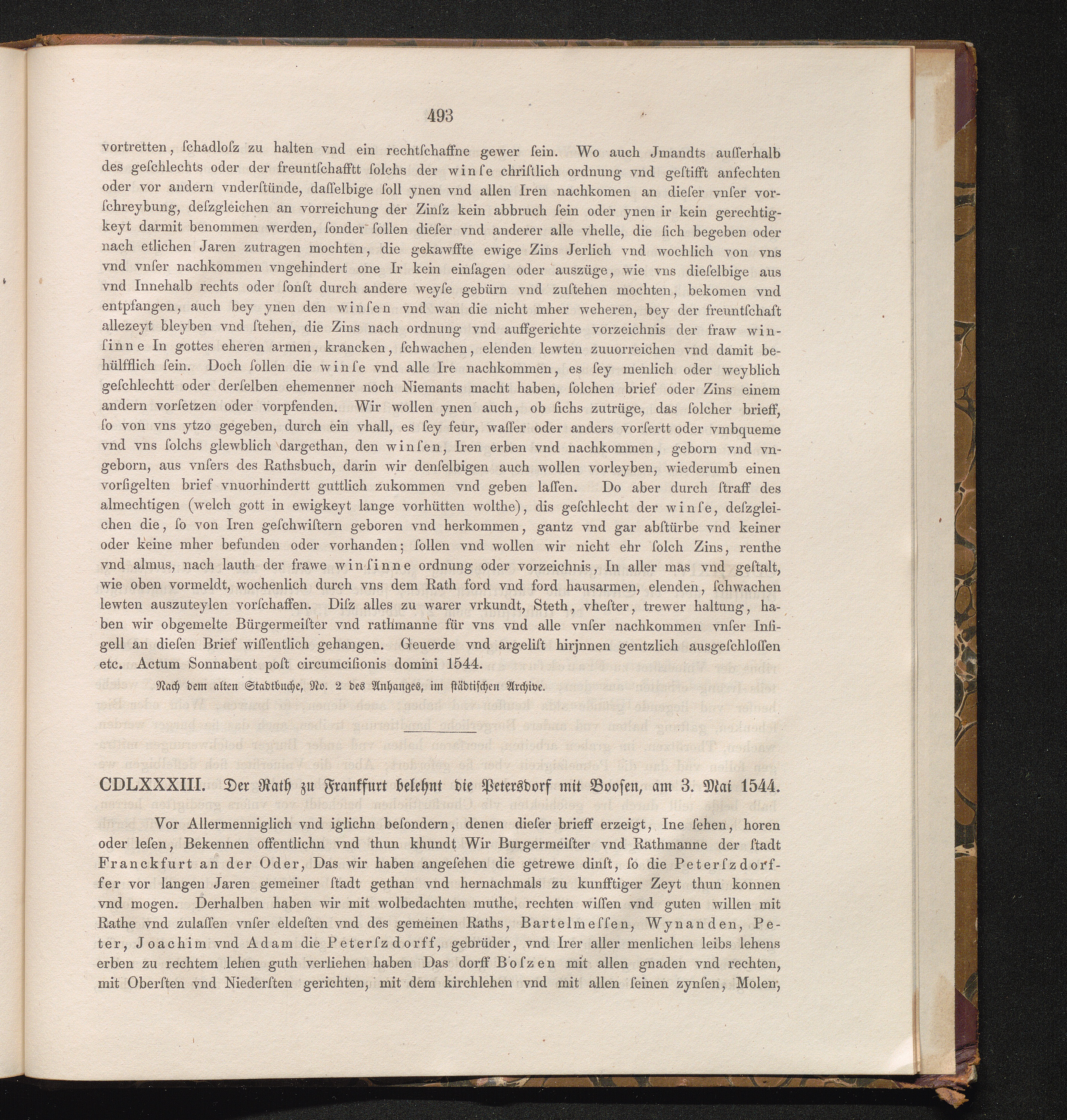 CDLXXXIII. Der Rath zu Frankfurt belehnt die Petersdorf mit Boosen, am 3. Mai 15[...]