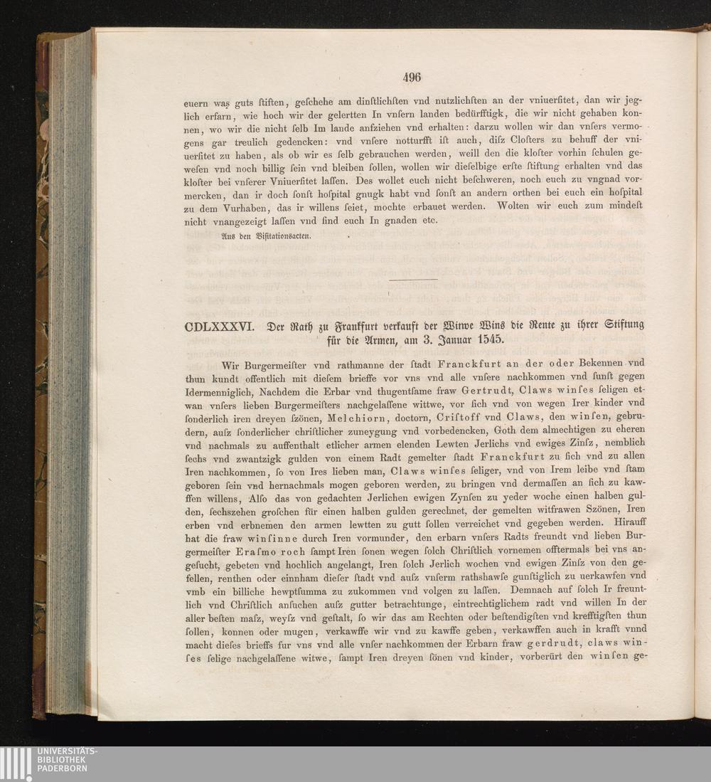 CDLXXXVI. Der Rath zu Frankfurt verkauft der Witwe Wins die Rente zu ihrer Stiftung[...]