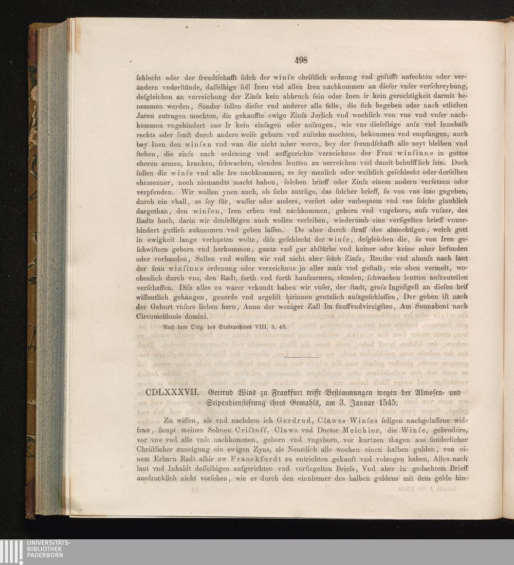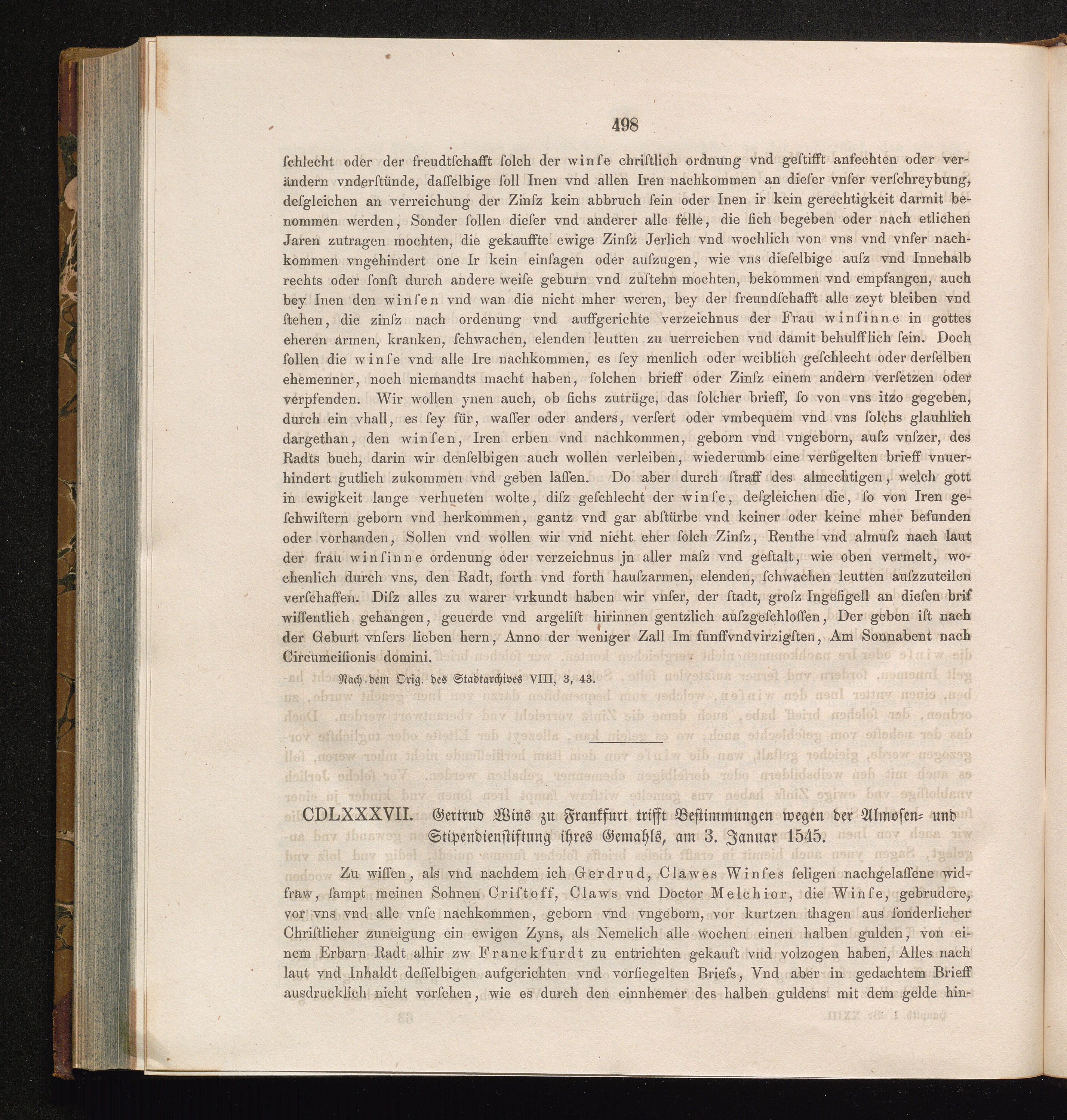 CDLXXXVII. Gertrud Wins zu Frankfurt trifft Bestimmungen wegen der Almosen- und Stipendienstiftung[...]
