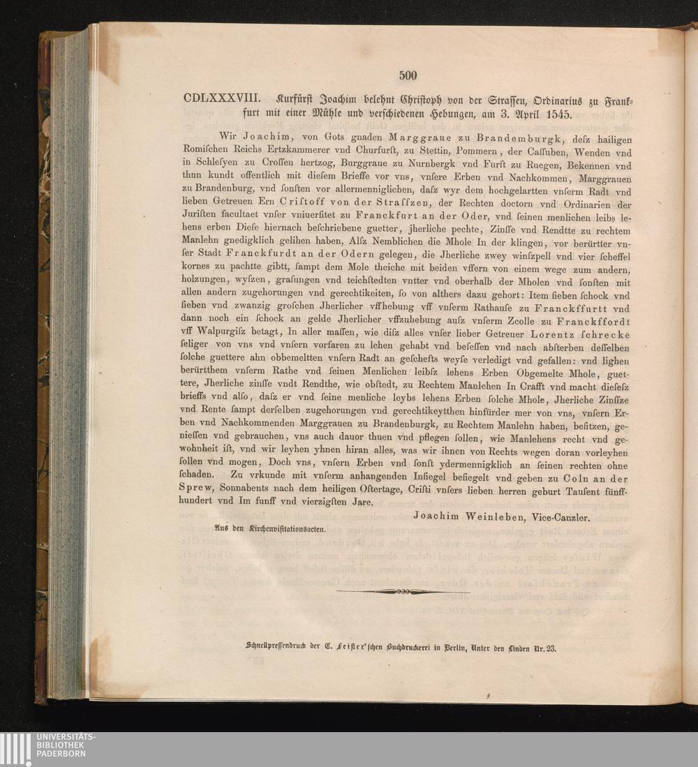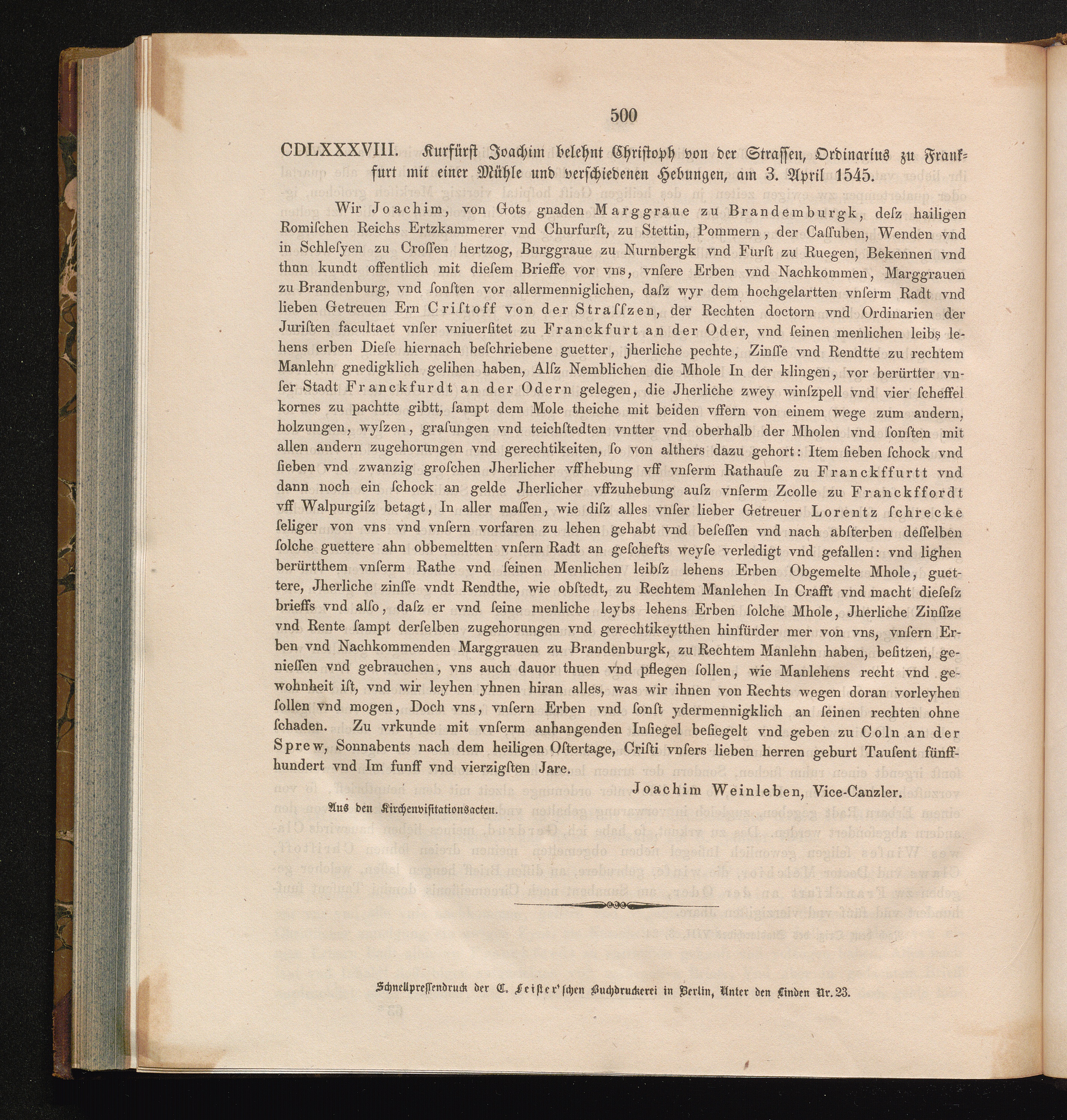 CDLXXXVIII. Kurfürst Joachim belehnt Christoph von der Strassen, Ordinarius zu Frankfurt[...]