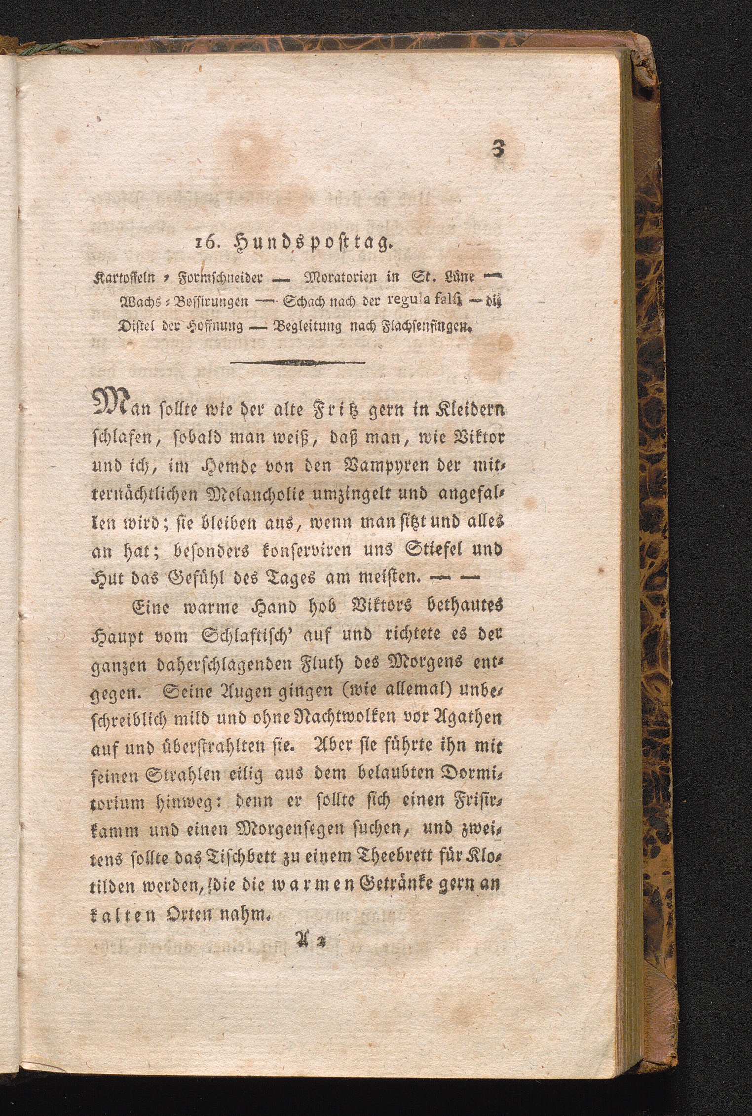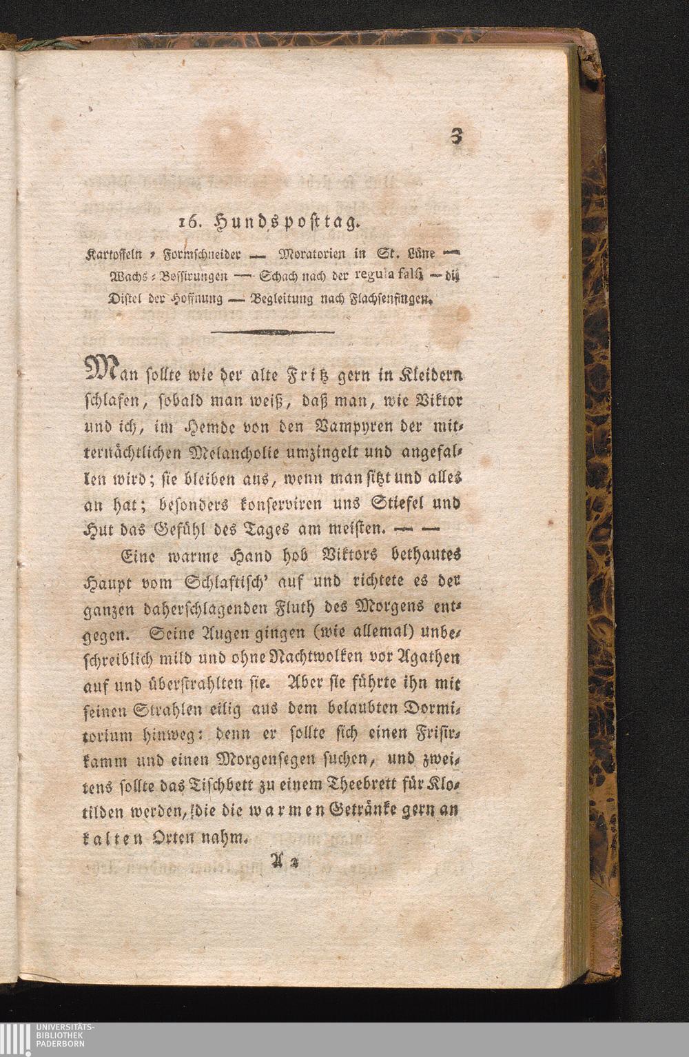 16. [i.e. 19.] Hundsposttag. Der Friseur, der nicht lungen-, sondern singsüchtig ist - Klotilde in Viktors Traum - Extrazeilen über die Kirchenmusik - Gartenconcert von Stamiz - Zank zwischen Viktor und Flamin - Das Herz ohne Trost - Brief an Emanuel.