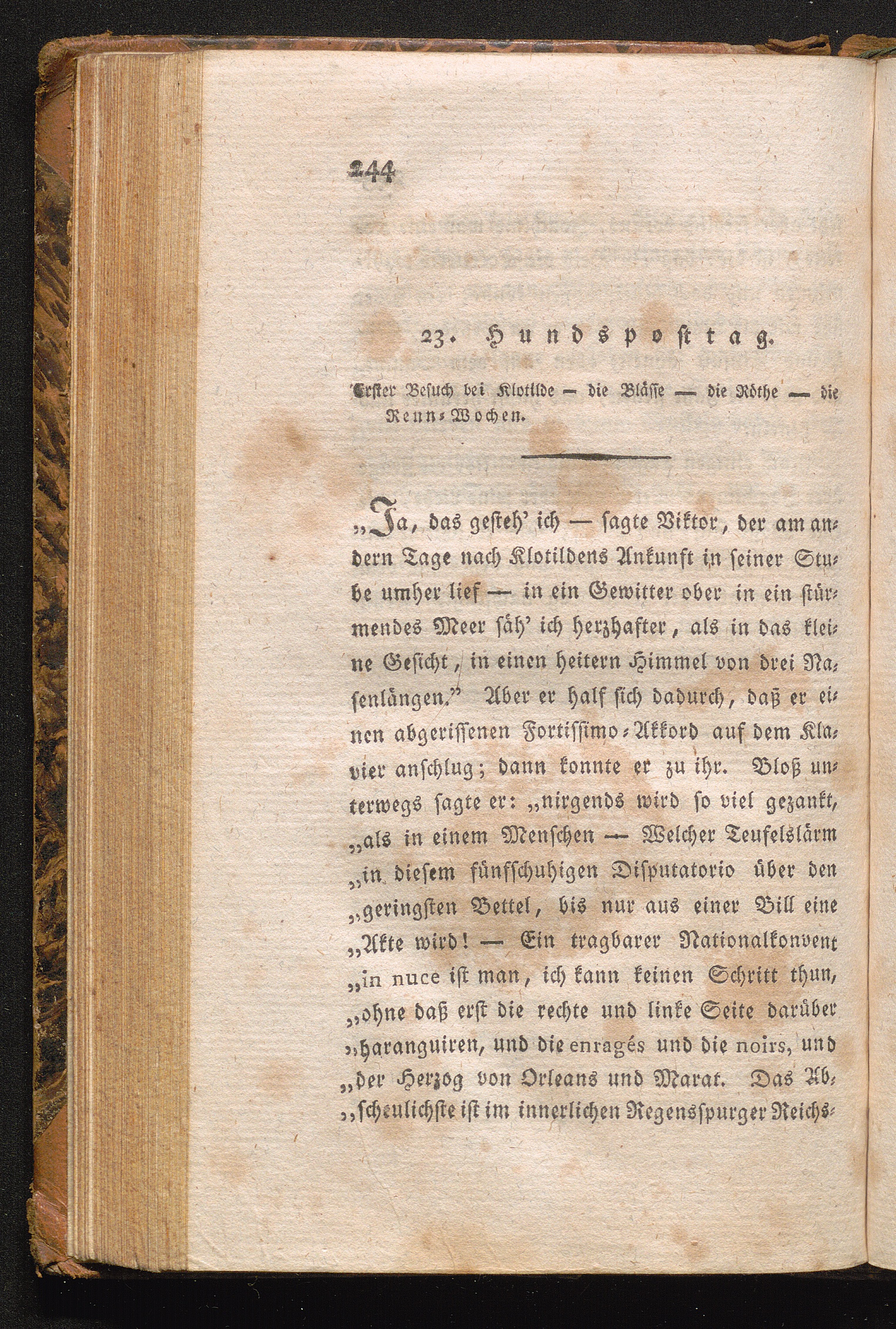 16. [i.e. 19.] Hundsposttag. Der Friseur, der nicht lungen-, sondern singsüchtig ist - Klotilde in Viktors Traum - Extrazeilen über die Kirchenmusik - Gartenconcert von Stamiz - Zank zwischen Viktor und Flamin - Das Herz ohne Trost - Brief an Emanuel.