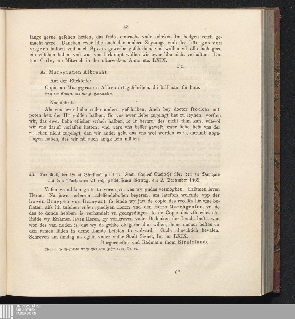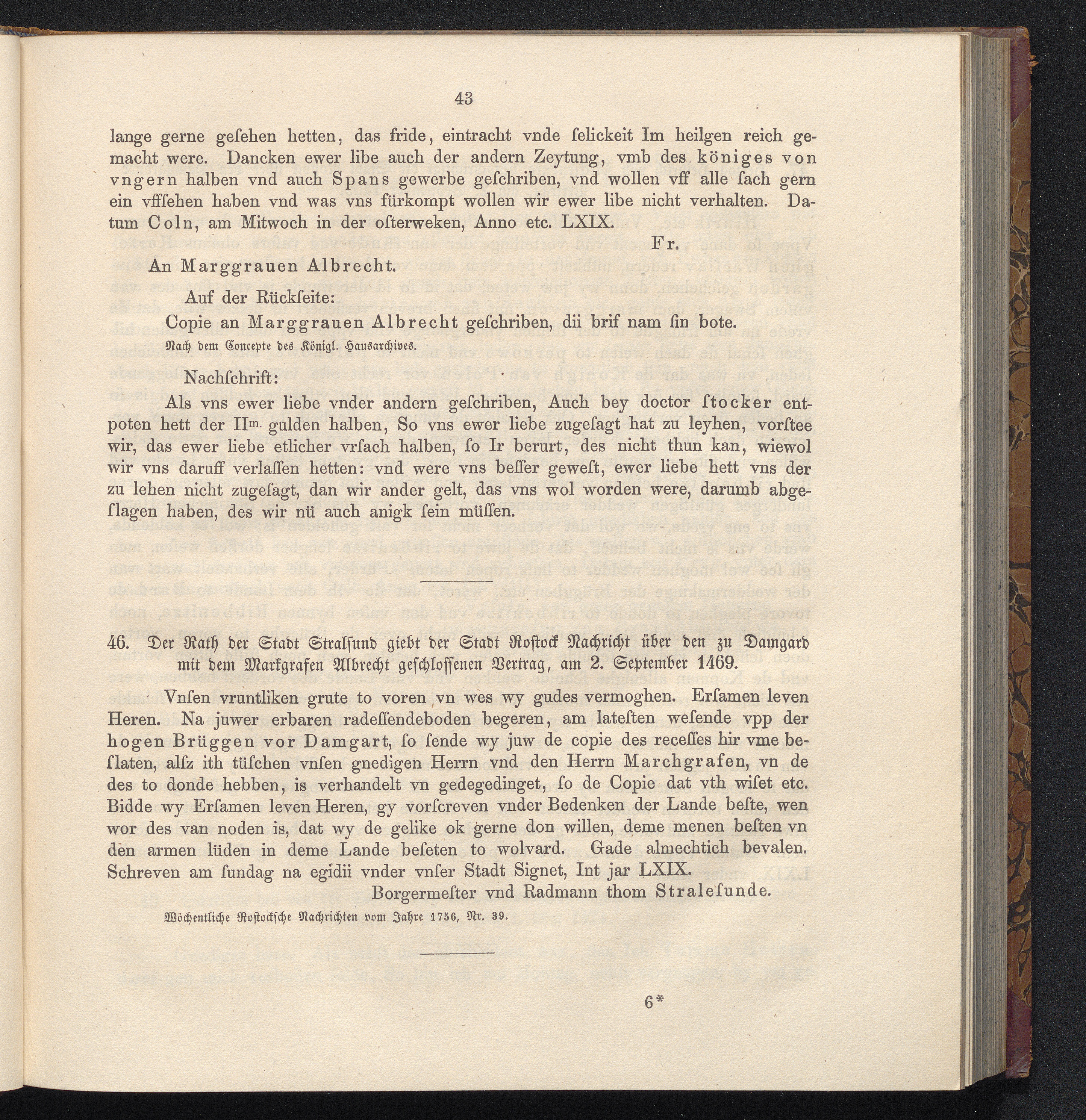 46. Der Rath der Stadt Stralsund giebt der Stadt Rostock Nachricht über den zu Damgard[...]