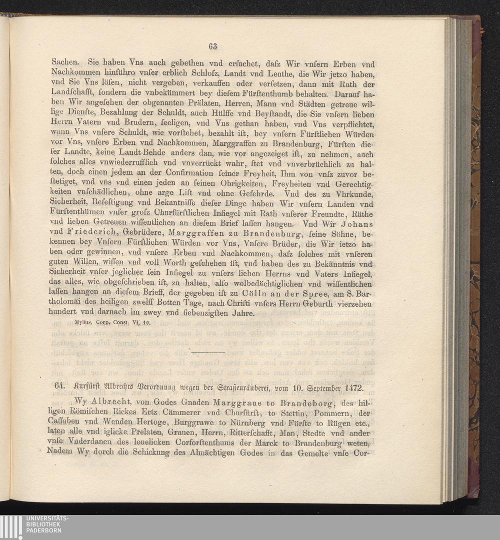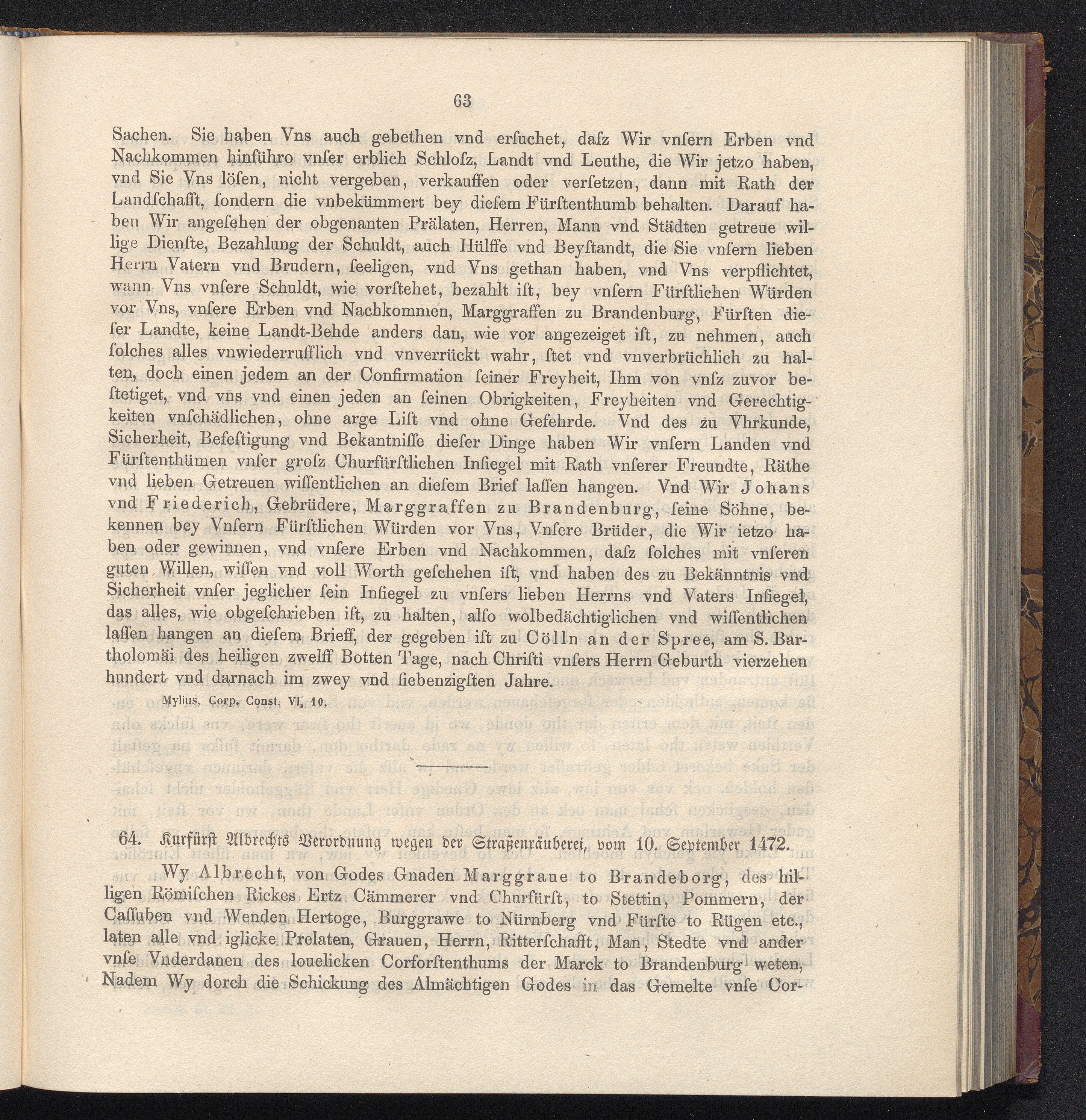 64. Kurfürst Albrechts Verordnung wegen der Straßenräuberei, vom 10. September 1[...]