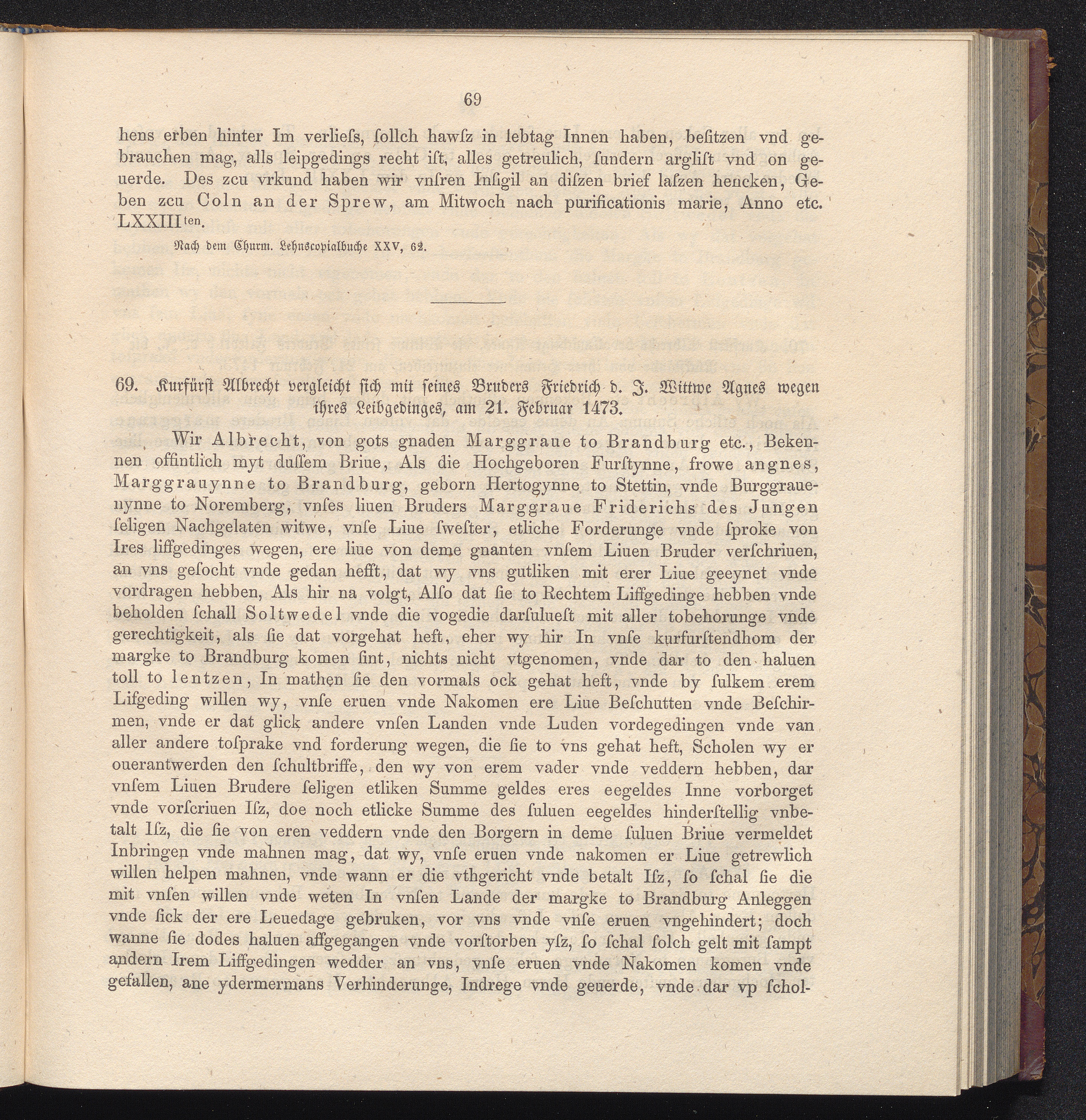 69. Kurfürst Albrecht vergleicht sich mit seines Buders Friedrich d. J. Wittwe Agnes[...]