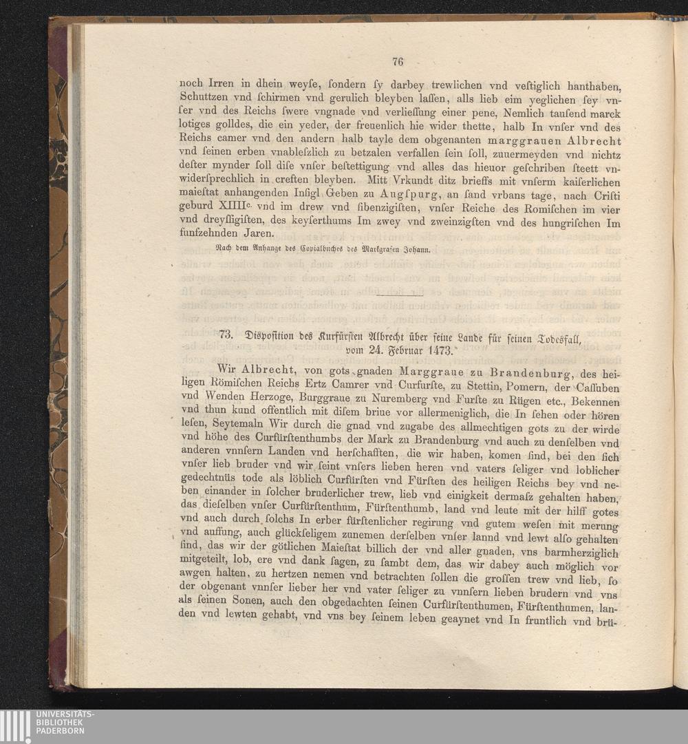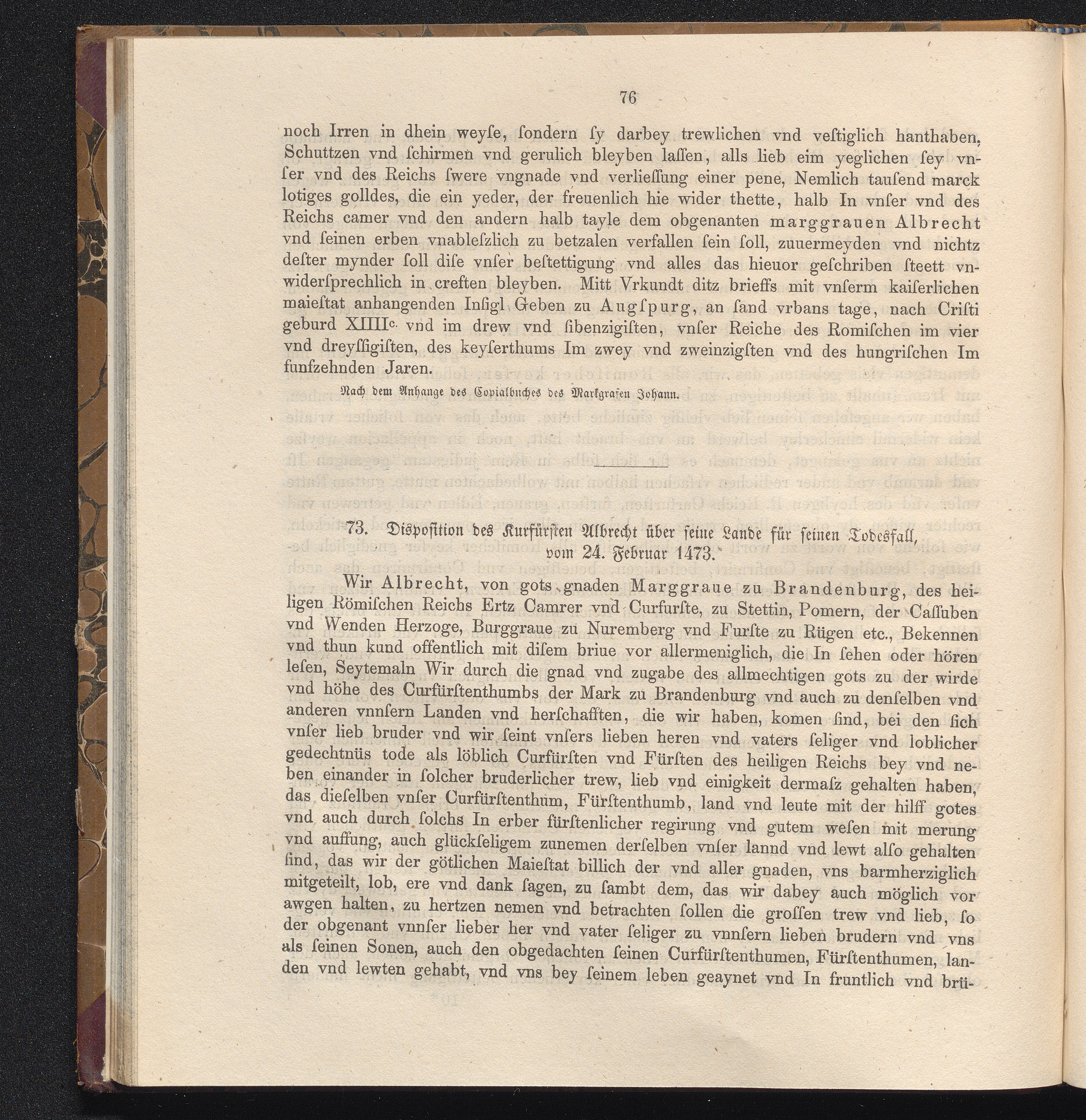 73. Disposition des Kurfürsten Albrecht über seine Lande für seinen Todesfall, vom[...]