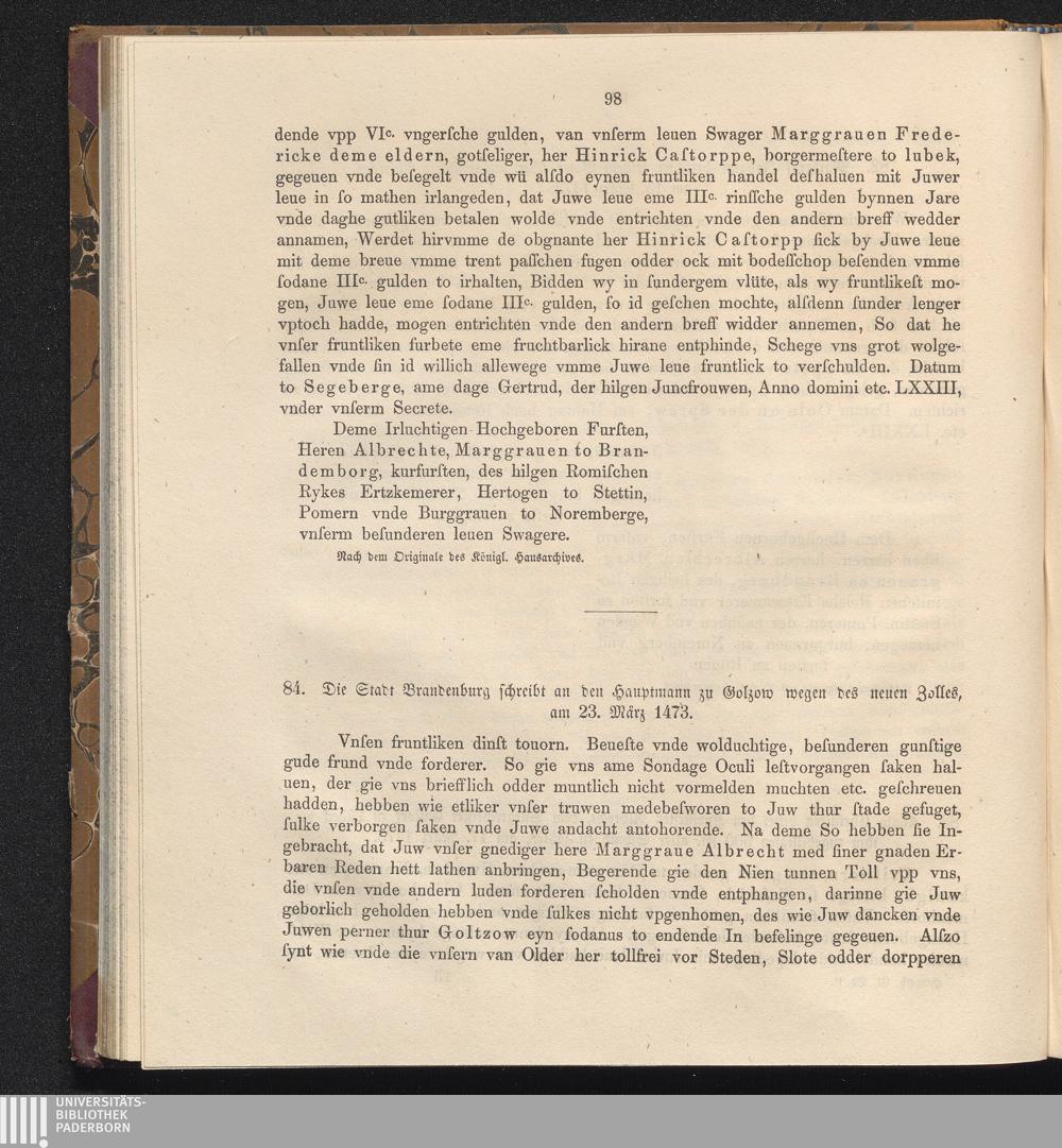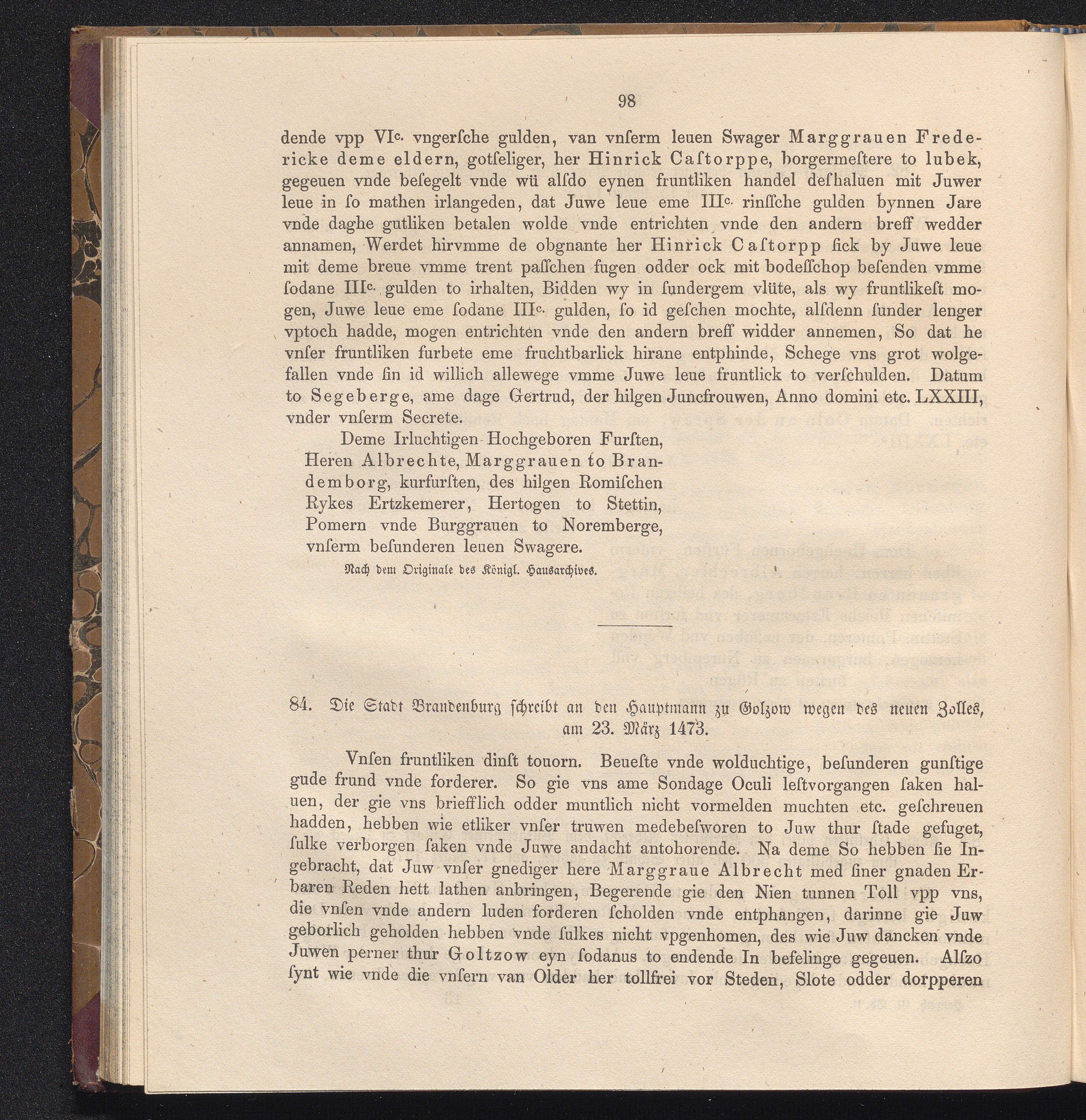 84. Die Stadt Brandenburg schreibt an den Hauptmann zu Golzow wegen des neuen Zolles,[...]
