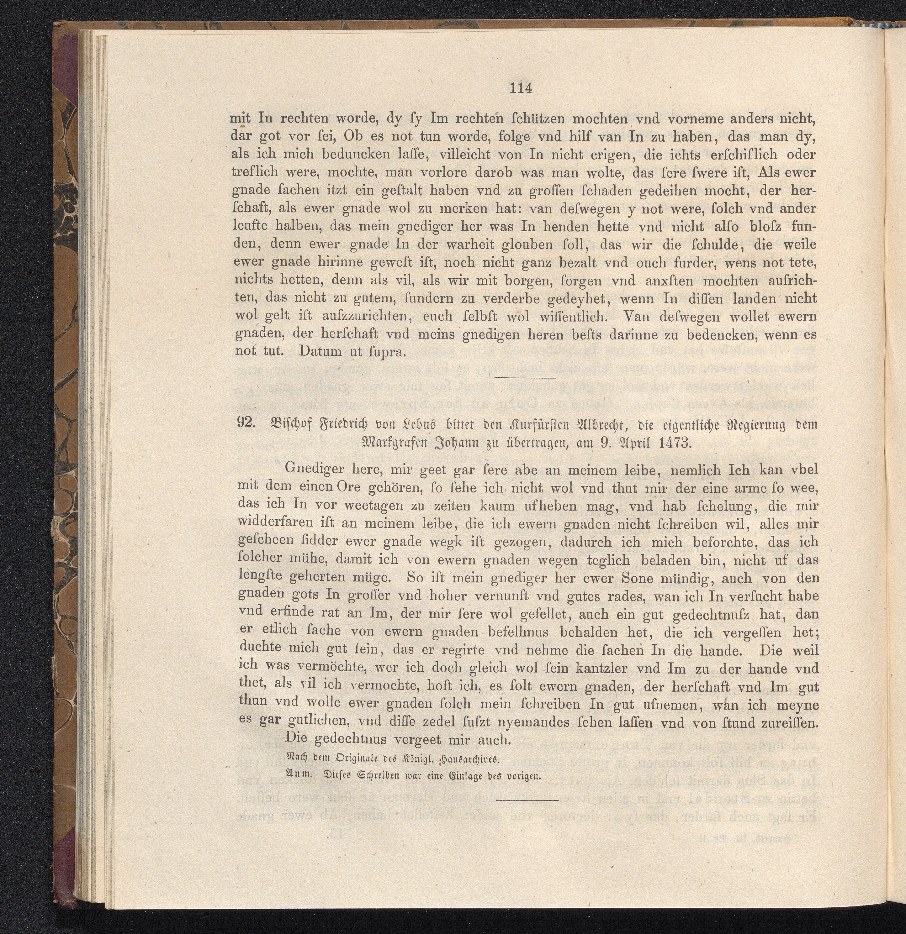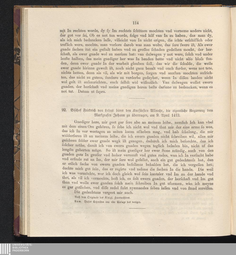 92. Bischof Friedrich von Lebus bittet den Kurfürsten Albrecht, die eigentliche Regierung[...]