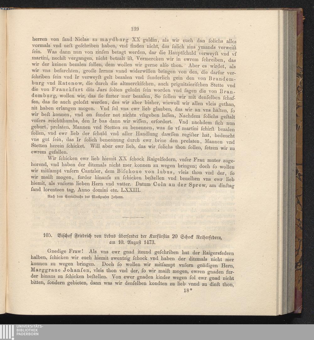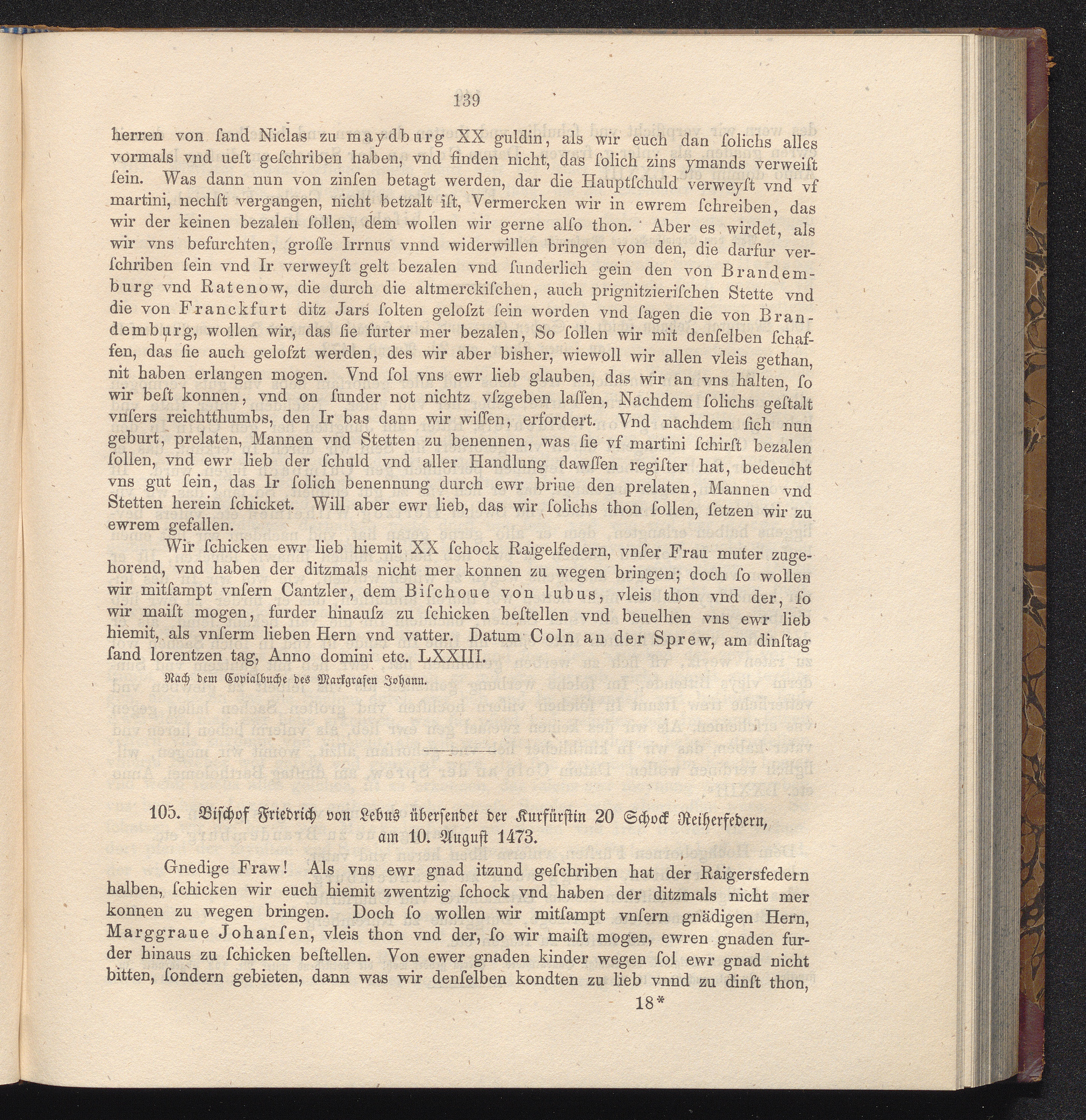 105. Bischof Friedrich von Lebus übersendet der Kurfürstin 20 Schock Reiherfedern,[...]