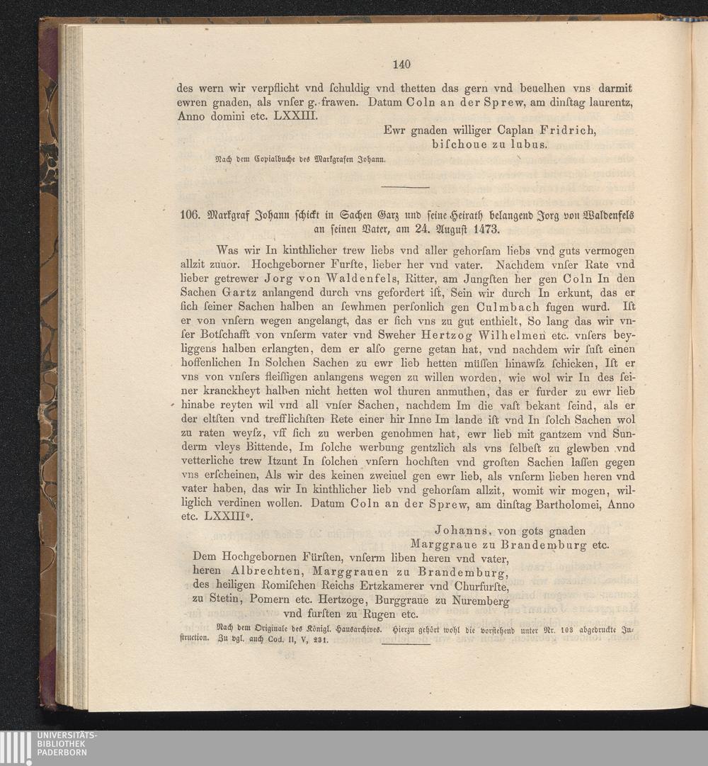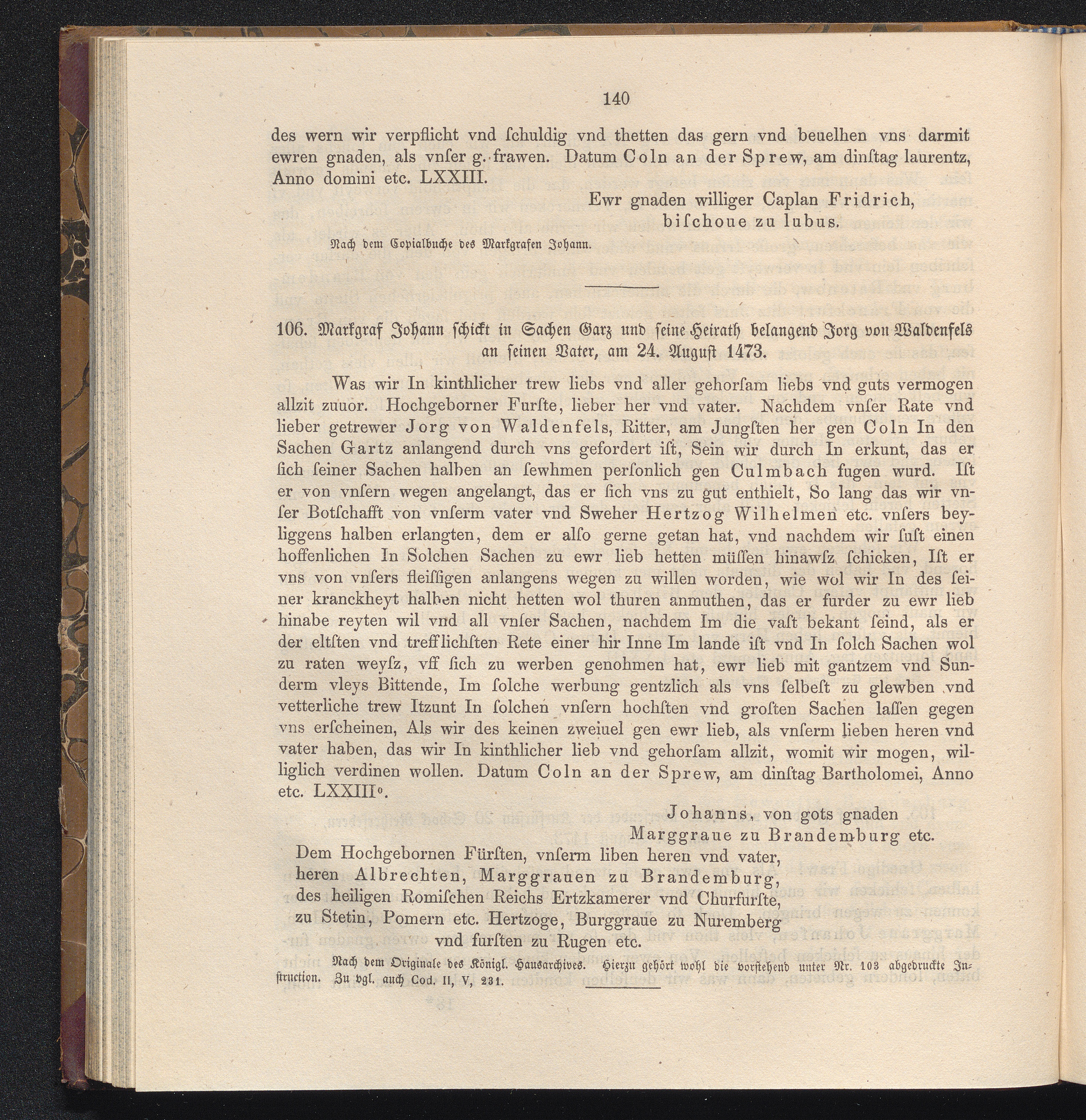 106. Markgraf Johann schickt in Sachen Garz und seine Heirath belangend Jorg von[...]
