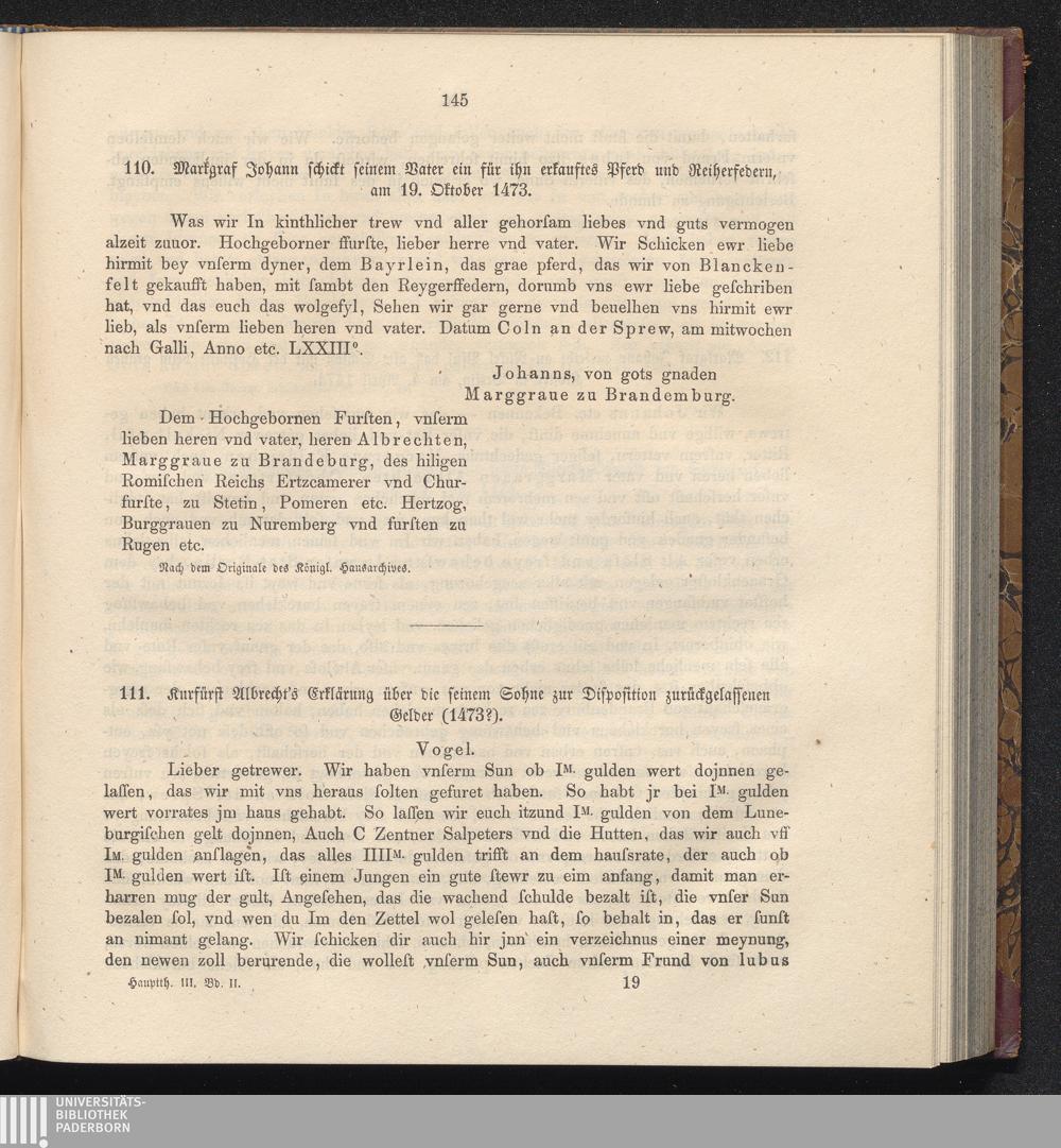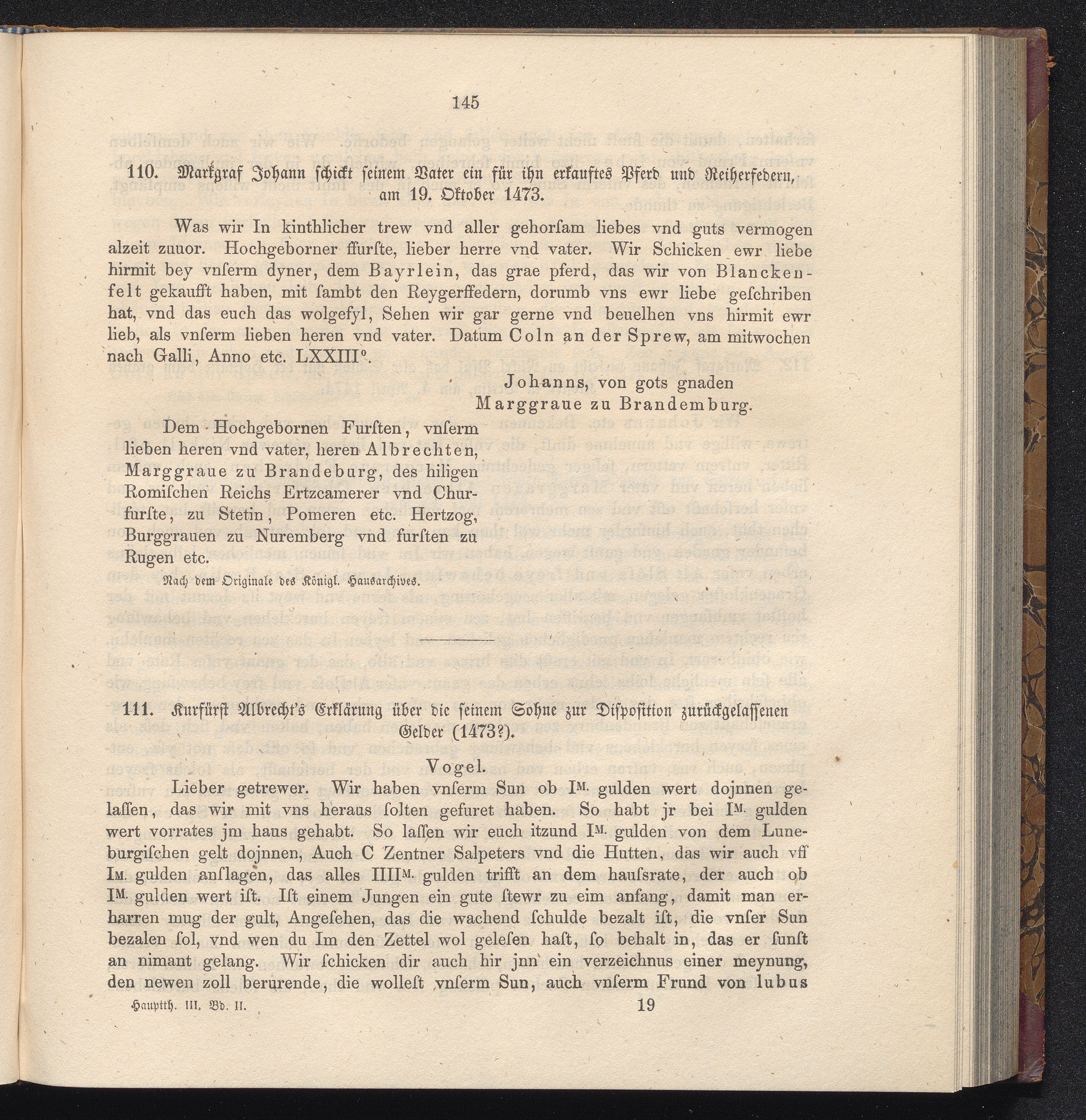 110. Markgraf Johann schickt seinem Vater ein für ihn erkauftes Pferd und Reiherfedern,[...]