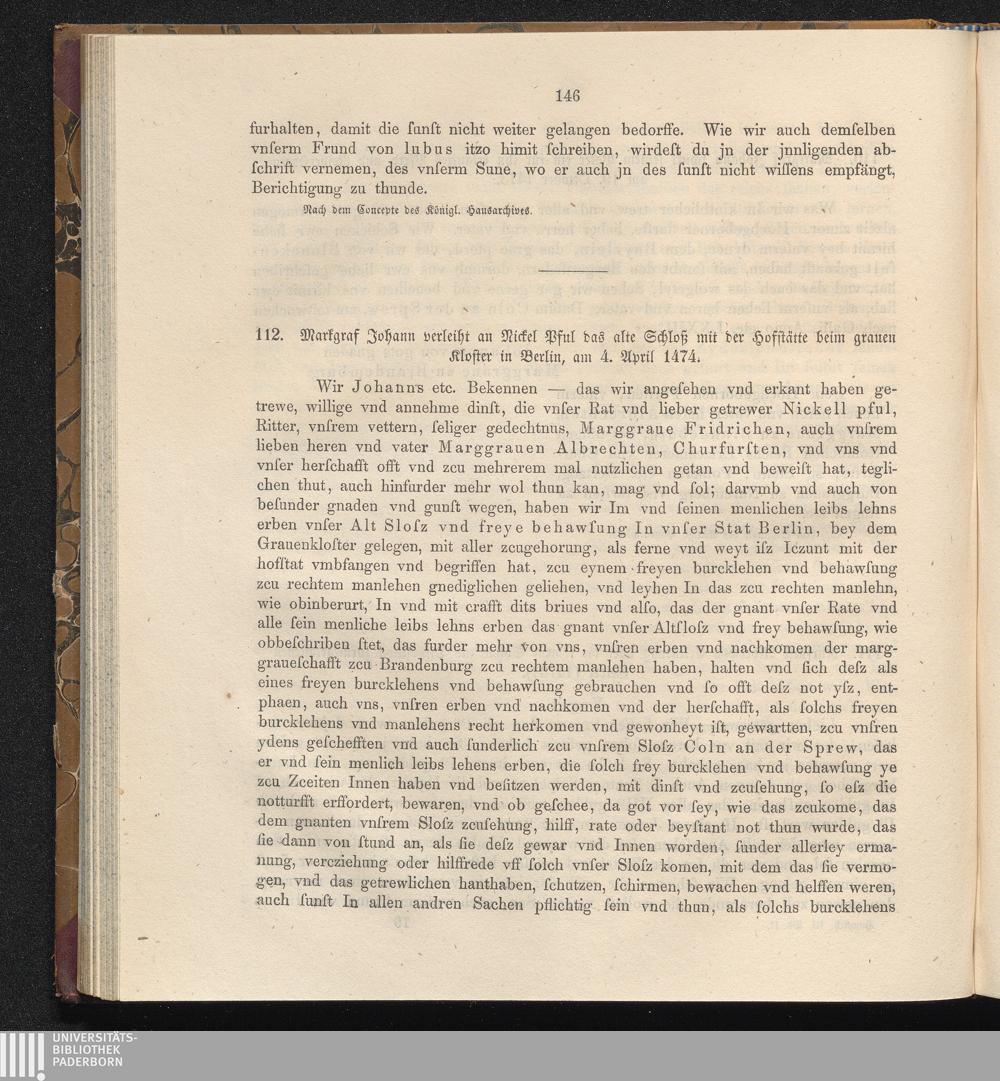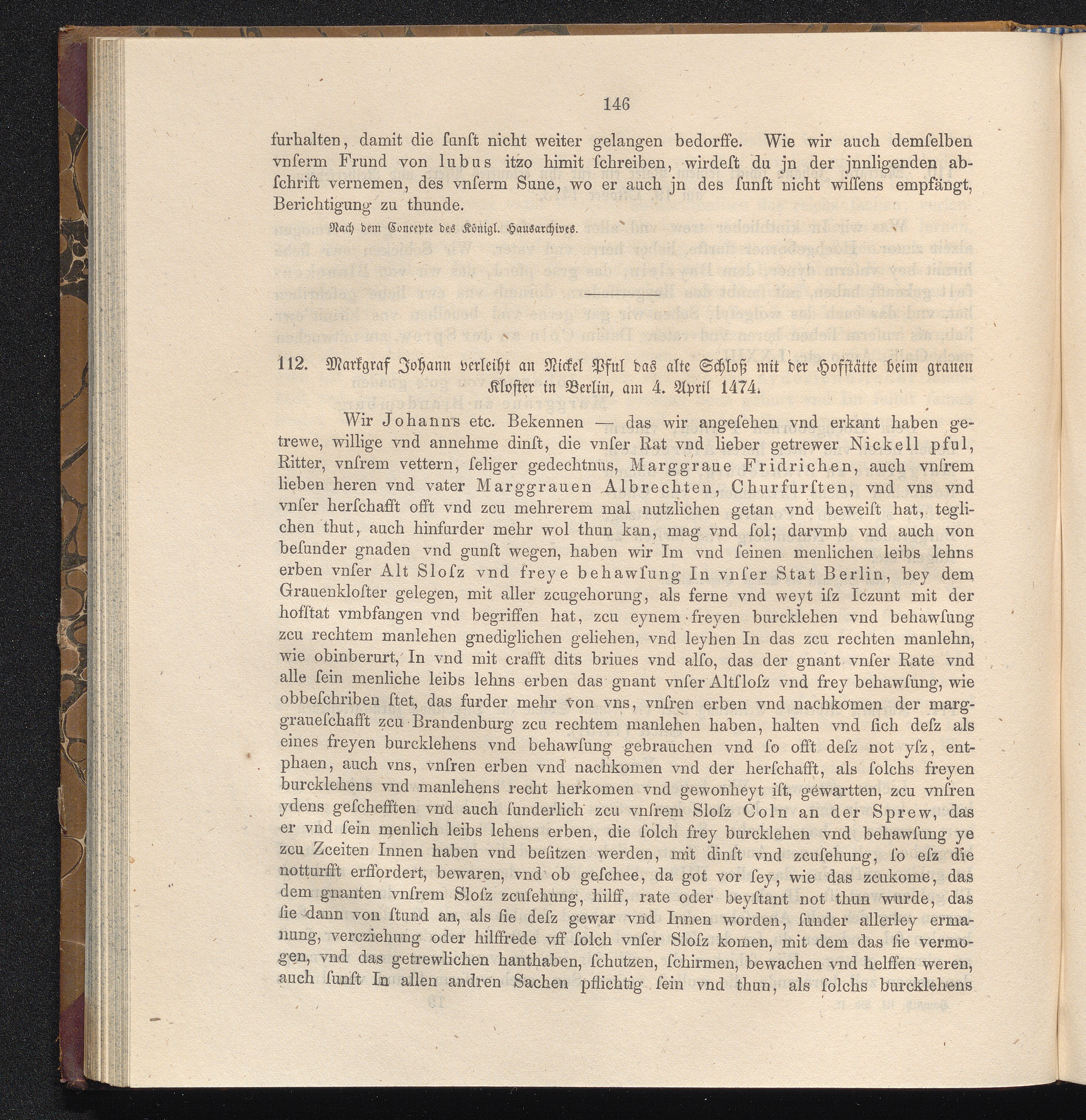 112. Markgraf Johann verleiht an Nickel Pfuhl das alte Schloß mit der Hofstätte beim[...]