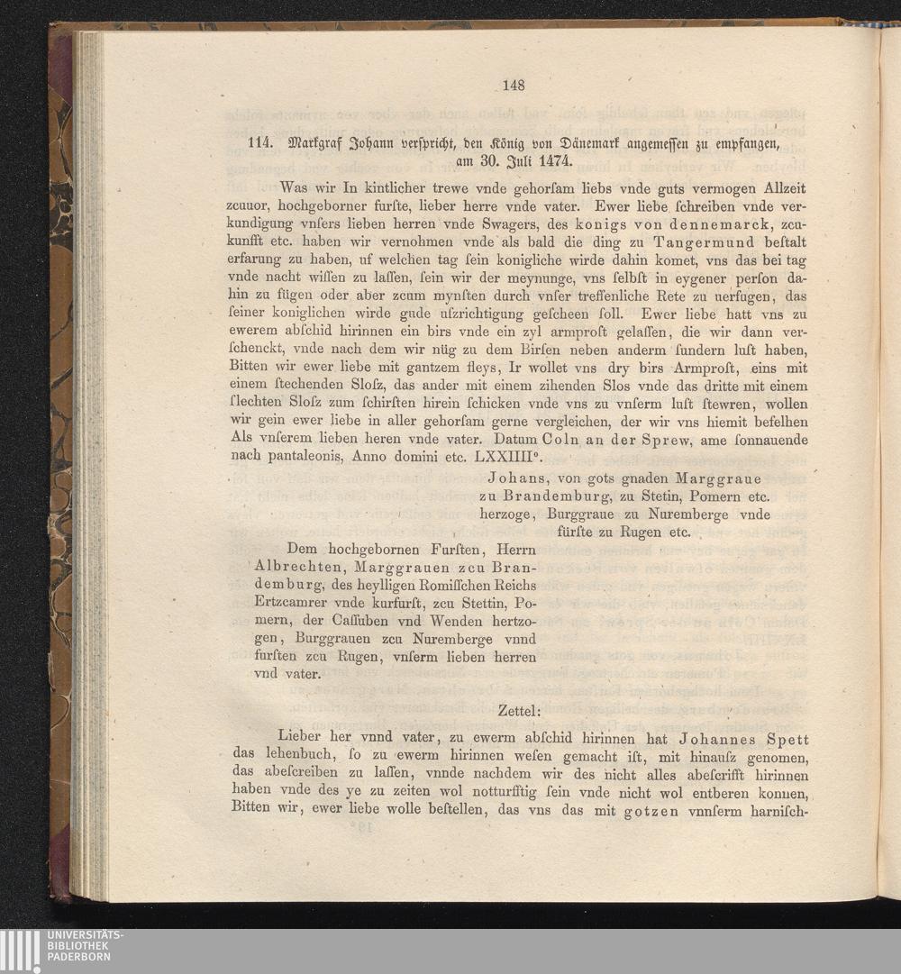 114. Markgraf Johann verspricht, den König von Dänemark angemessen zu empfangen,[...]