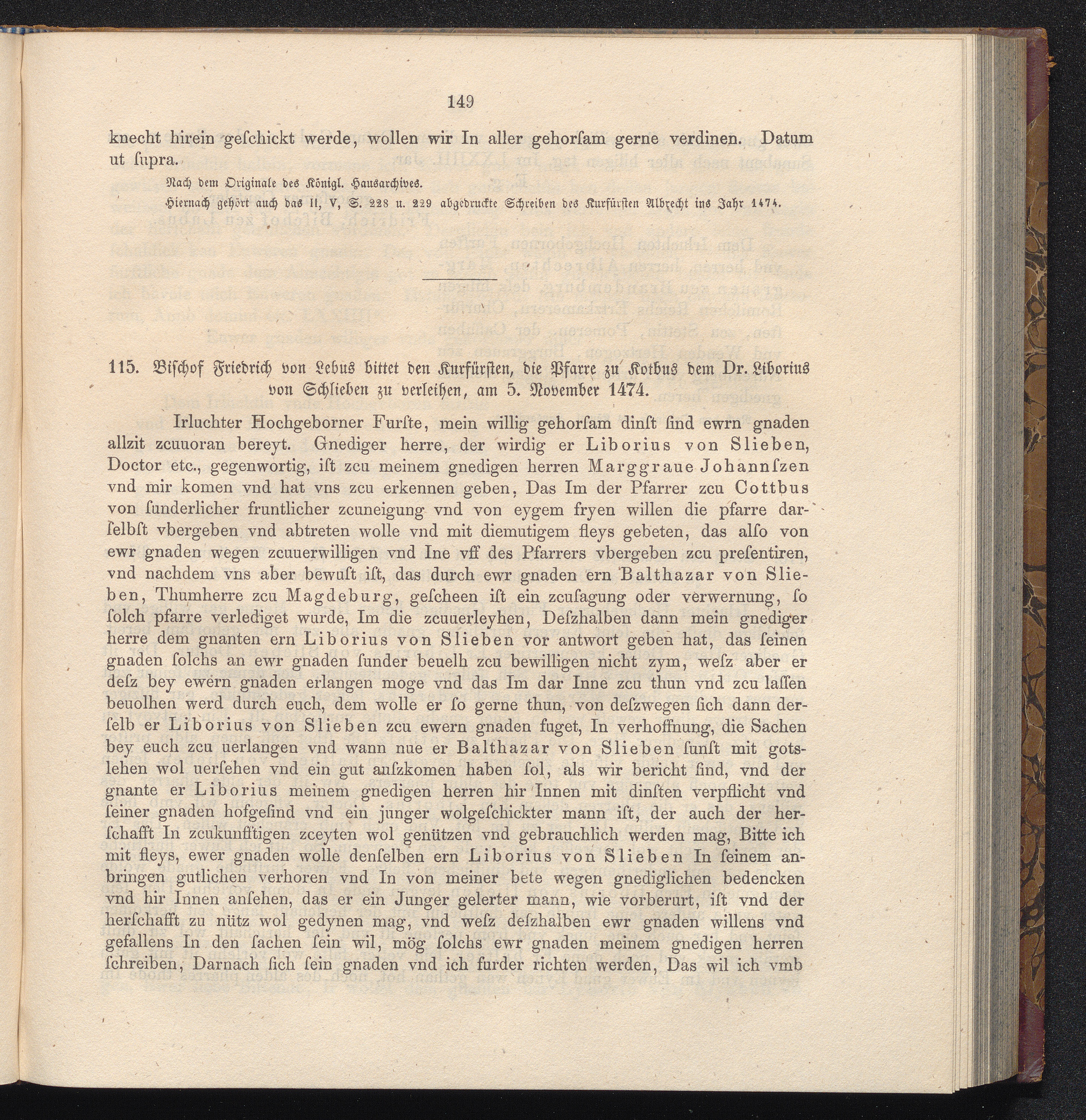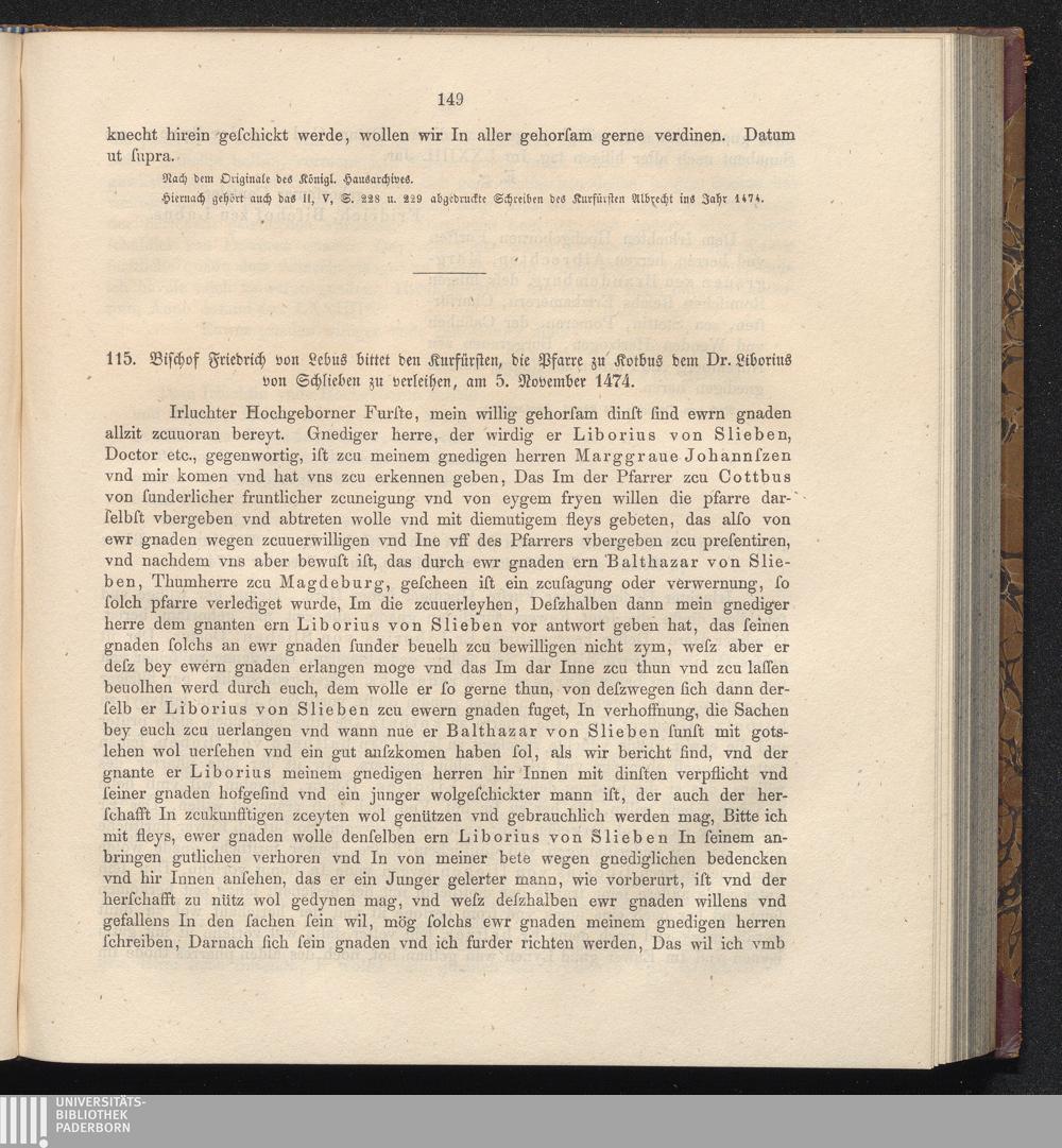 115. Bischof Friedrich von Lebus bittet den Kurfürsten, die Pfarre zu Kotbus dem[...]