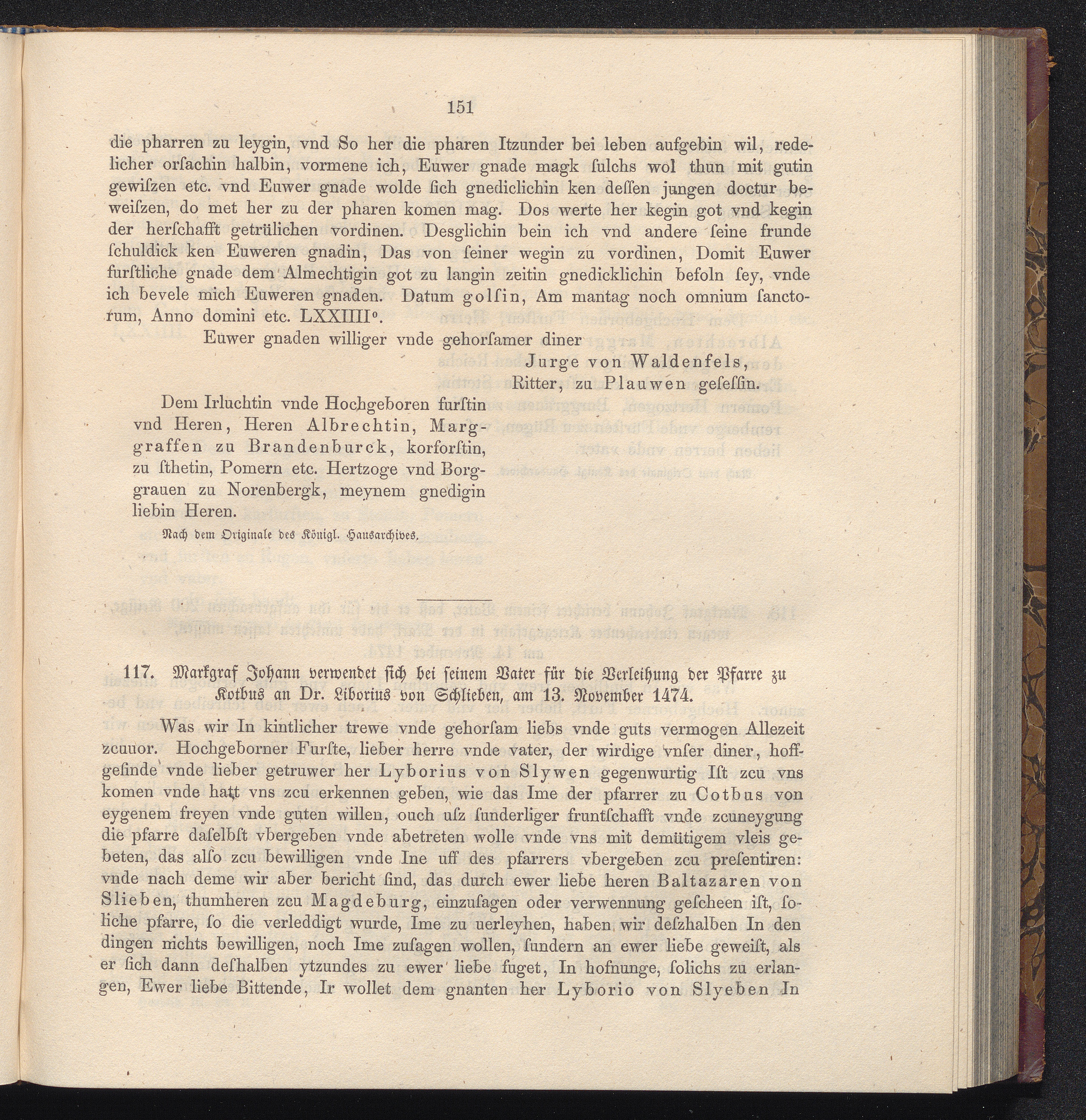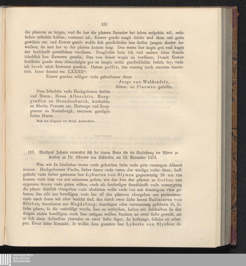 117. Markgraf Johann verwendet sich bei seinem Vater für die Verleihung der Pfarre[...]