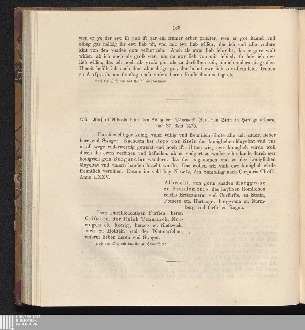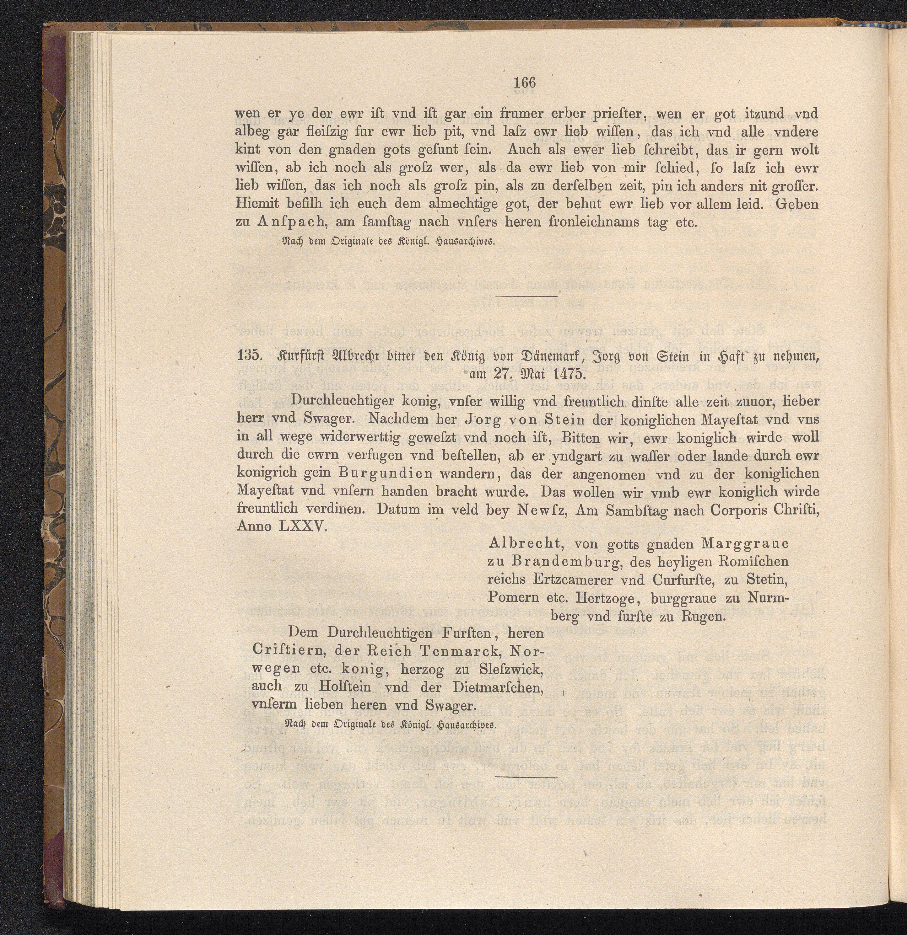 135. Kurfürst Albrecht bittet den König von Dänemark, Jorg von Stein in Haft zu nehmen,[...]
