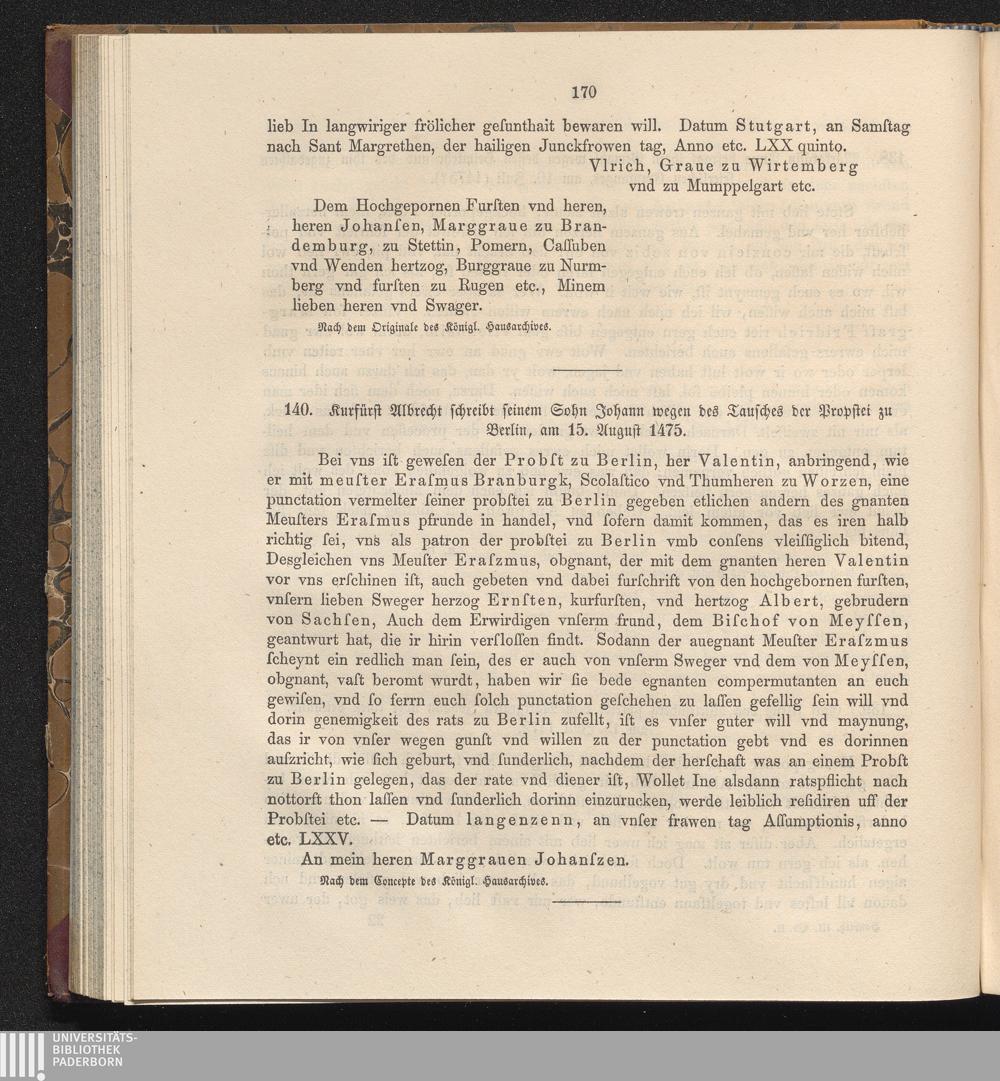 140. Kurfürst Albrecht schreibt seinem Sohn Johann wegen des Tausches der Propstei[...]