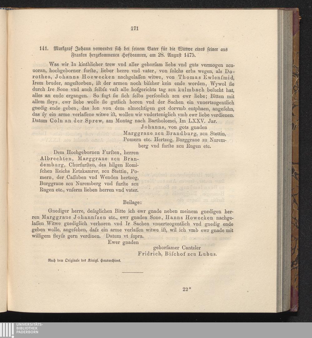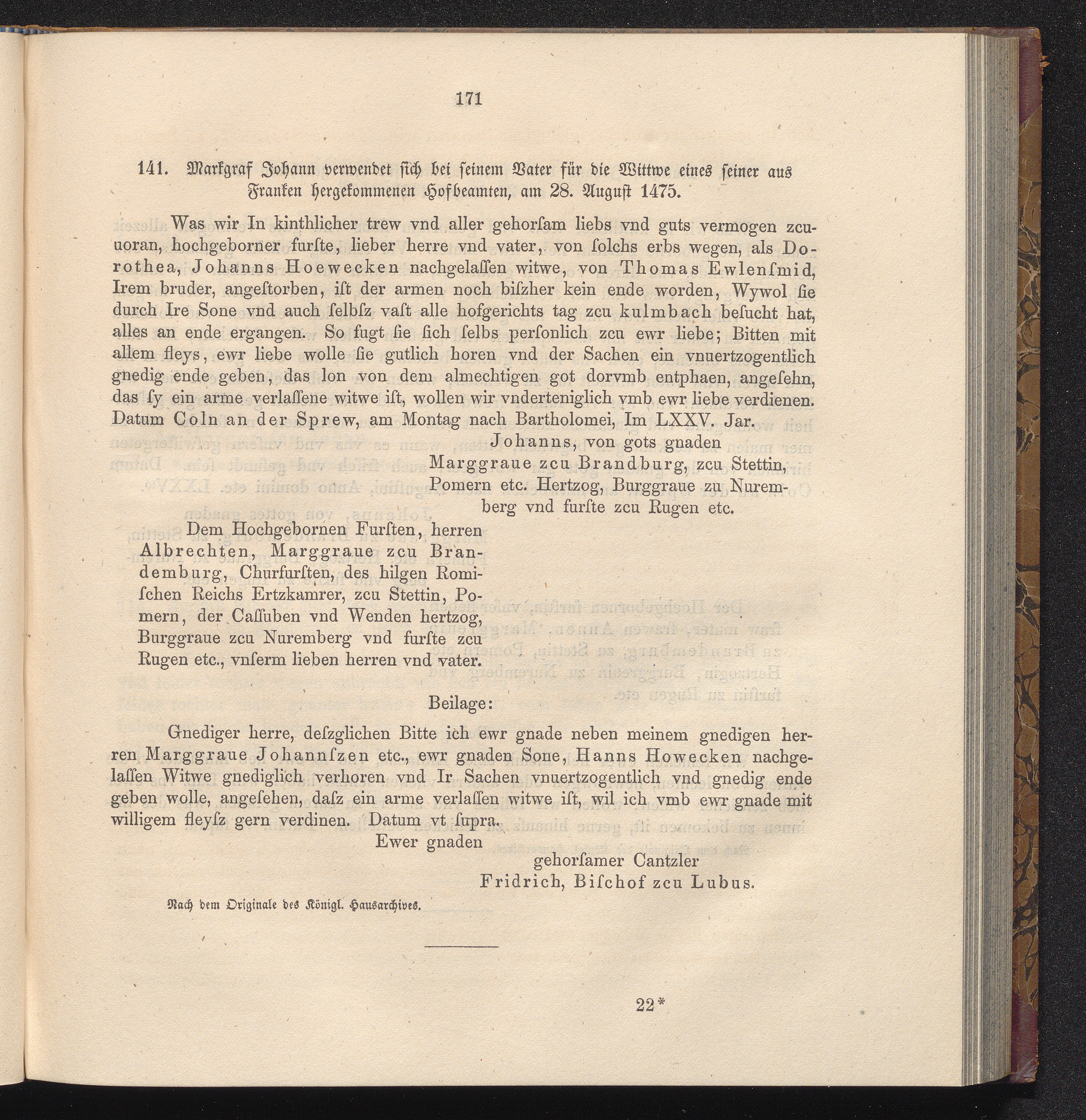 141. Markgraf Johann verwendet sich bei seinem Vater für die Wittwe eines seiner[...]