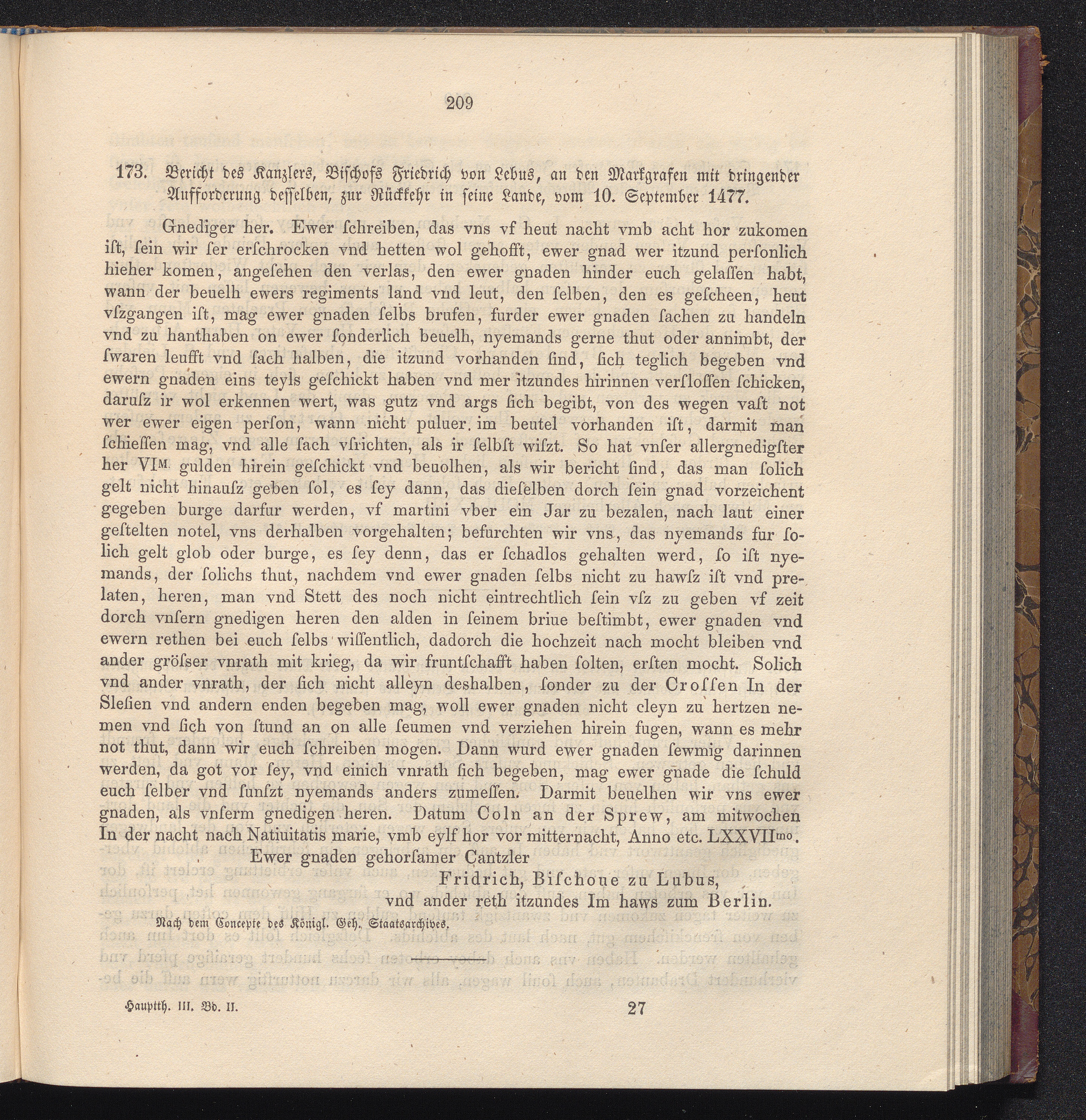 173. Bericht des Kanzlers, Bischofs Friedrich von Lebus, an den Markgrafen mit dringender[...]