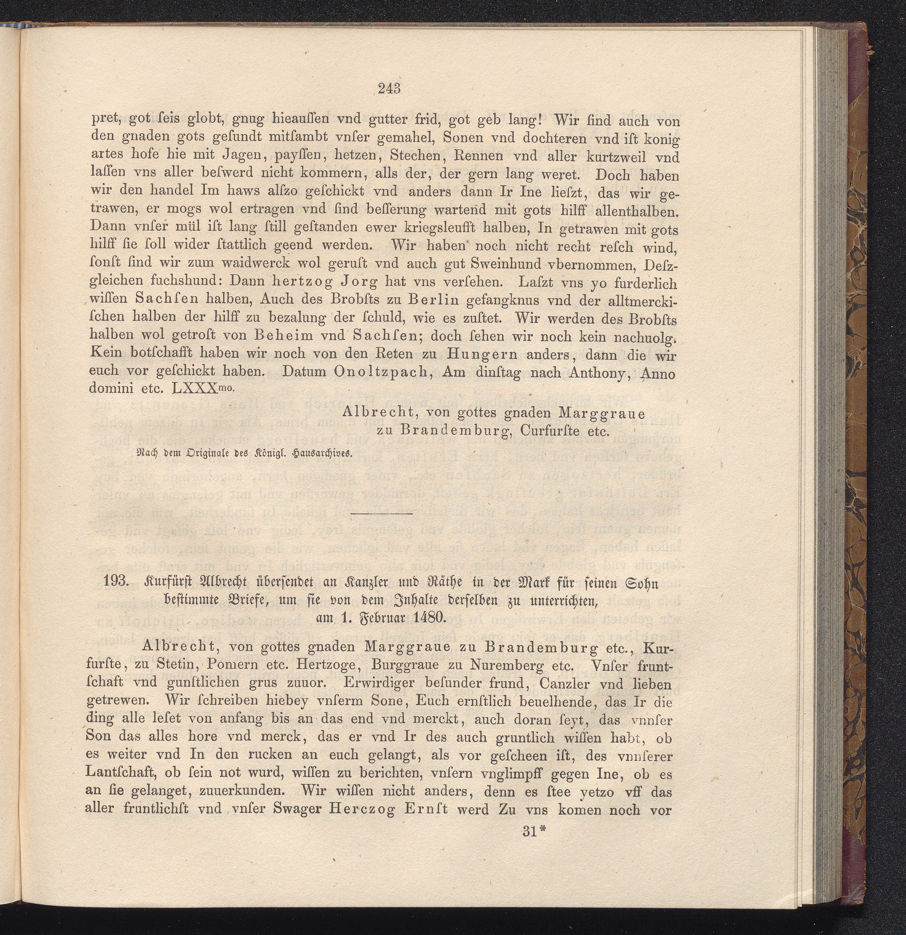 193. Kurfürst Albrecht übersendet am Kanzler und Räthe in der Mark für seinen Sohn[...]