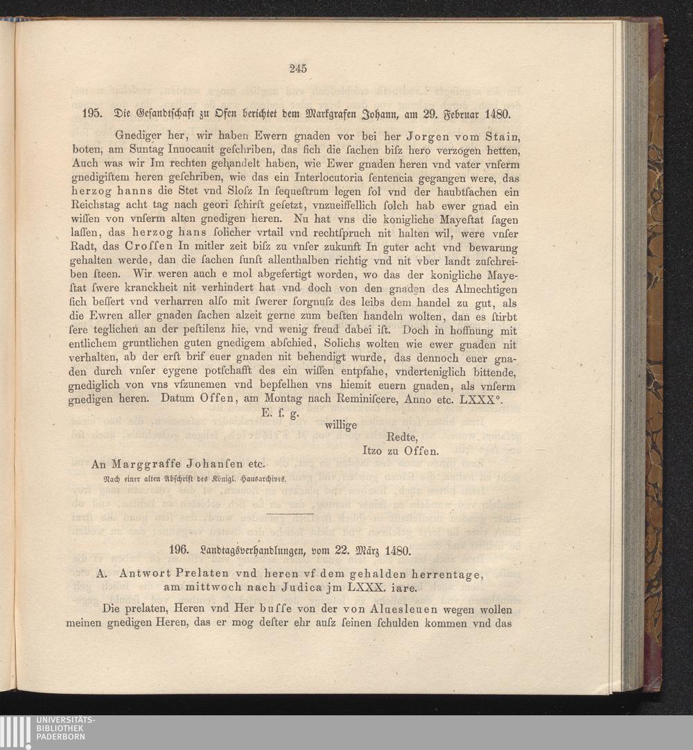 195. Die Gesandschaft zu Osen berichtet dem Markgrafen Johann, am 29. Februar 14[...]