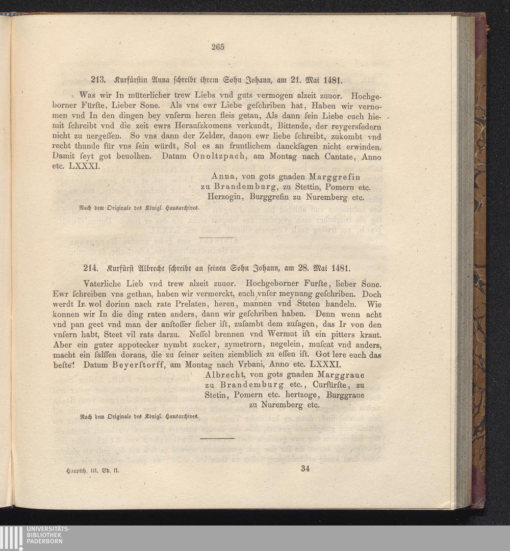 213. Kurfürstin Anna schreibt ihrem Sohn Johann, am 21. Mai 1481.