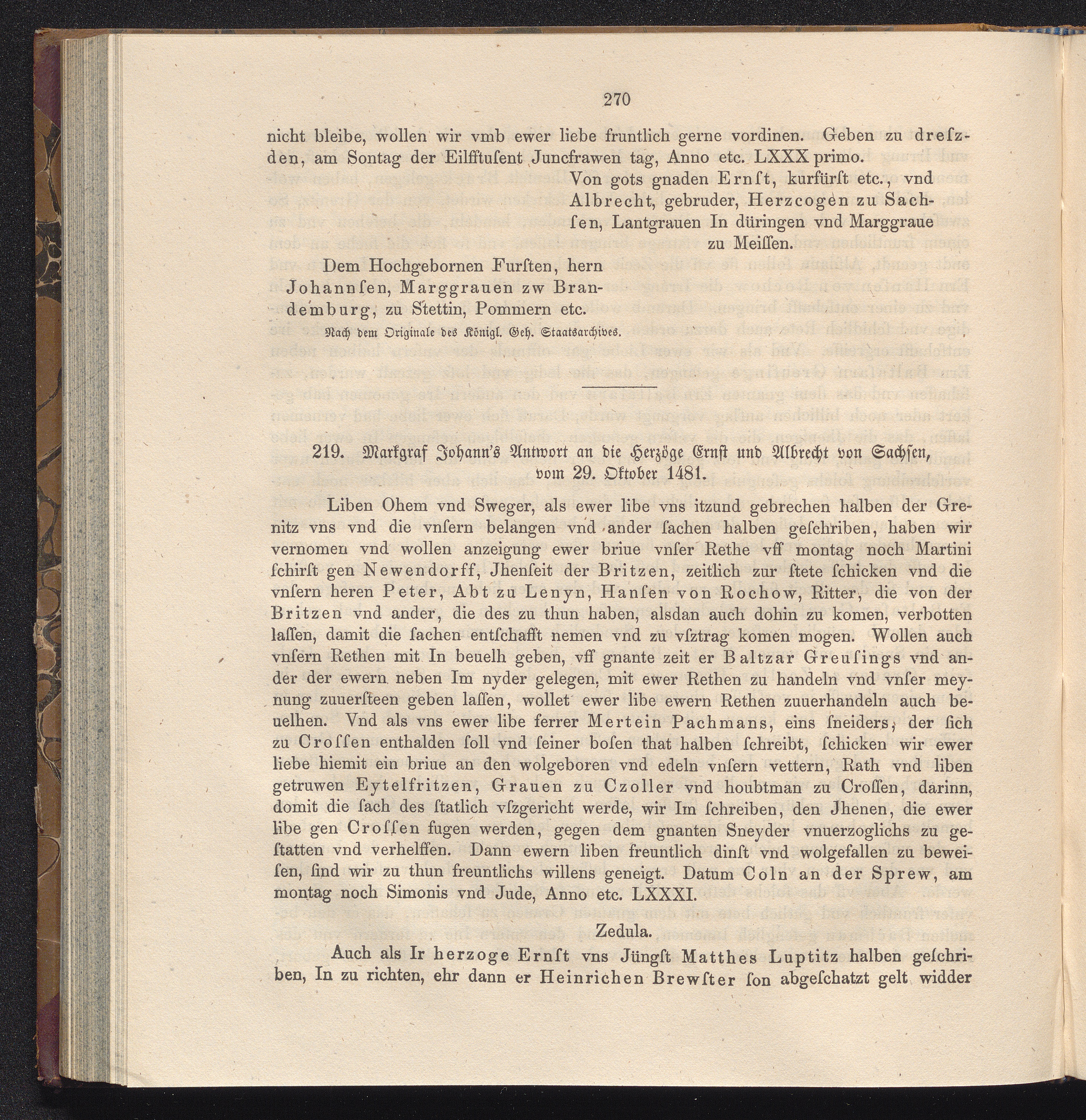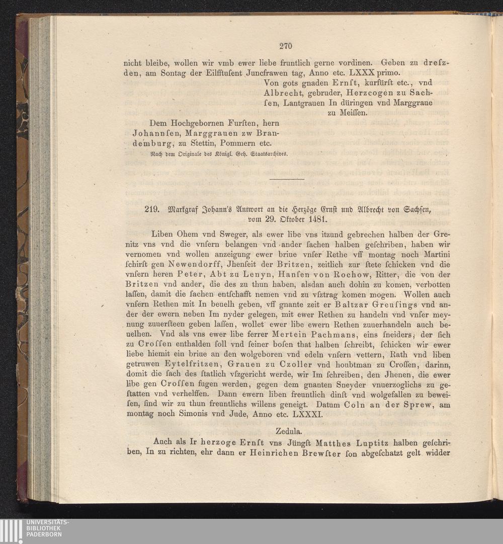 219. Markgraf Johann's Antwort an die Herzöge Ernst und Albrecht von Sachsen, vom[...]