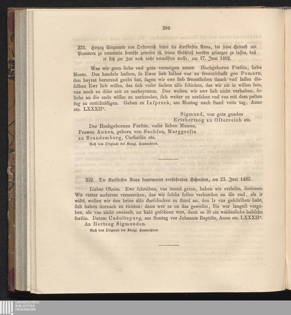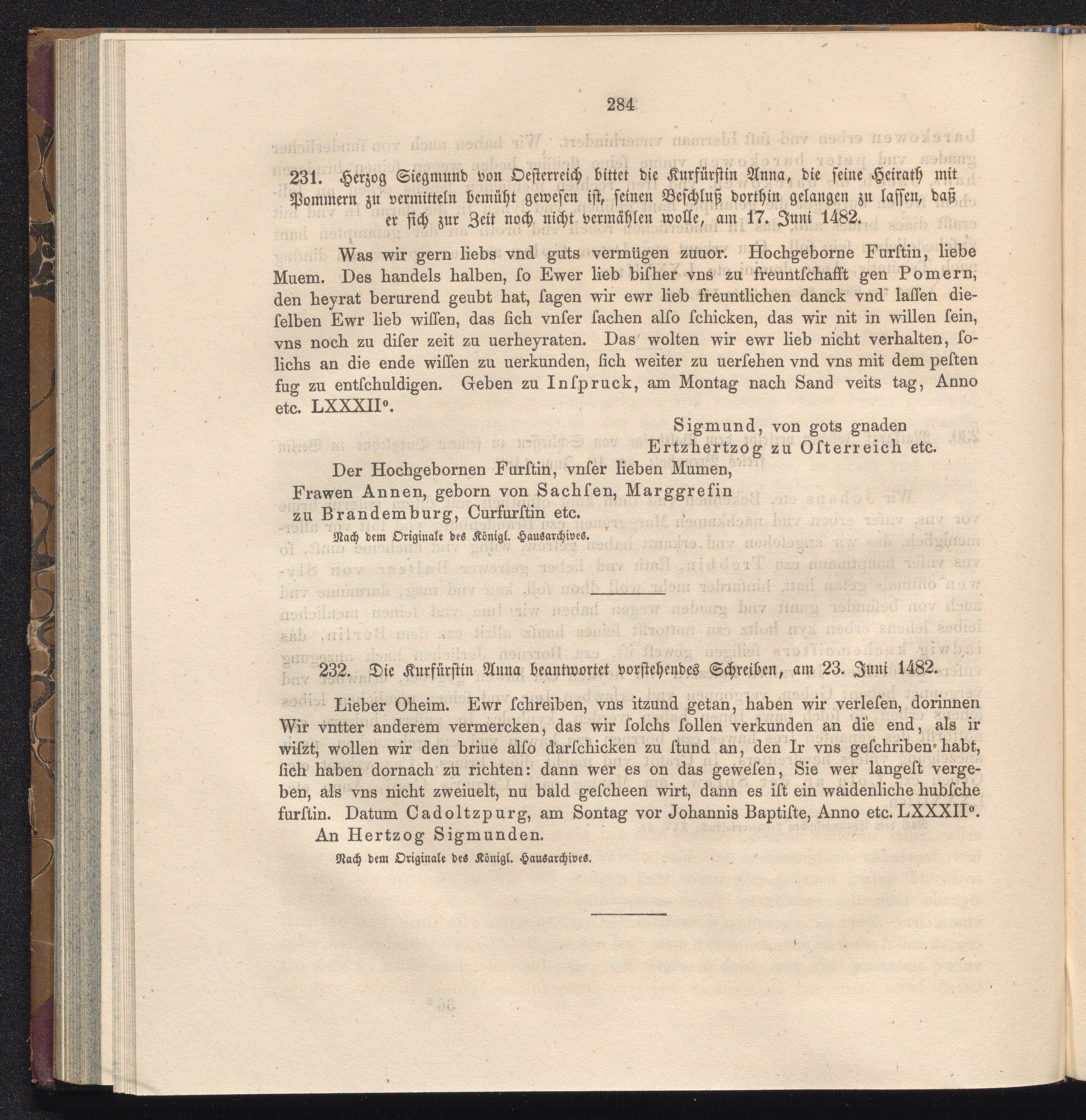 231. Herzog Siegmund von Oesterreich bittet die Kurfürstin Anna, die seine Heirath[...]