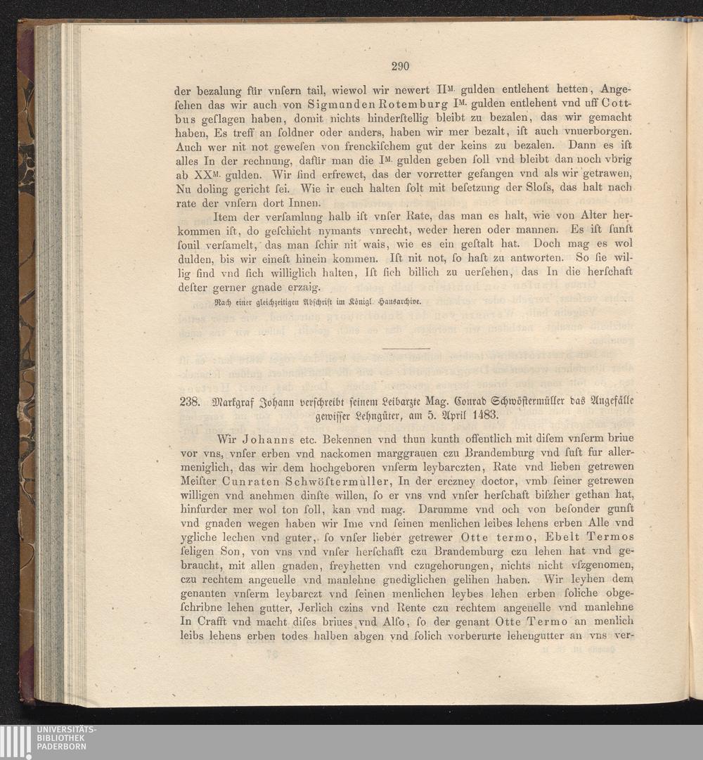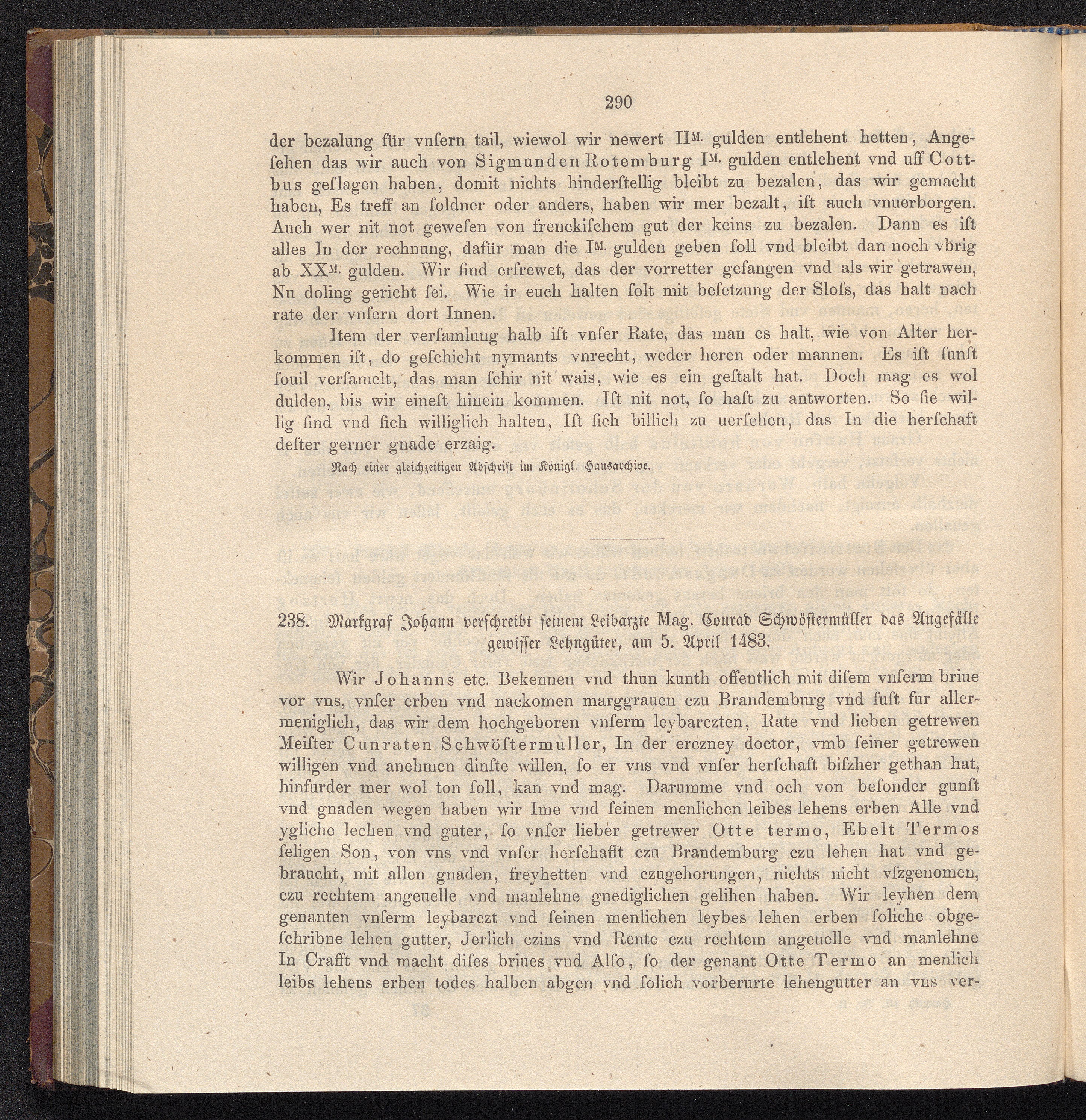 238. Markgraf Johann verschreibt seinem Leibarzte Mag. Conrad Schwöstermüller das[...]