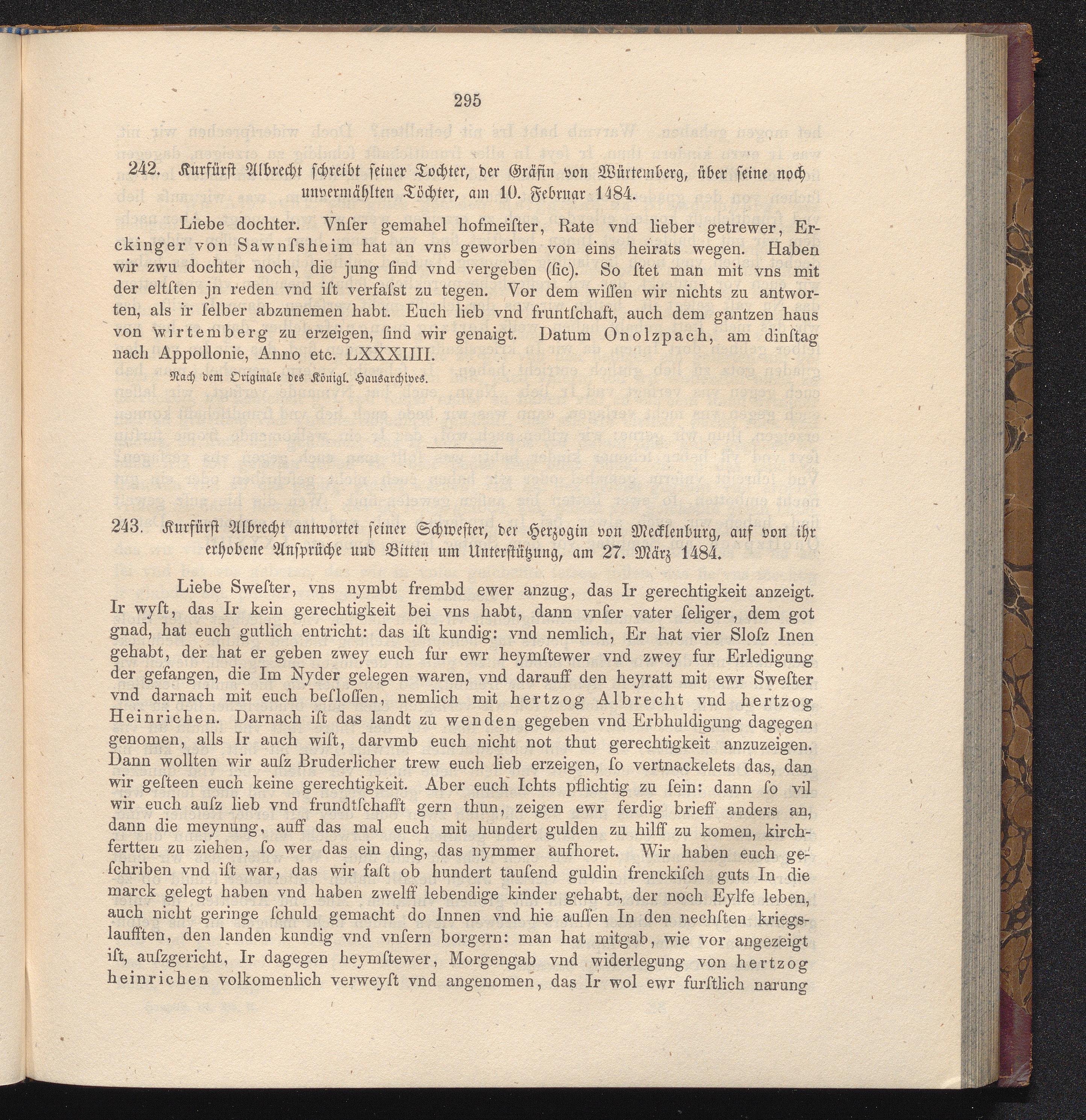 242. Kurfürst Albrecht schreibt seiner Tochter, der Gräfin von Würtemberg, über seine[...]
