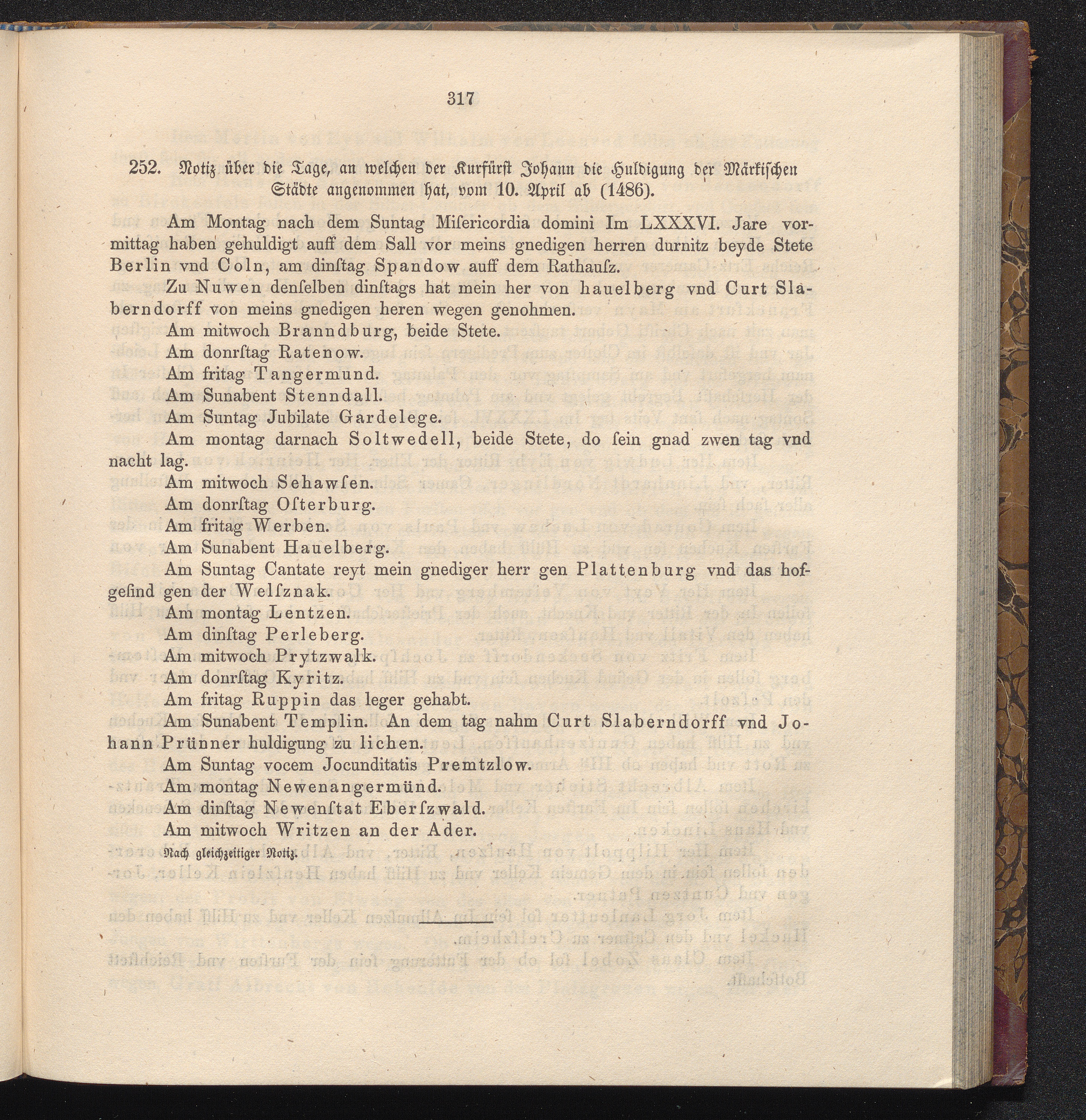 252. Notiz über die Tage, an welchen der Kurfürst Johann die Huldigung der Märkischen[...]