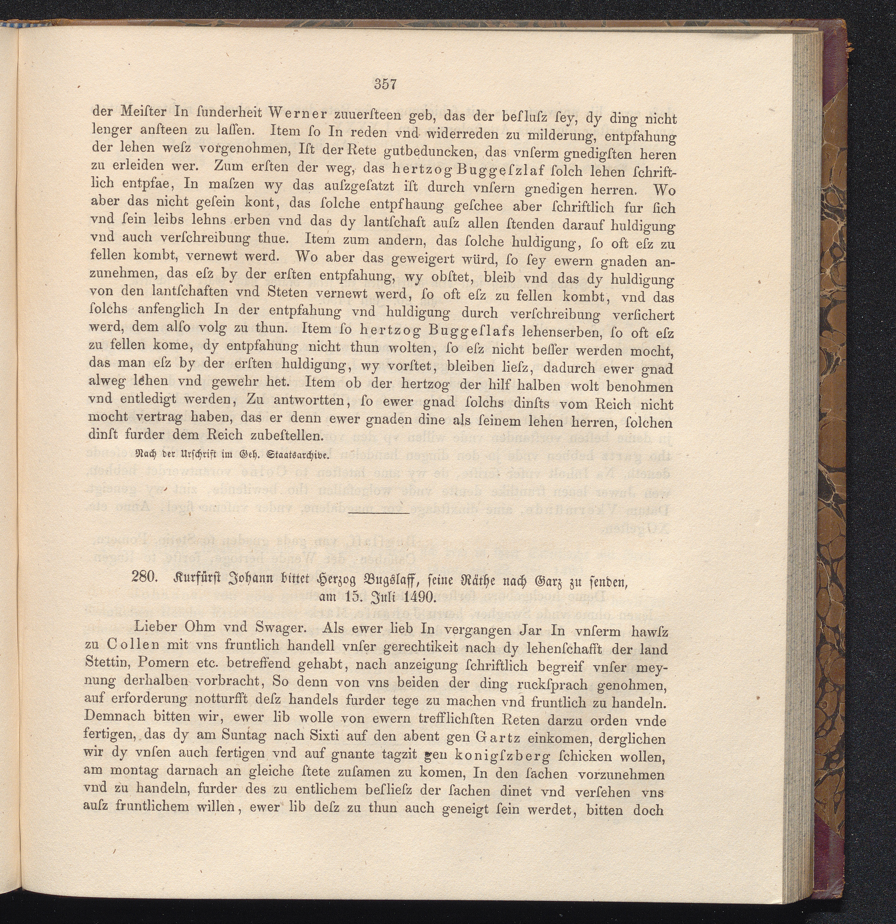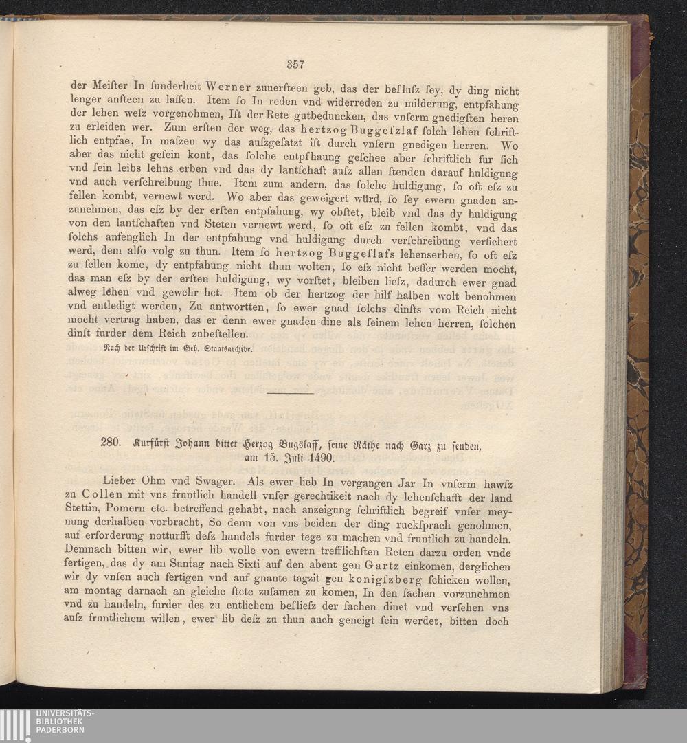 280. Kurfürst Johann bittet Herzog Bugslaff, seine Räthe nach Garz zu senden, am[...]