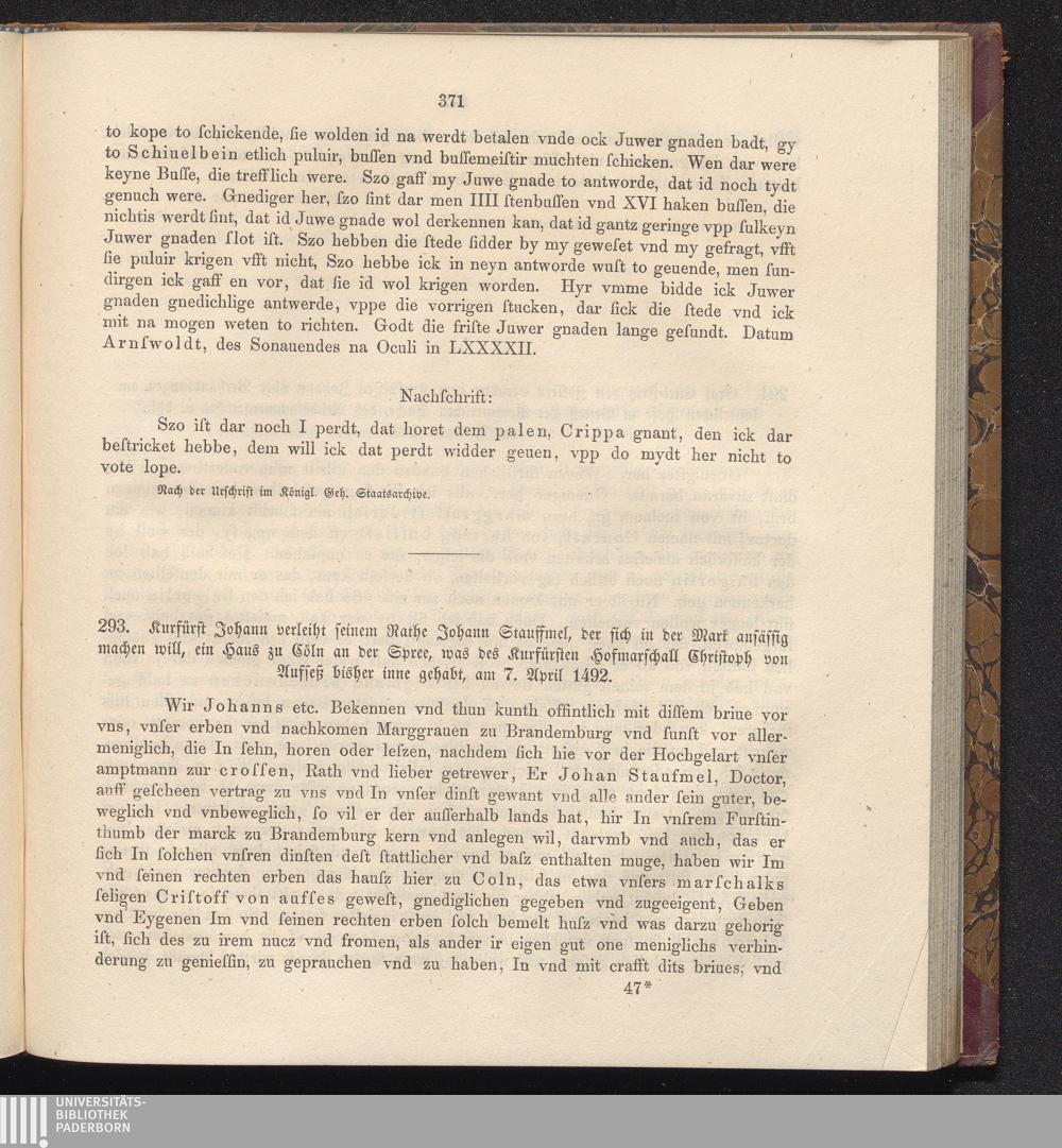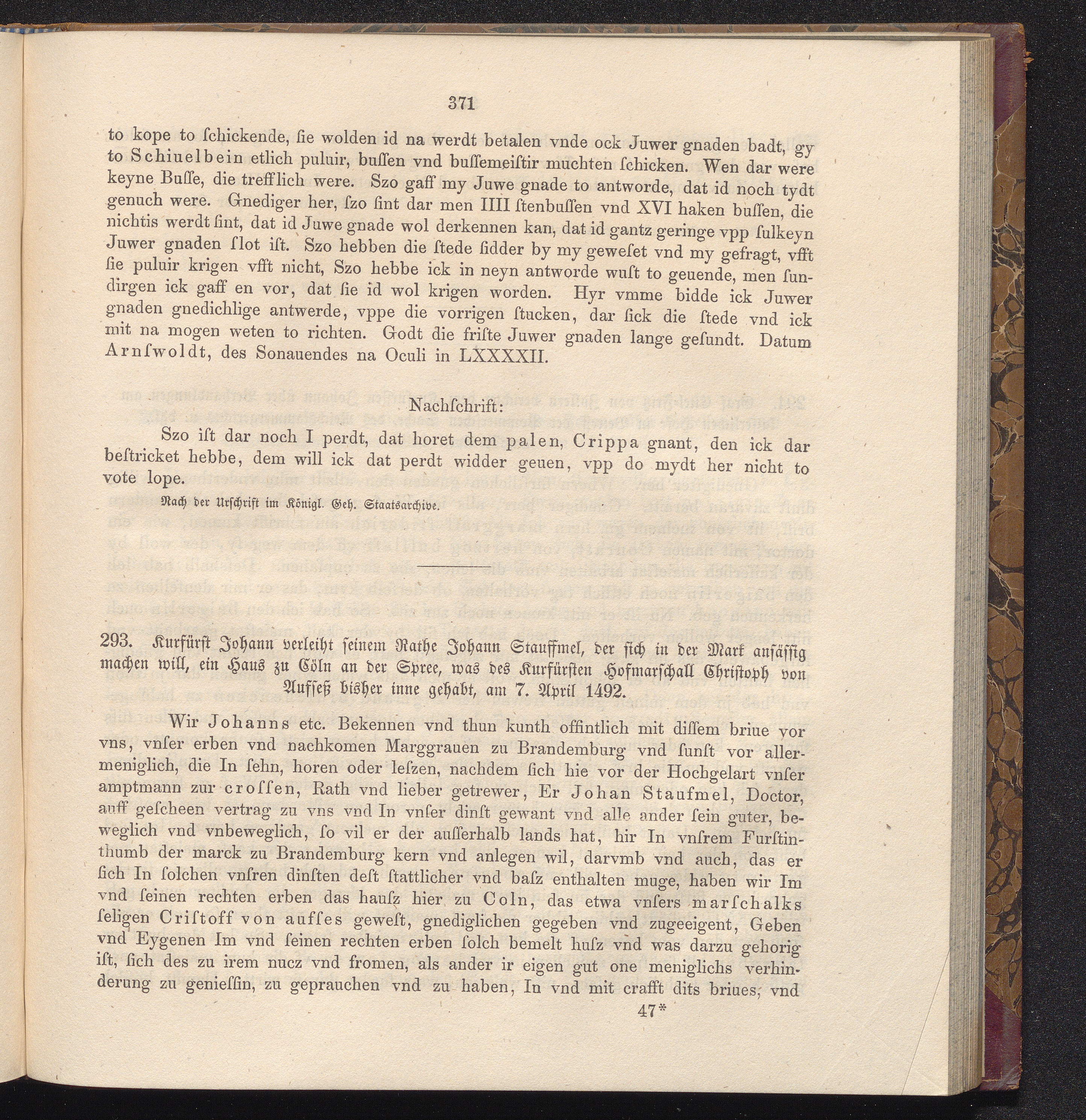 293. Kurfürst Johann verleiht seinem Rathe Johann Stauffmel, der sich in der Mark[...]