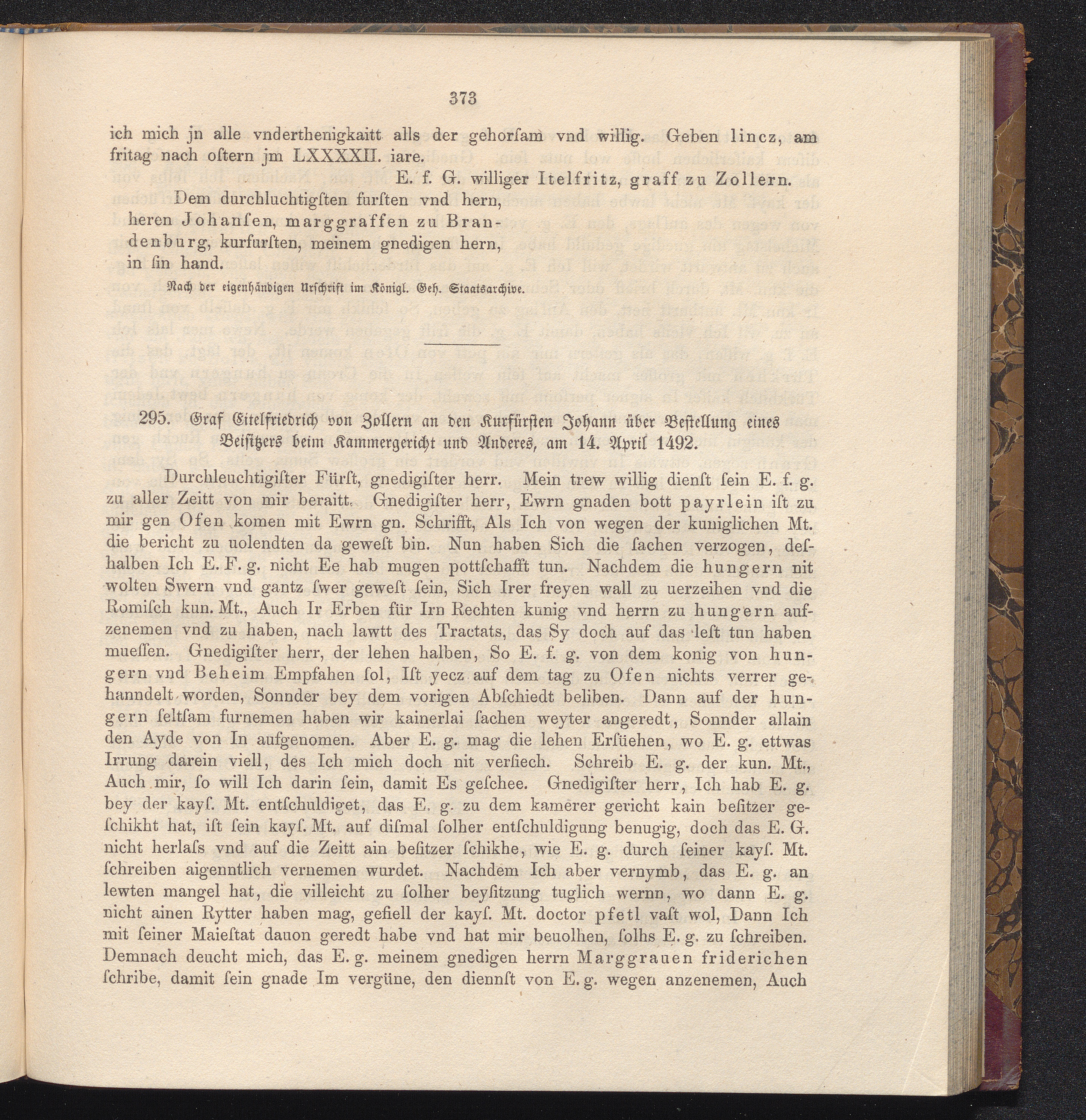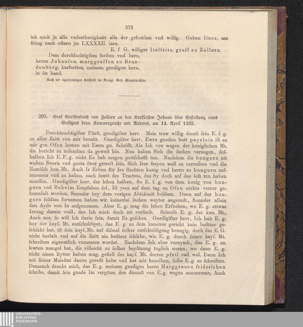 295. Graf Eitelfriedrich von Zollern an den Kurfürsten Johann über Bestellung eines[...]