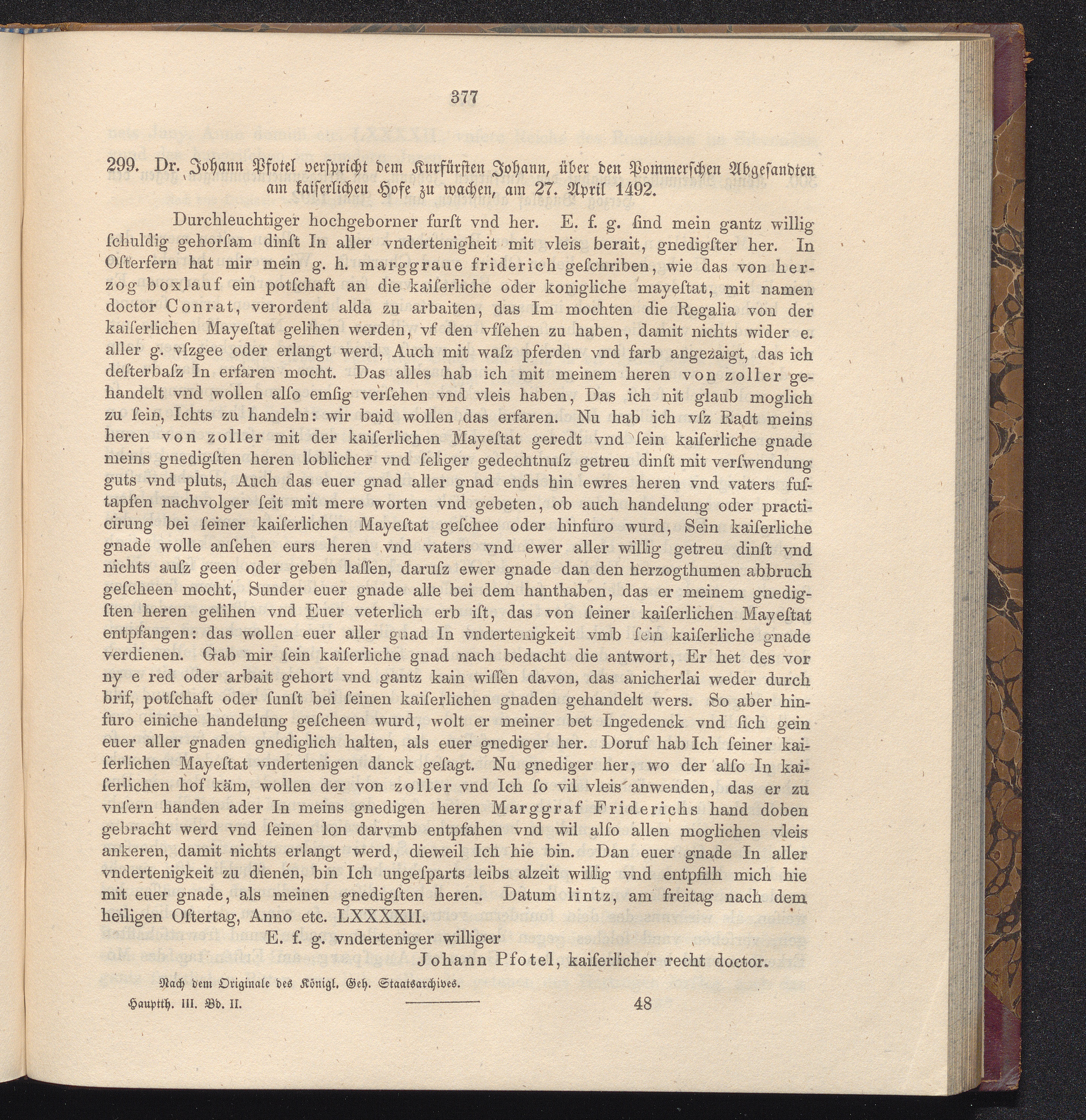 299. Dr. Johann Pfotel verspricht dem Kurfürsten Johann, über den Pommerschen Abgesandten[...]