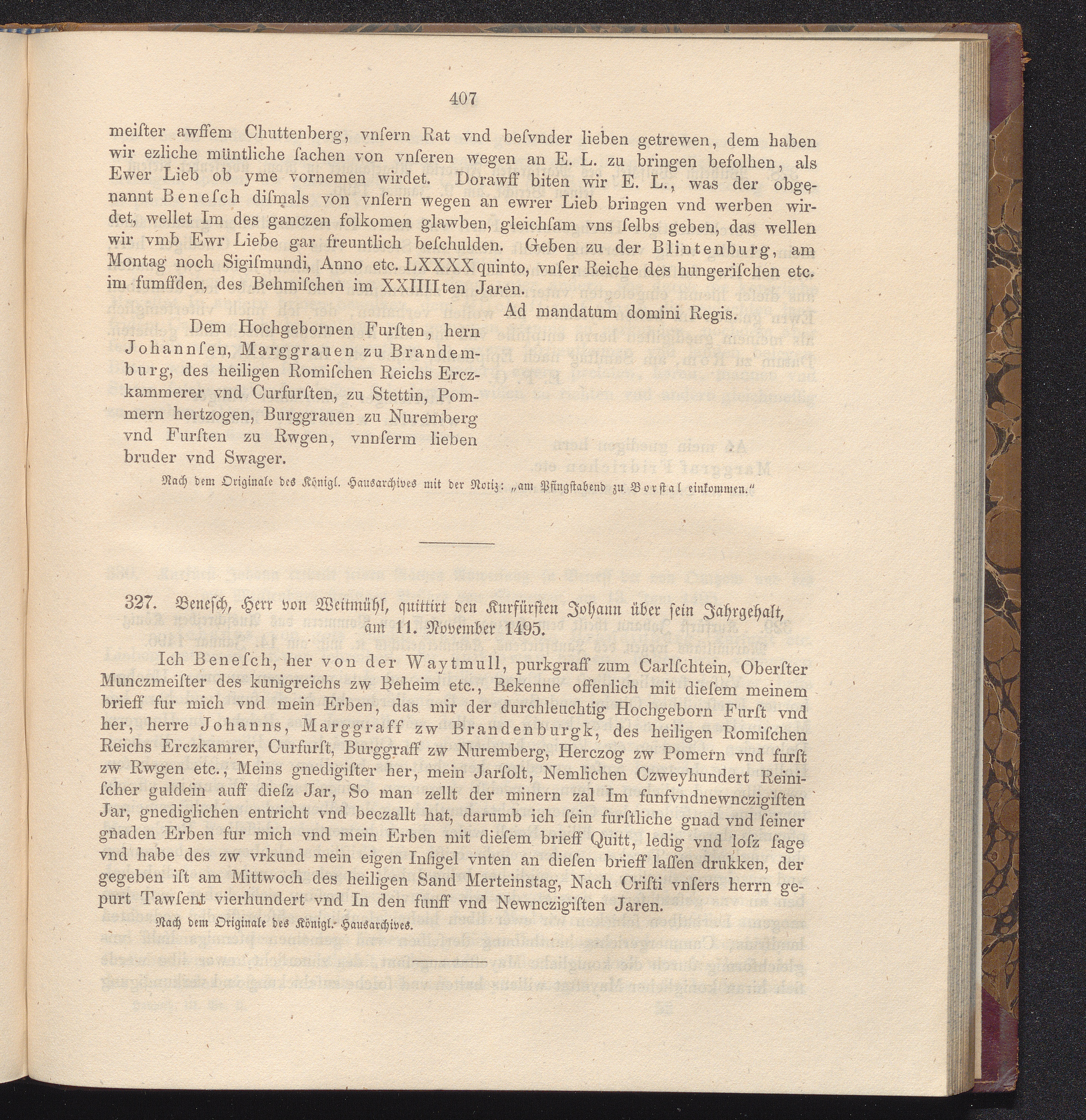 327. Benesch, Herr von Weitmühl, quittirt den Kurfürsten Johann über sein Jahresgehalt,[...]