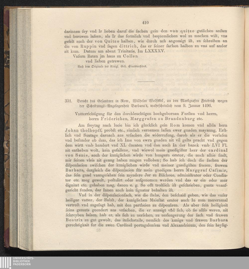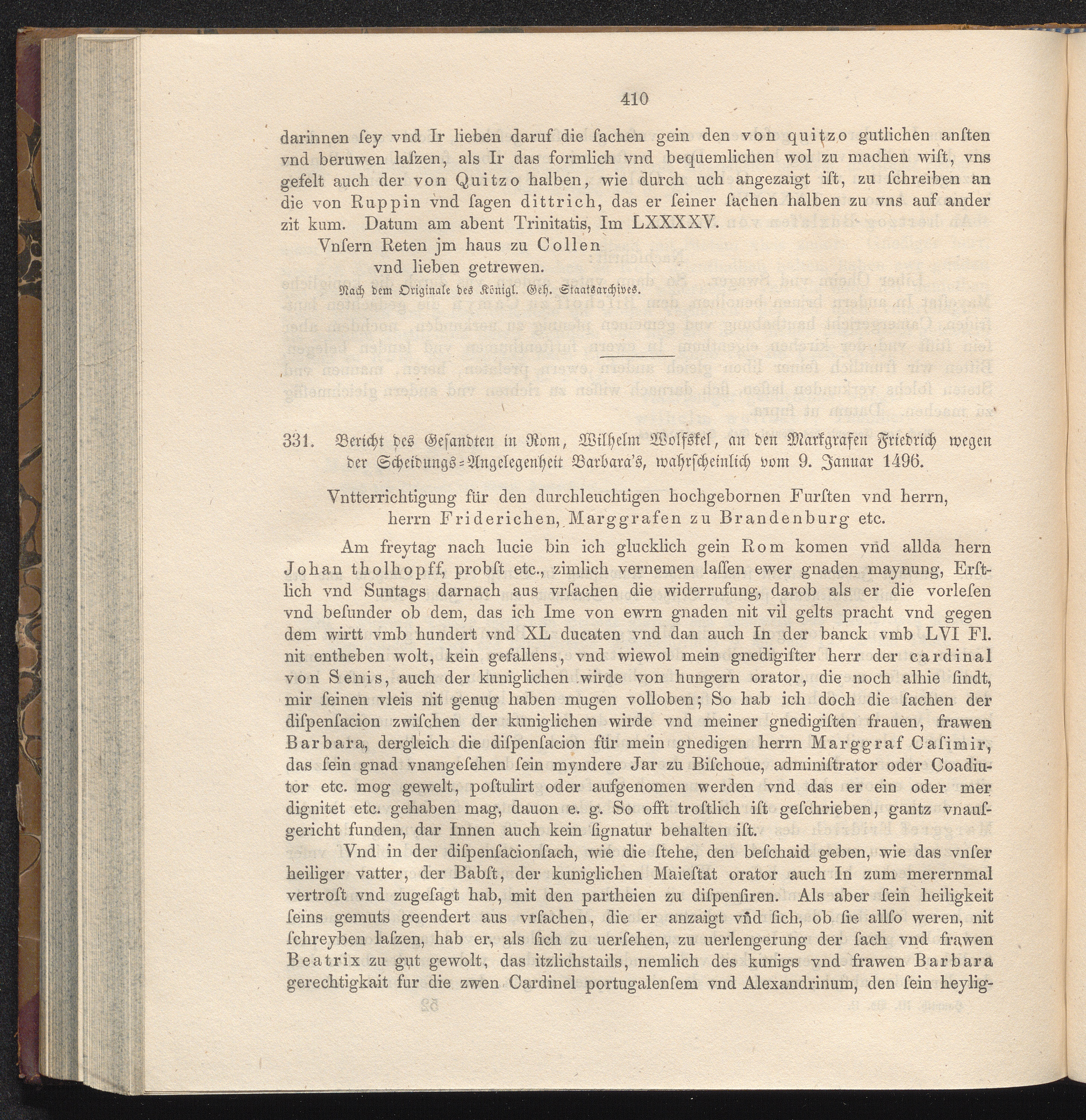 331. Bericht des Gesandten in Rom, Wilhelm Wolfskel, an den Markgrafen Friedrich[...]