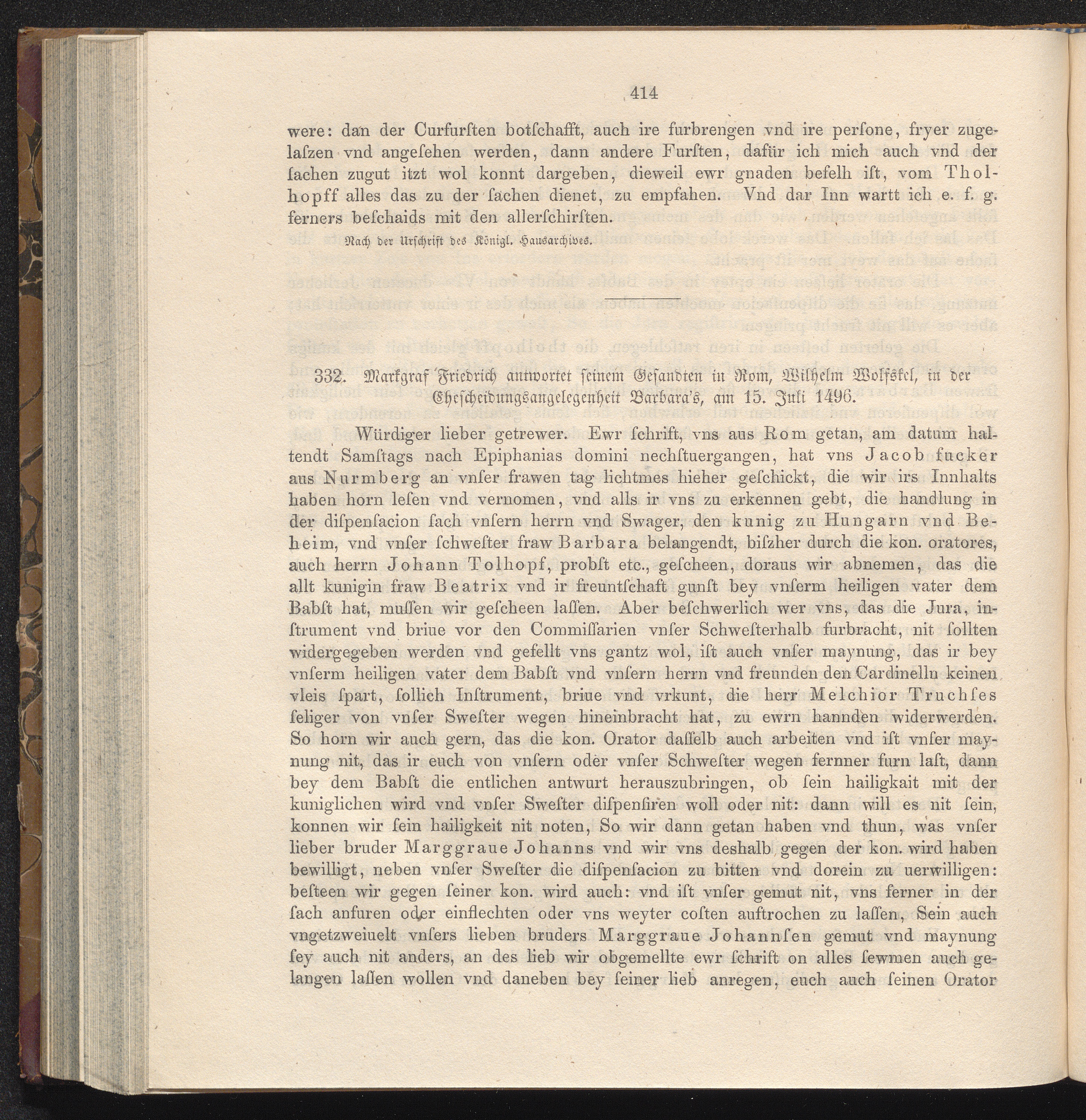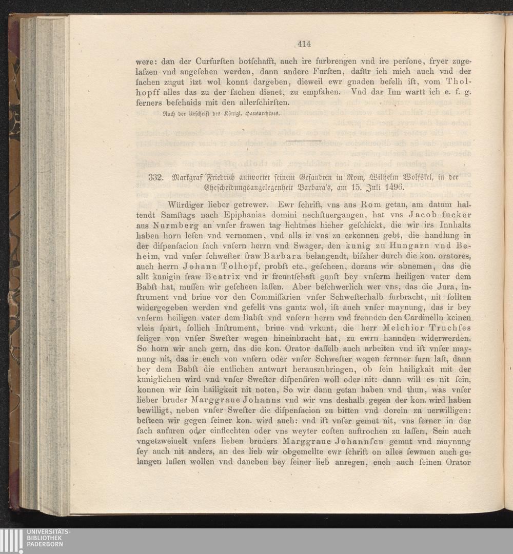 332. Markgraf Friedrich antwortet seinem Gesandten in Rom, Wilhelm Wolfskel, in der[...]