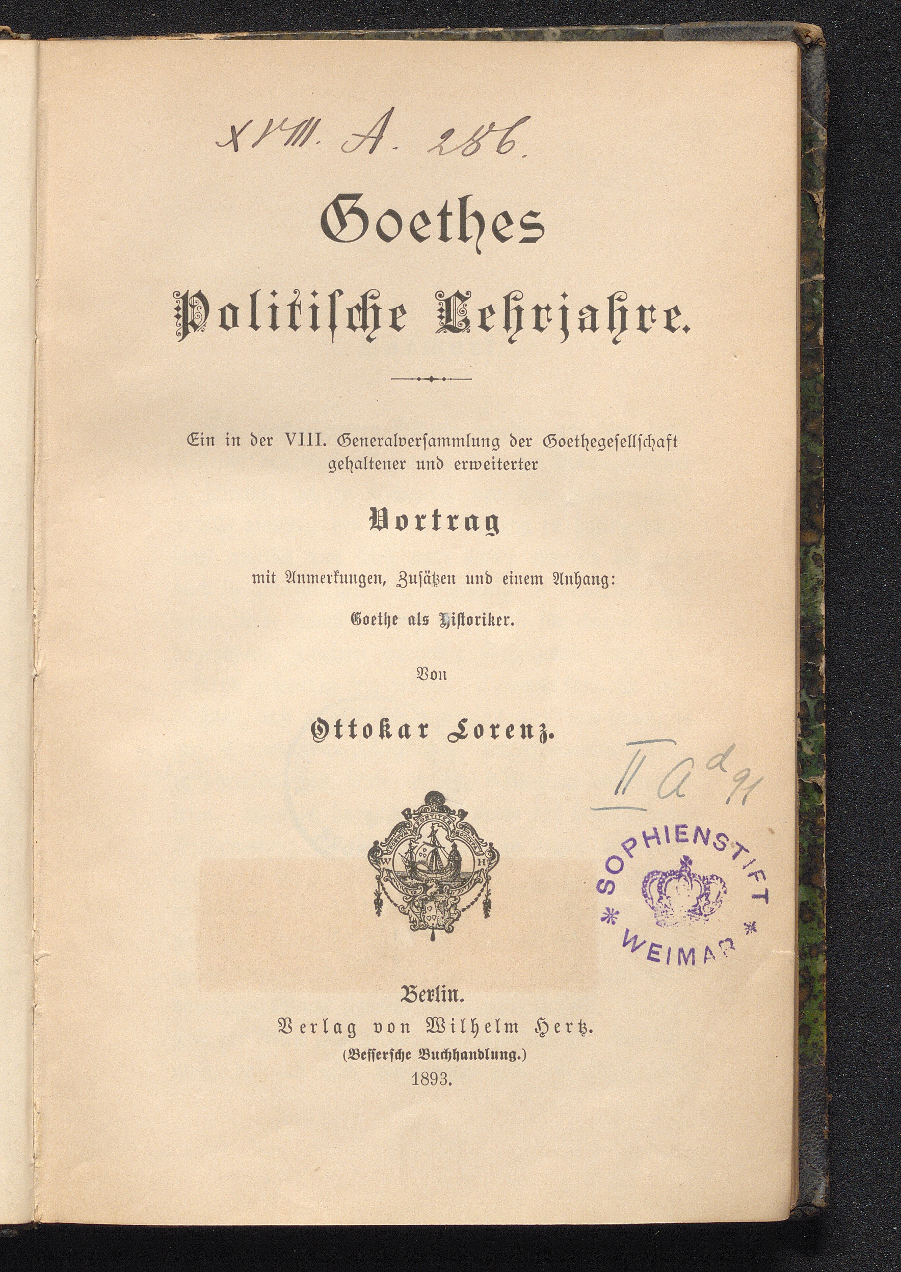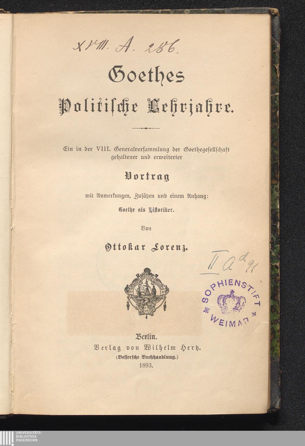 Goethes politische Lehrjahre : ein in der 8. Generalversammlung der Goethegesellschaft gehaltener und erweiterter Vortrag mit Anmerkungen, Zusätzen und einem Anh.: Goethe als Historiker / von Ottokar Lorenz