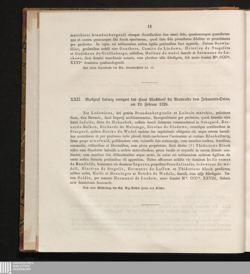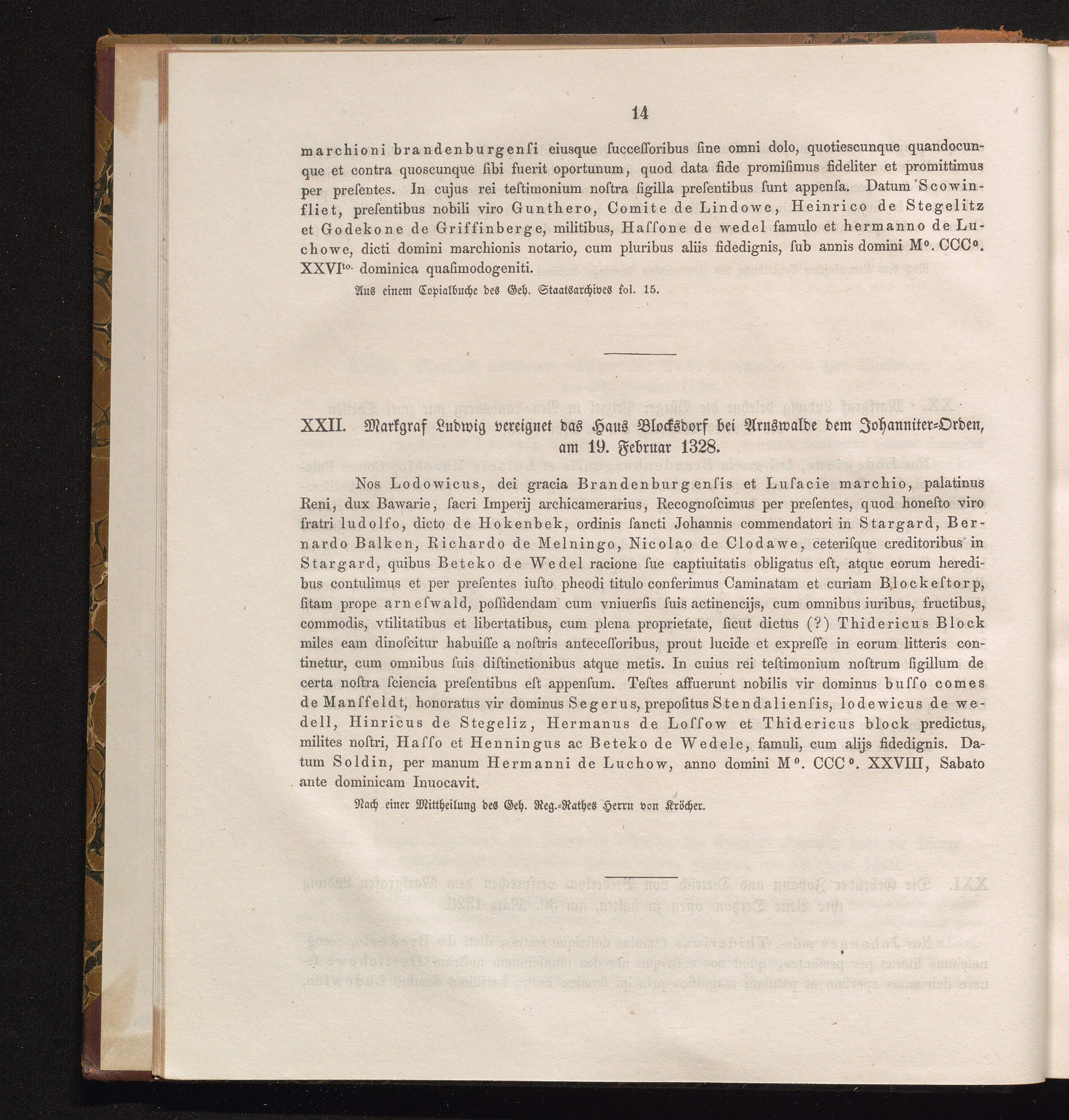 XXII. Markgraf Ludwig vereignet das Haus Blocksdorf bei Arnswalde dem Johanniter-Orden,[...]