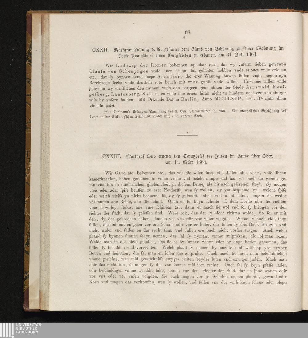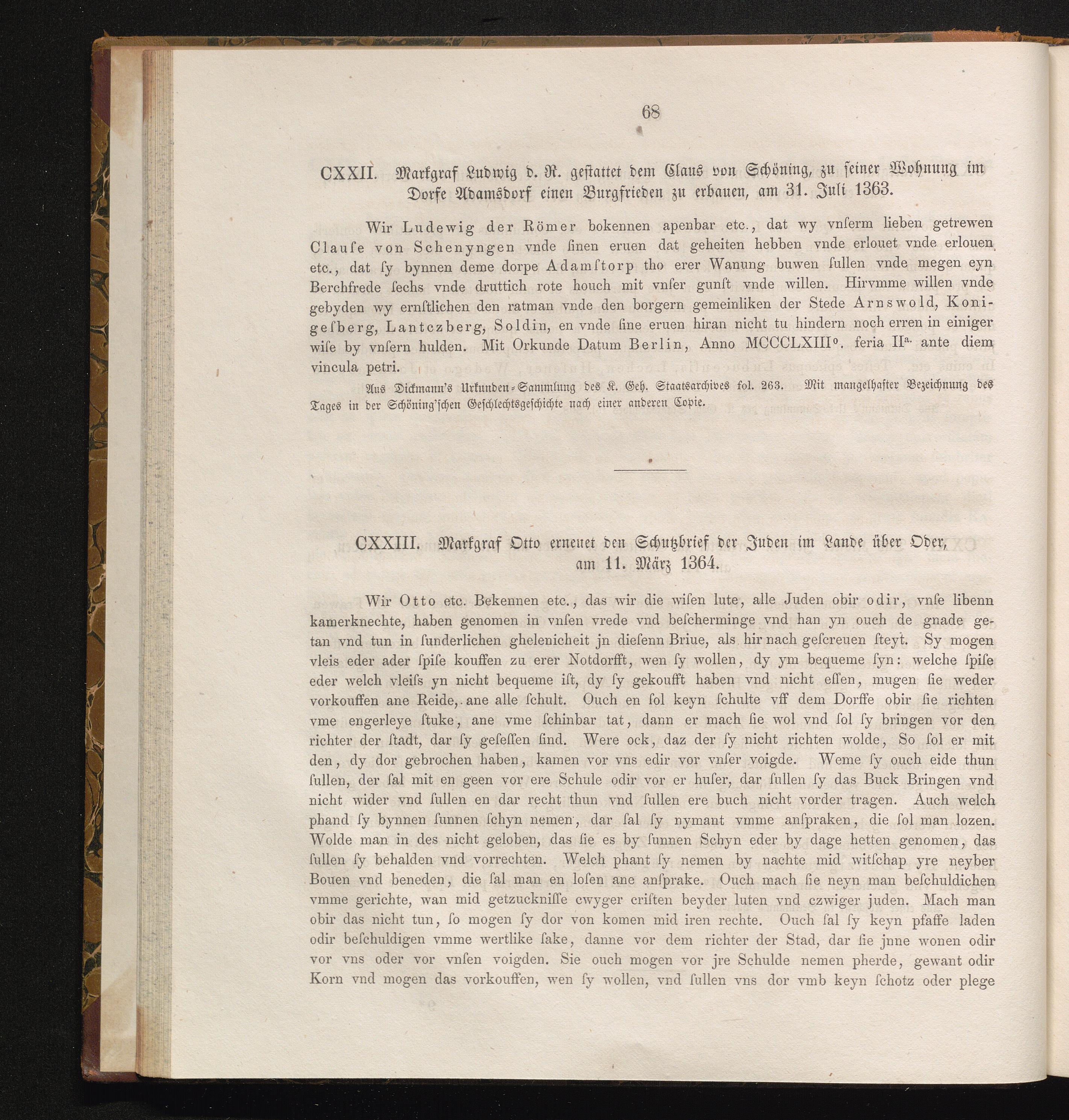 CXXIII. Markgraf Otto erneuet den Schutzbrief der Juden im Lande über Oder, am 11.[...]