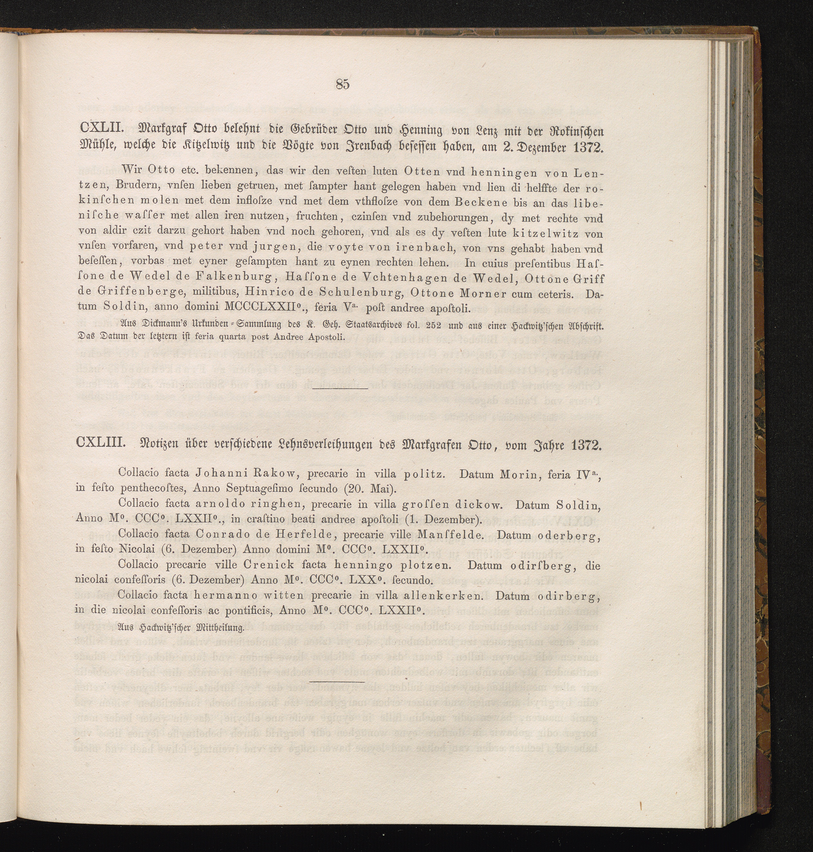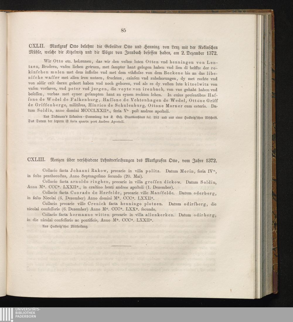CXLIII. Notizen über verschiedene Lehnsverleihungen des Markgrafen Otto, vom Jahre[...]