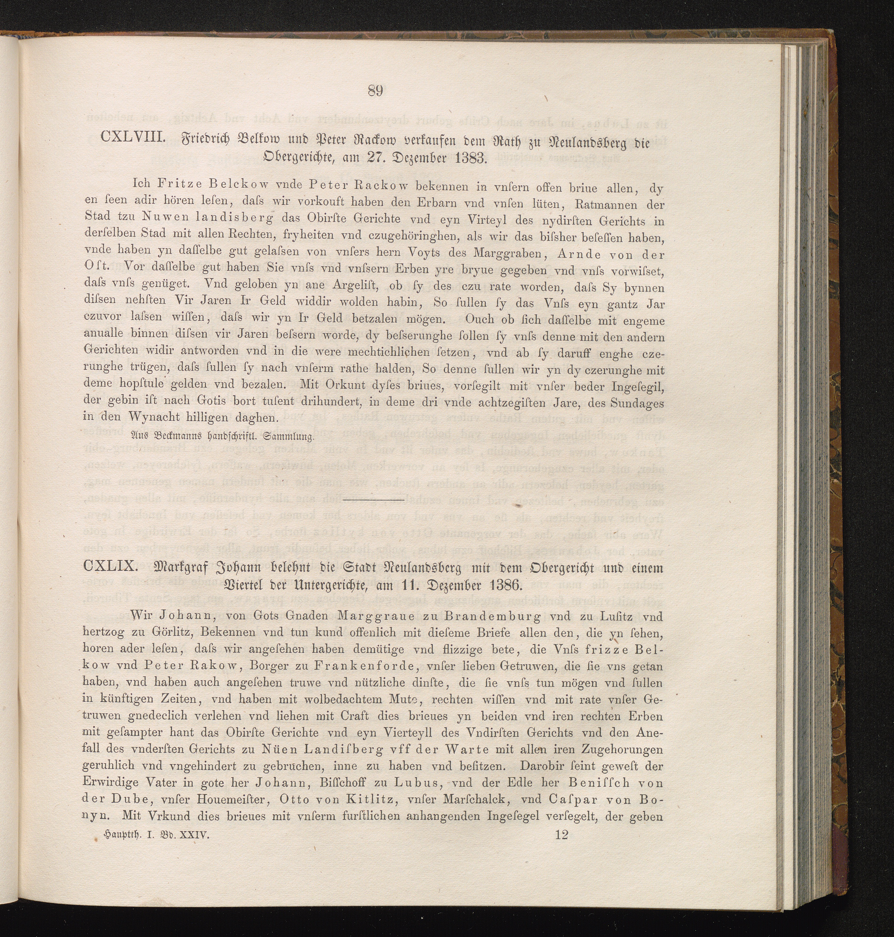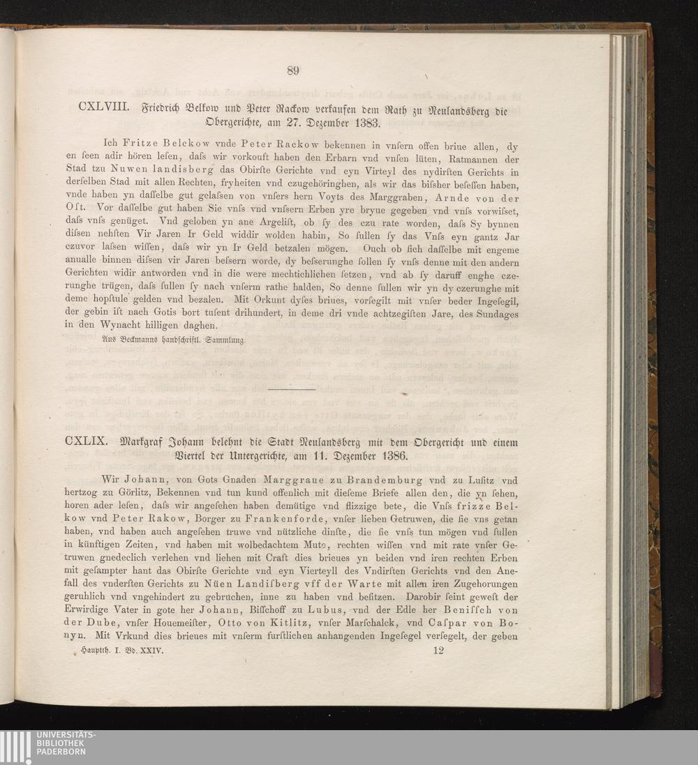 CXLIX. Markgraf Johann belehnt die Stadt Neulandsberg mit dem Obergericht und einem[...]