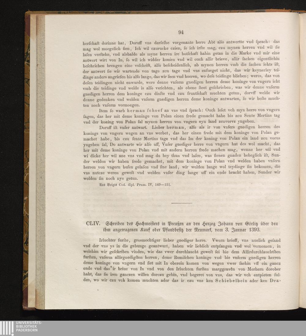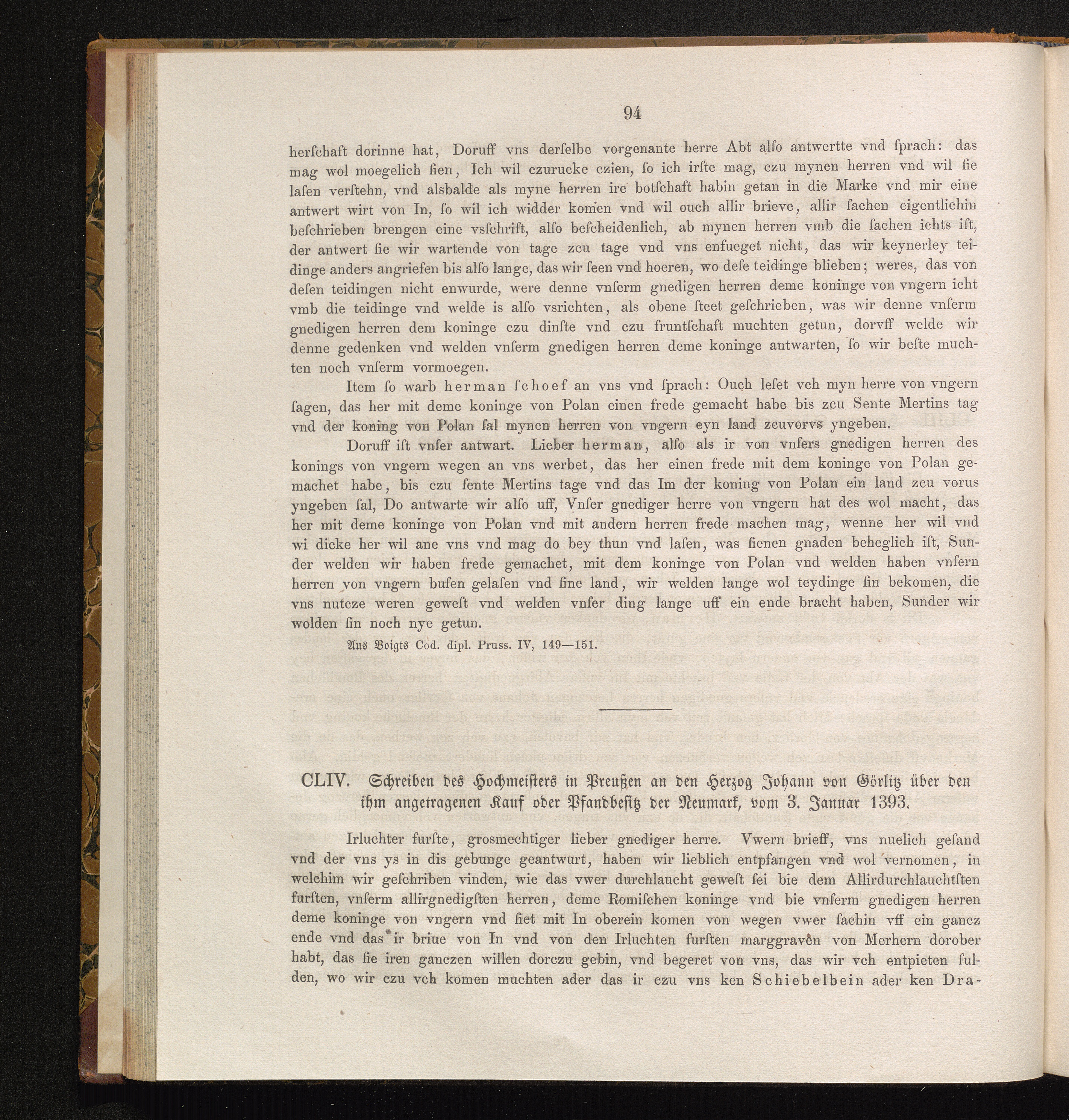 CLIV. Schreiben des Hochmeisters in Preußen an den Herzog Johann von Görlitz über[...]
