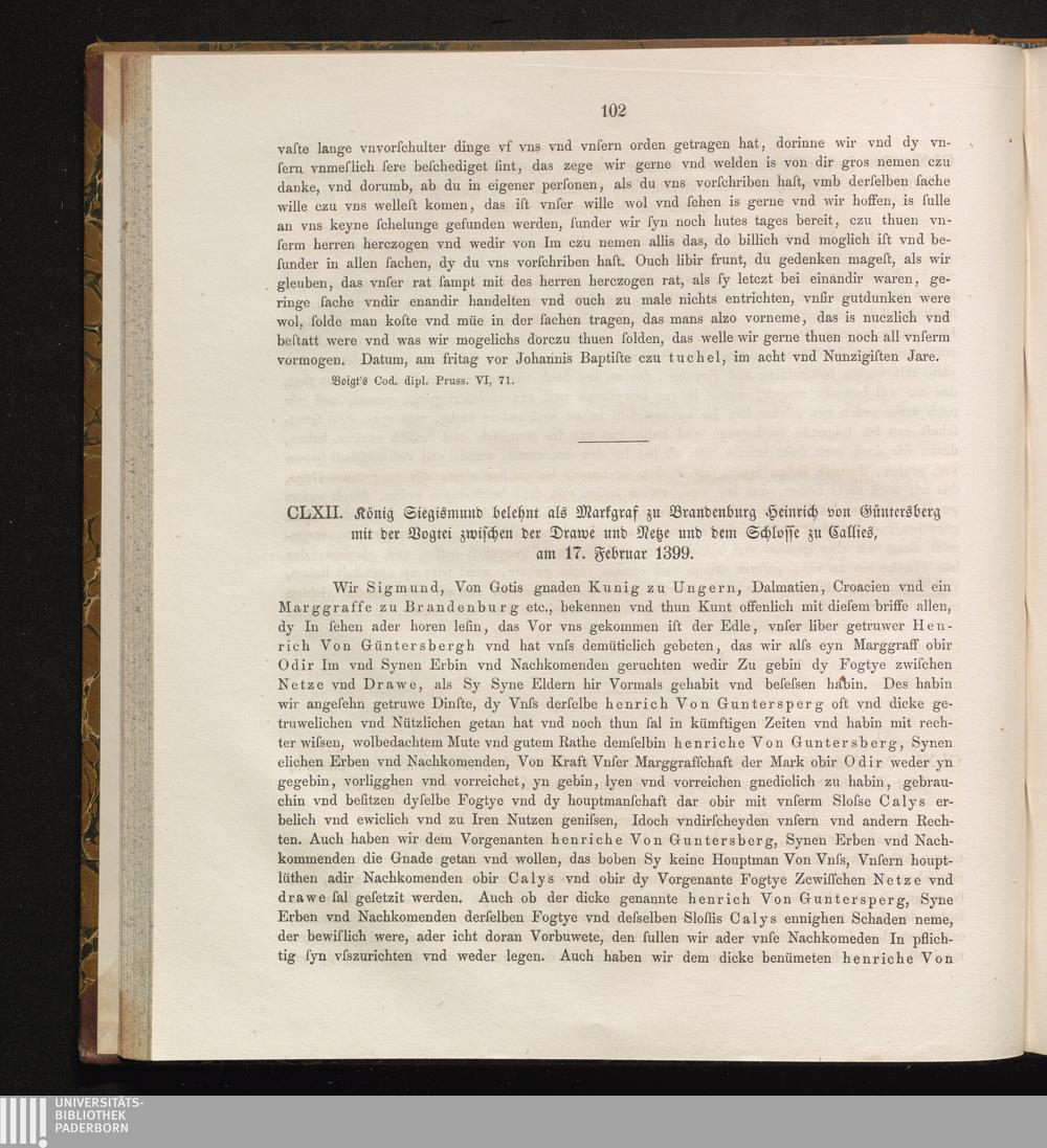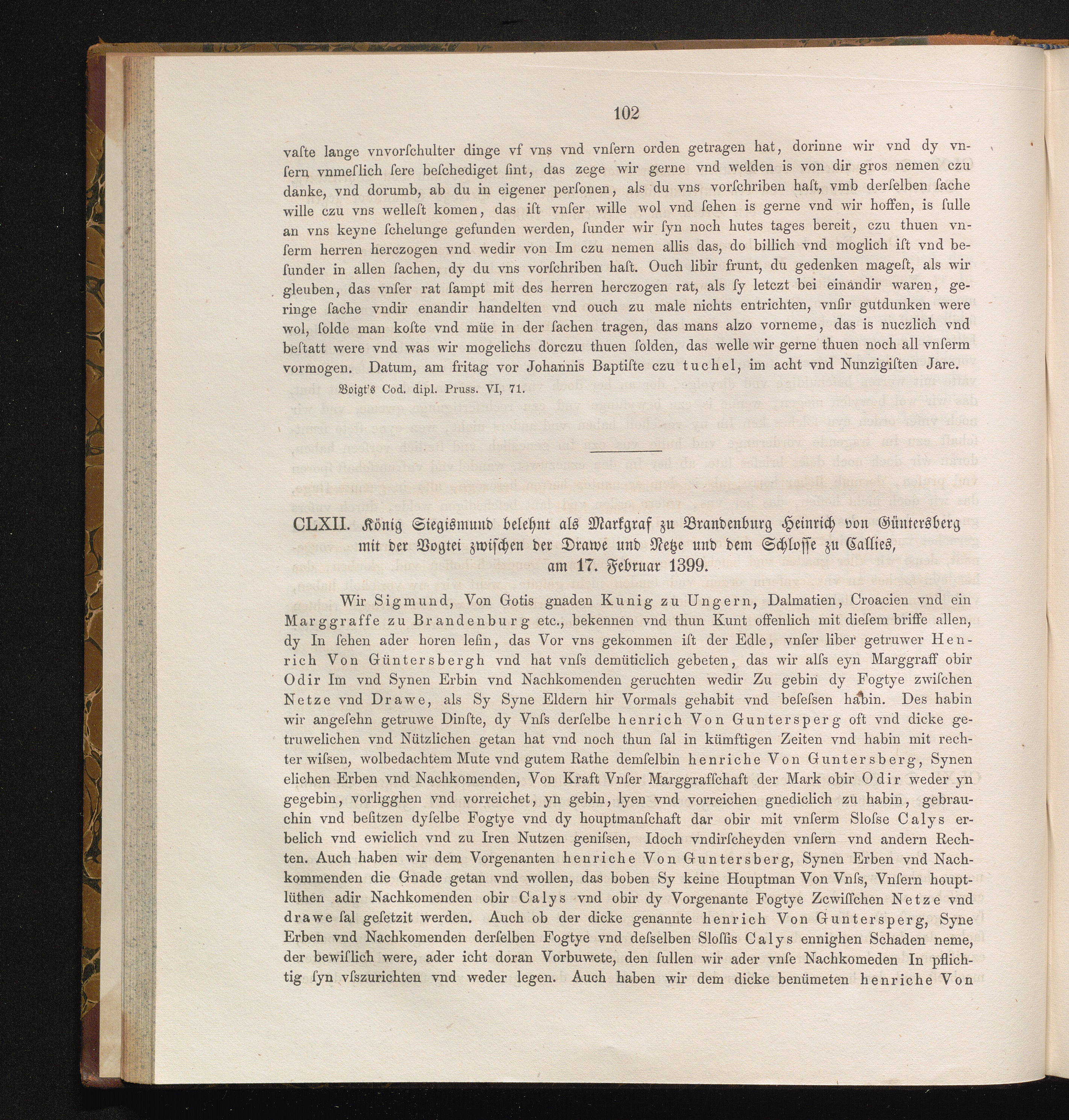 CLXII. König Siegismund belehnt als Markgraf zu Brandenburg Heinrich von Güntersberg[...]