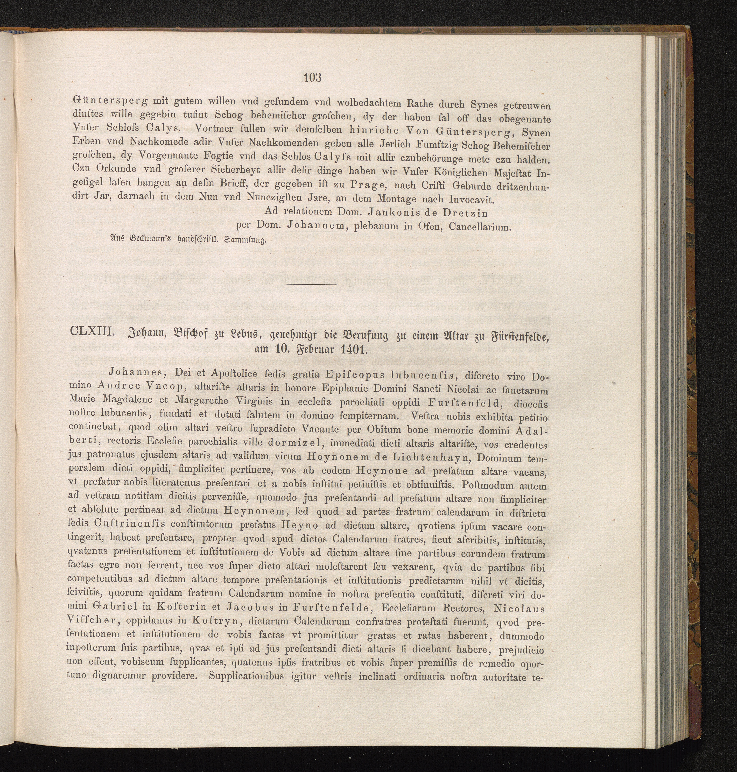 CLXIII. Johann, Bischof zu Lebus, genehmigt die Berufung zu einem Altar zu Fürstenfelde,[...]