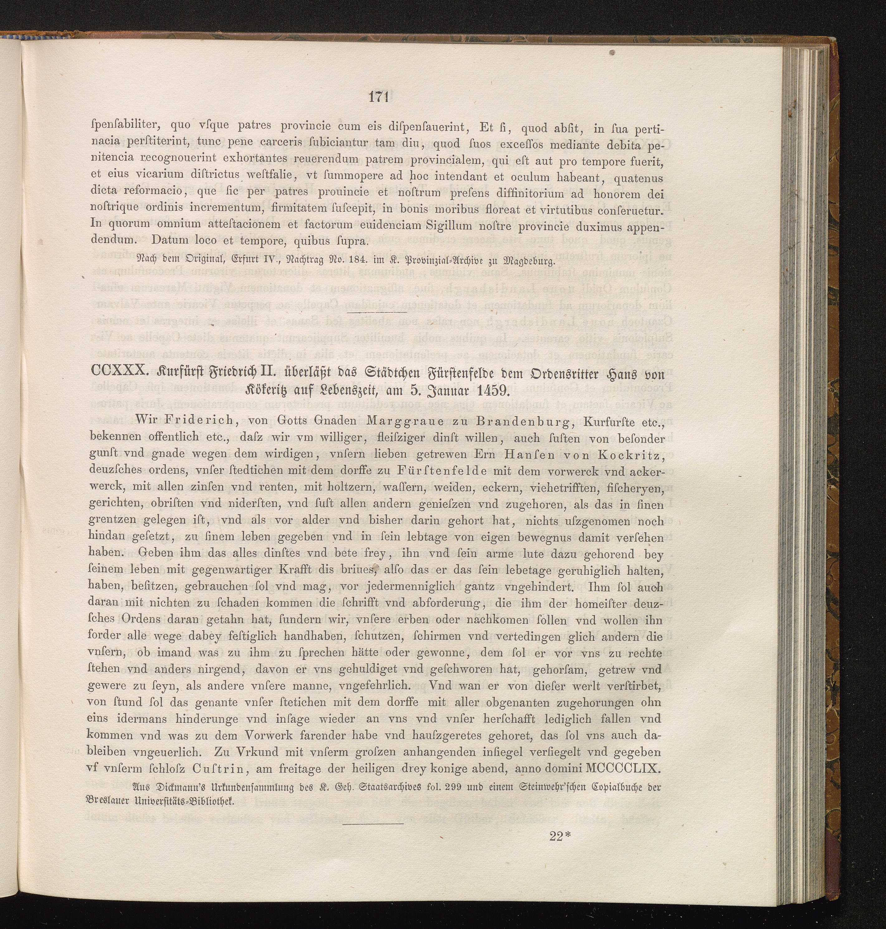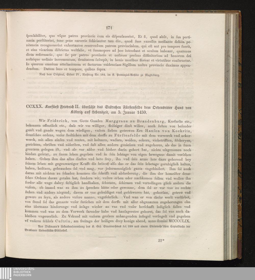 CCXXX. Kurfürst Friedrich II. überläßt das Städtchen Fürstenfelde dem Ordensritter[...]