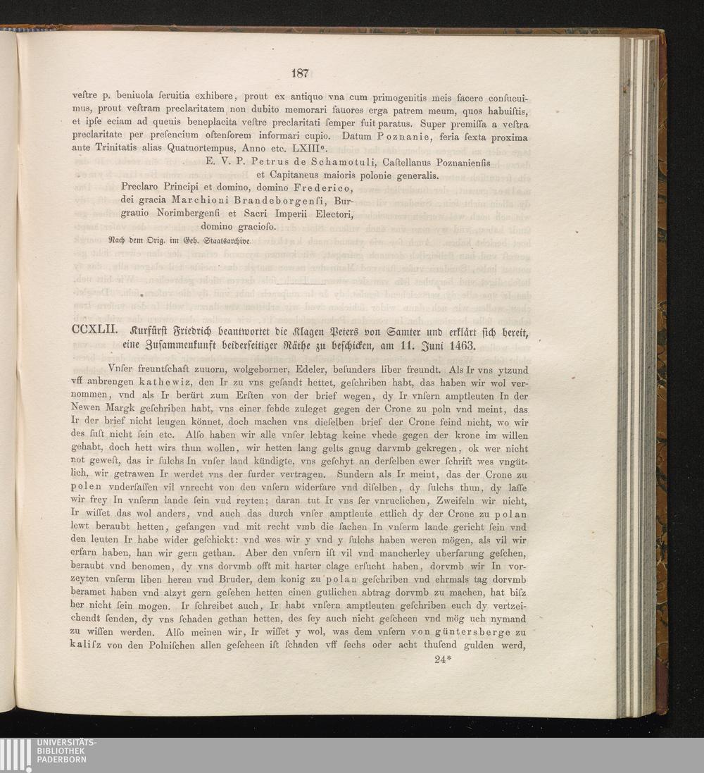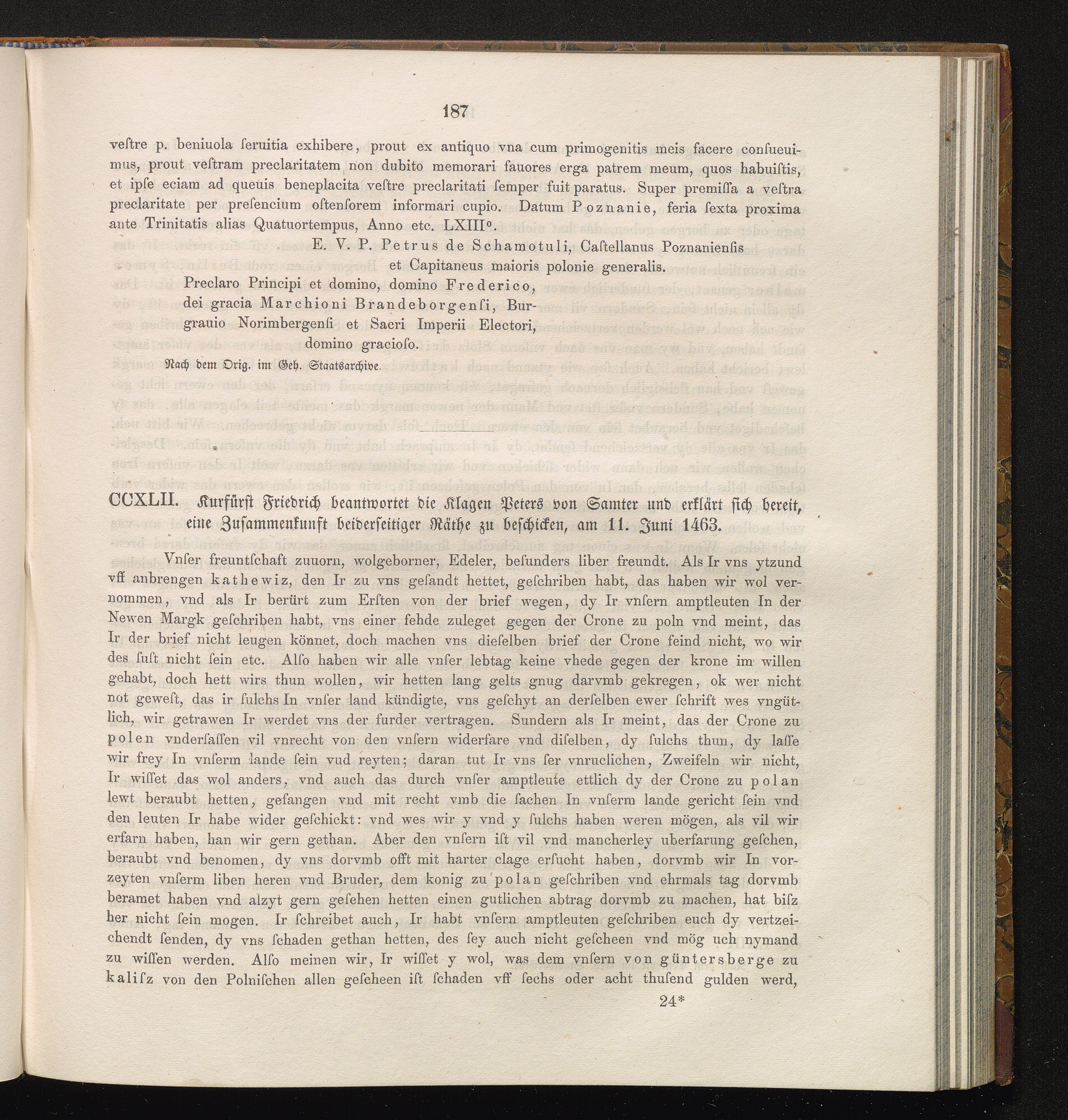 CCXLII. Kurfürst Friedrich beantwortet die Klagen Peters von Samter und erklärt sich[...]